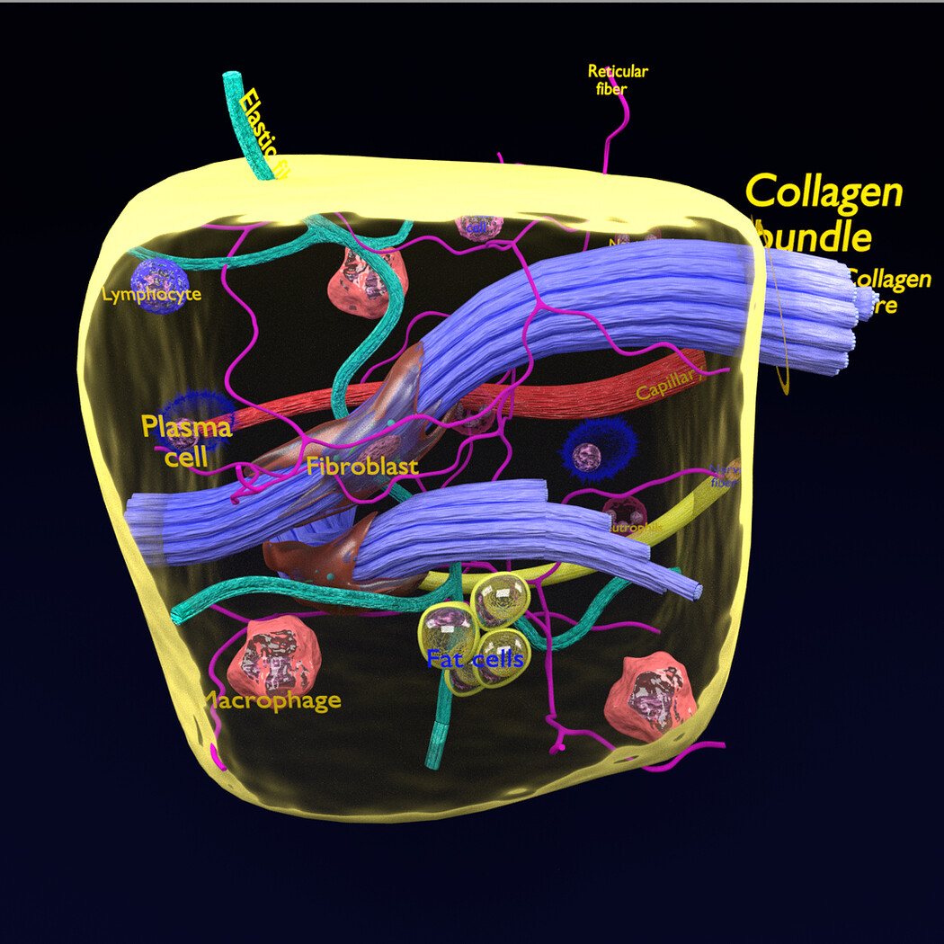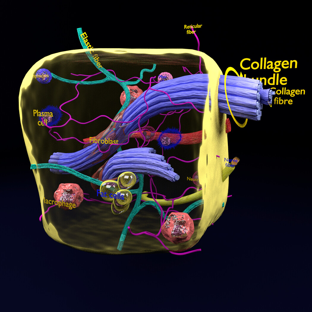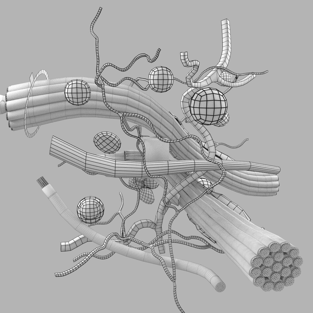 https://youtu.be/i4WGneS6UUQ A blend model of a connective tissue with all its elements neatly labelled. The elements are namely collagen, elastin, reticulin and some cell elements. Both procedural and image textures have been used on non overlapping UVs. The formats USDZ,GLTZ and GLB with applied uv mapped textures have also been included in the downloads.