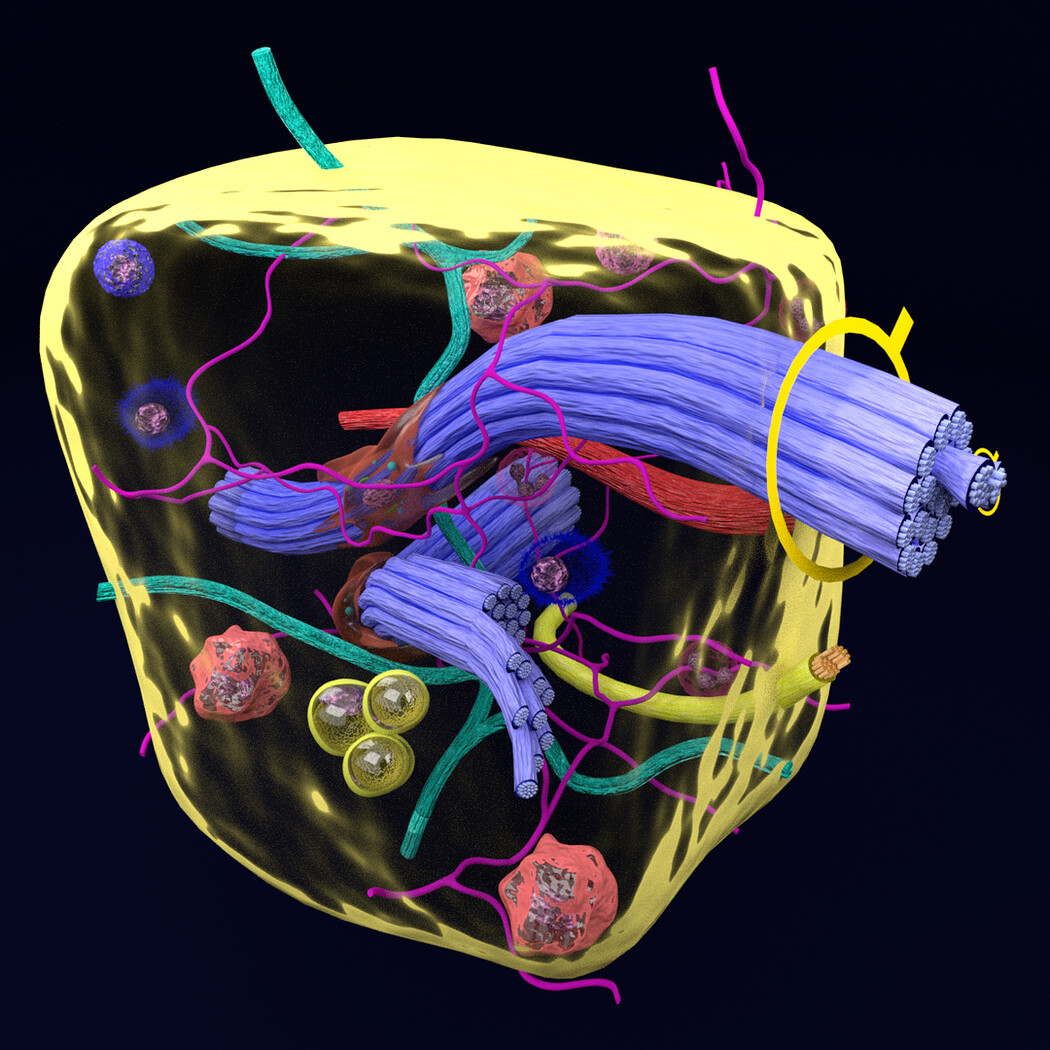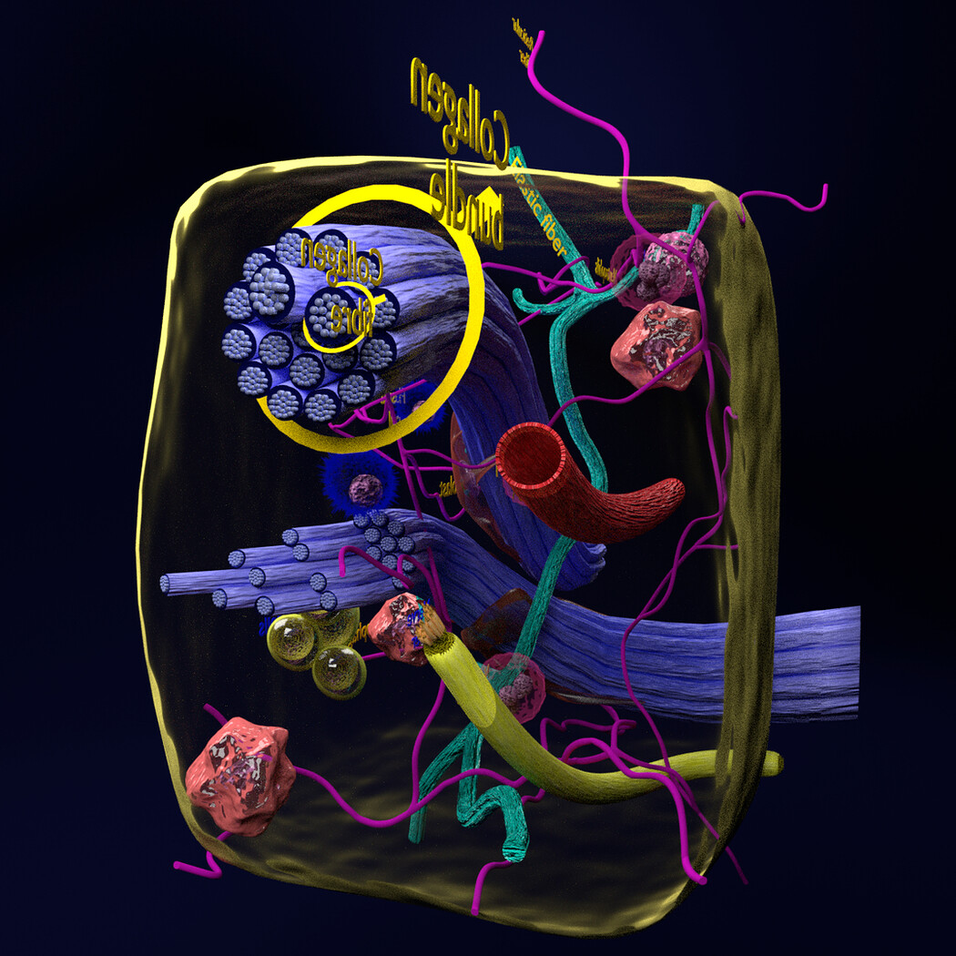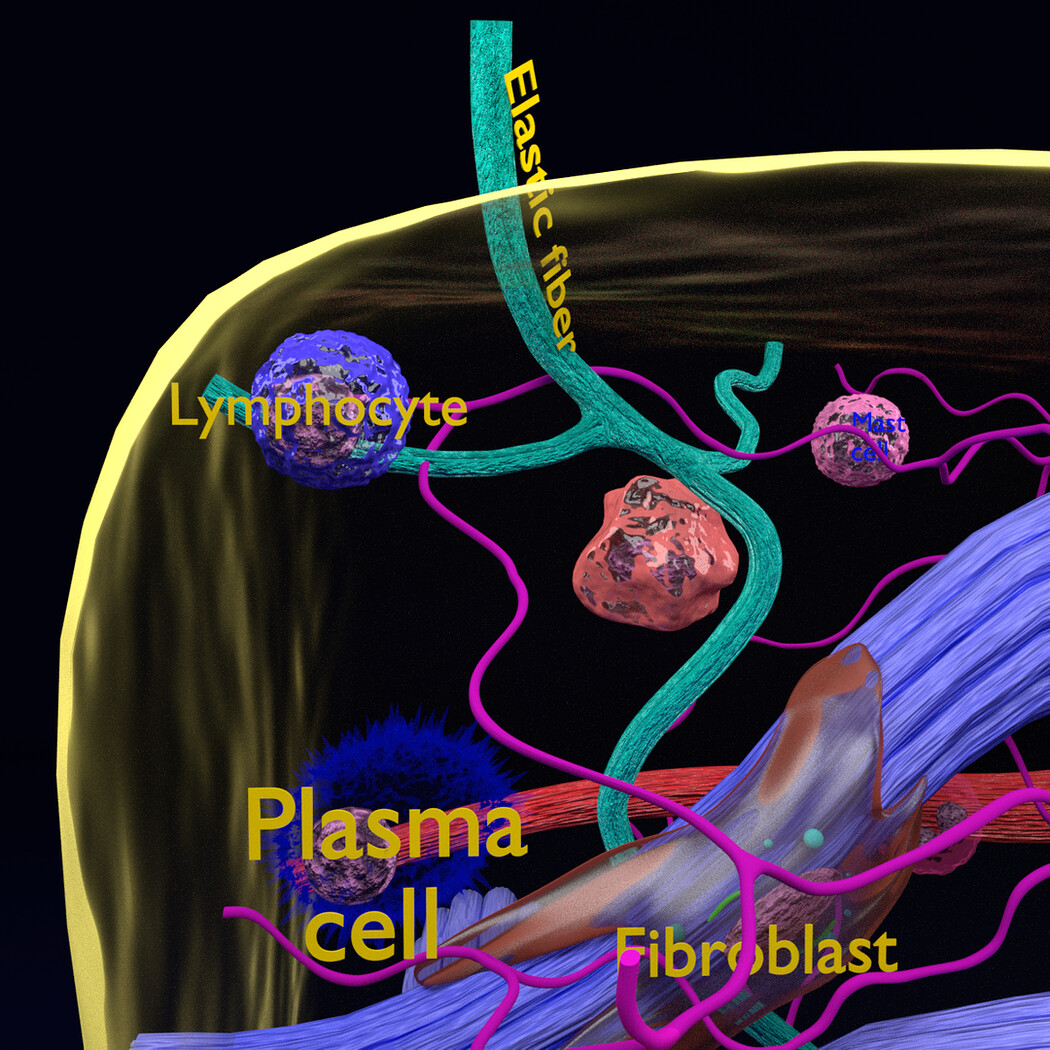 https://youtu.be/i4WGneS6UUQ A blend model of a connective tissue with all its elements neatly labelled. The elements are namely collagen, elastin, reticulin and some cell elements. Both procedural and image textures have been used on non overlapping UVs. The formats USDZ,GLTZ and GLB with applied uv mapped textures have also been included in the downloads.
