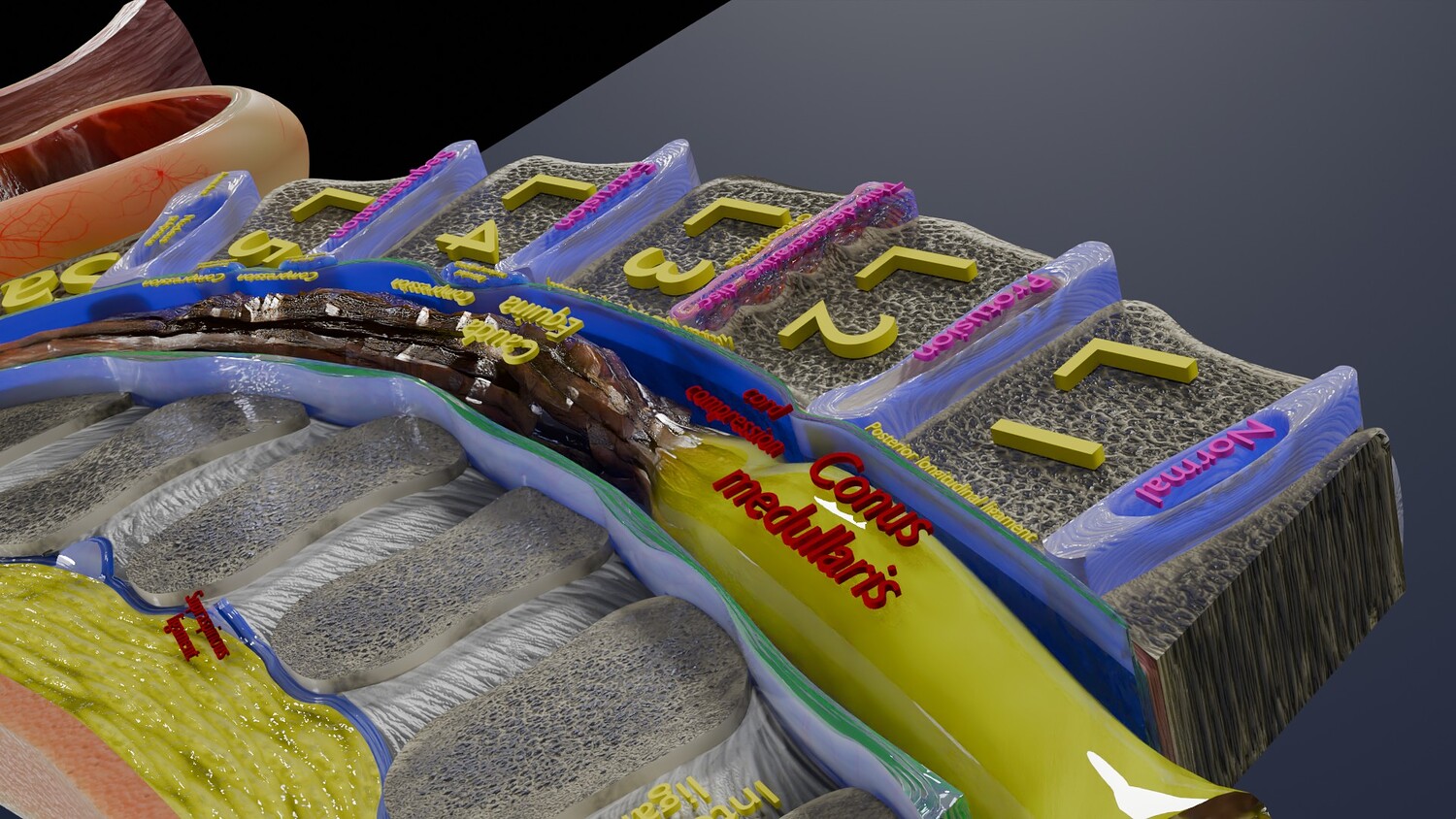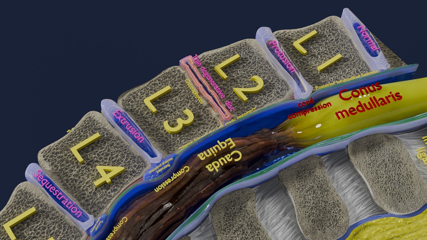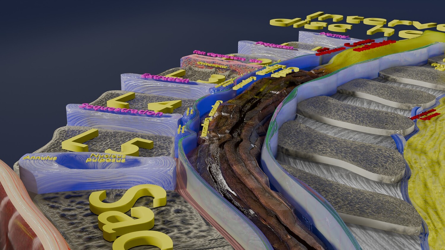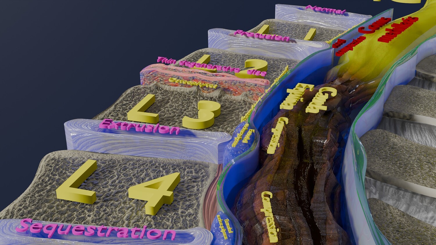 The model shows four Stages of a Herniated Disc, i.e degeneration, protrusion, extrusion and sequestration along with it its effect that is cord compression. The two parts of the i Intervertebral disc that is the nucleus pulposus and the annulus parts are nicely delineated in different injuries of Intervertebral disc. Excellent model for teaching, demonstration and knowledge of biology. The models include both procedural and image textures .blend files separately. The texture file includes diffuse, roughness, normal and metal png and jpeg based on non-overlapping UV maps. Besides the procedural and image texture based blender model files, the formats 3mf, ply, obj, fbx,, GLTZ & GLB with applied uv mapped textures have also been included in the downloads along with stl. I have included the various formats needed by various customer for the various 3d modelling software they may be using. The following formats are compressed in rar formats:- 1. blend 2. 3mf 3. stl 4. obj 5. fbx 6. glb 7. gltz 8. ply 9. textures
