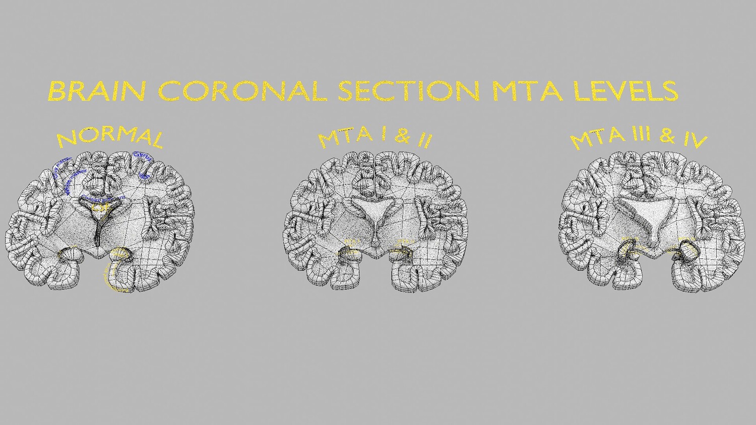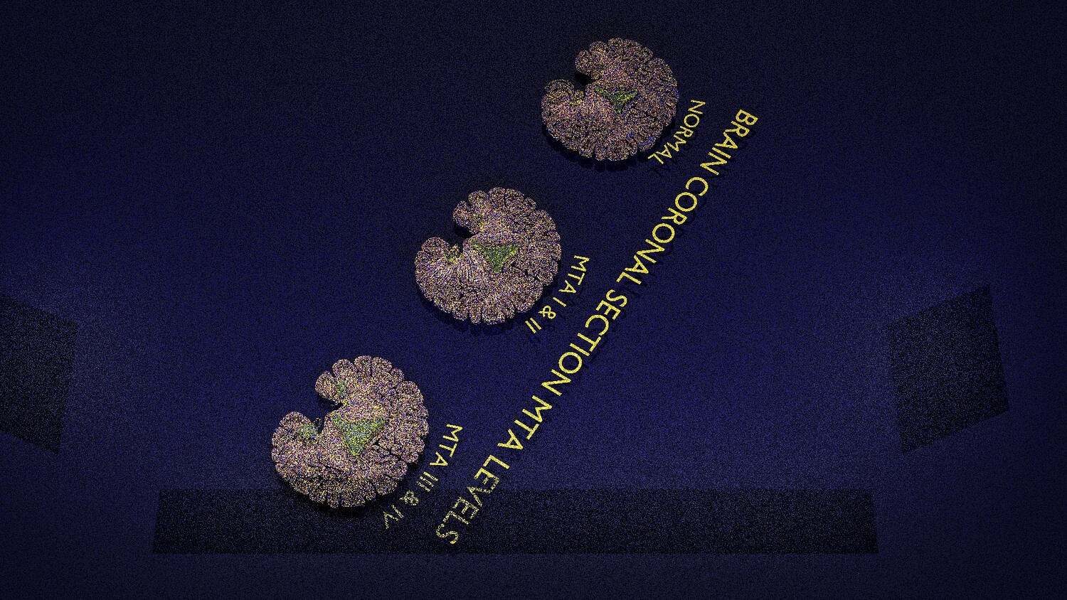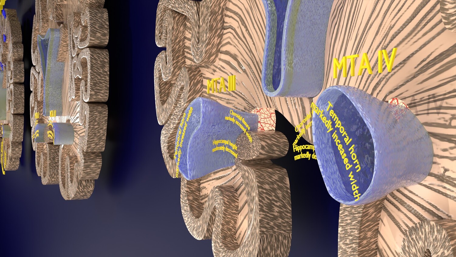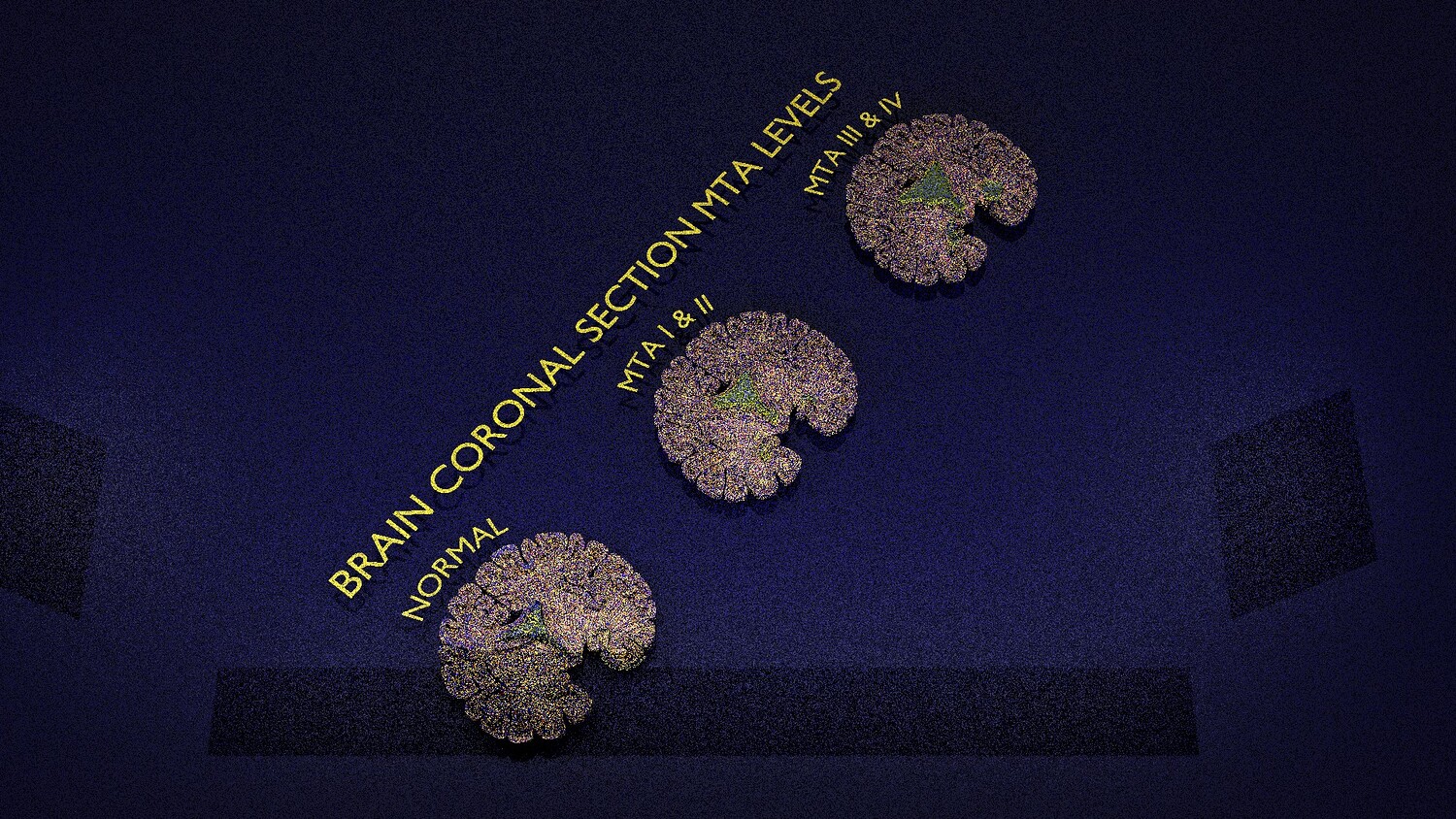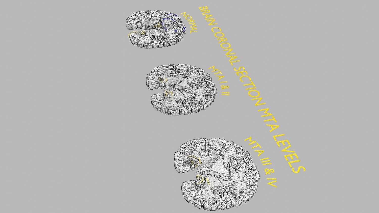 The model mesh includes coronal sectional model of brain schematically depicting the Hippocampus atrophy levels MTA (mesiotemporal atrophy) 1-4. Score 0 indicates no atrophy, score 1 indicates widening of the choroidal fissure, score 2 includes additional widening of the temporal horn of the lateral ventricle and slightly decreased hippocampal formation height, score 3 includes moderate loss of hippocampal formation volume, and 4 indicates an increase in all of these findings in the final stage. Excellent model for teaching, demonstration and knowledge of medical science. The models include image textures .blend file. The texture file includes diffuse, roughness, and normal png and jpeg based on non-overlapping UV maps. Besides the procedural and image texture based blender model files, the formats 3mf, ply, obj, fbx,, GLTZ & GLB with applied uv mapped textures have also been included in the downloads along with stl. I have included the various formats needed by various customer for the various 3d modelling software they may be using. The following formats are compressed in rar formats:- 1. blend 2. 3mf 3. stl 4. obj 5. fbx 6. glb 7. gltz 8. ply 9. textures