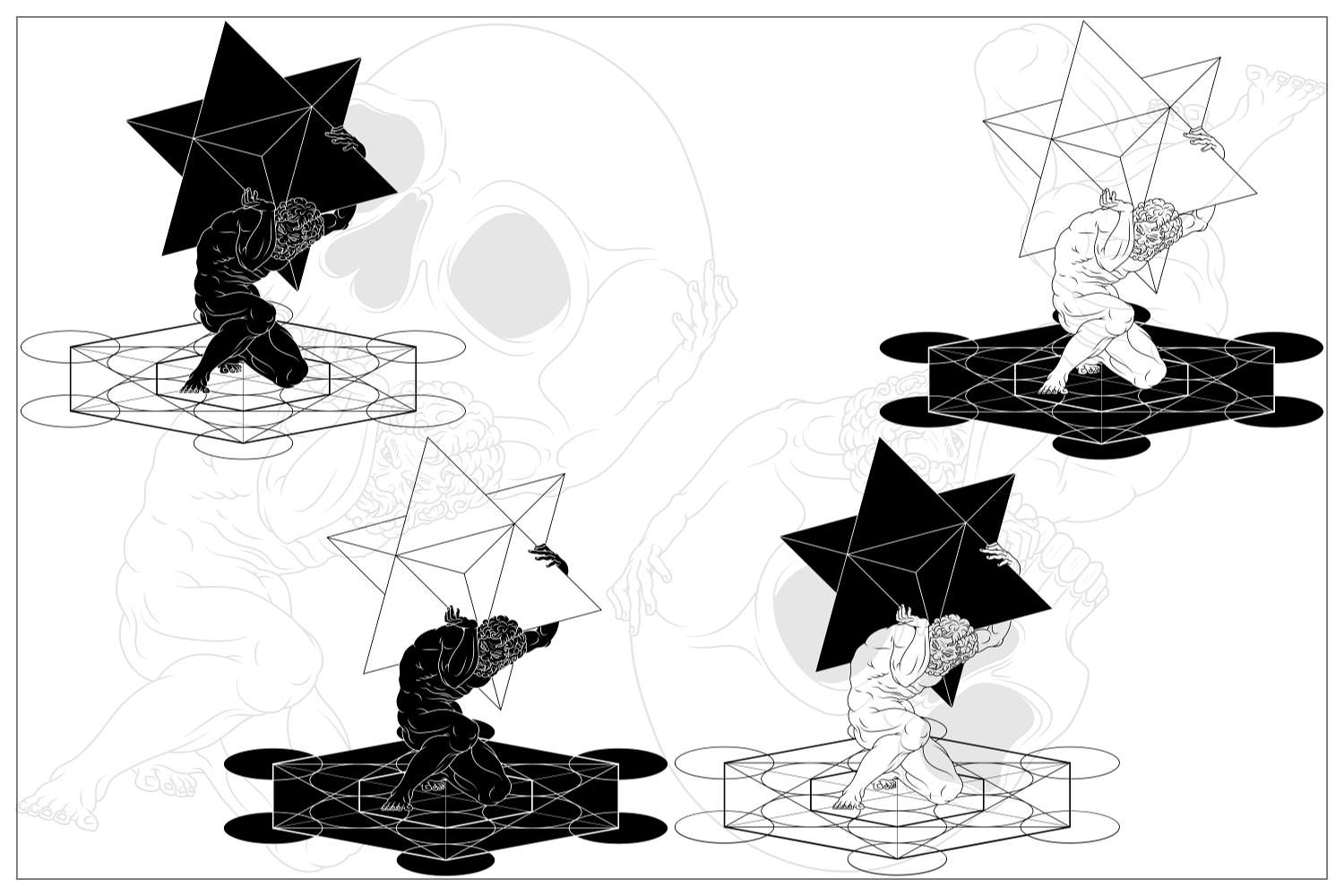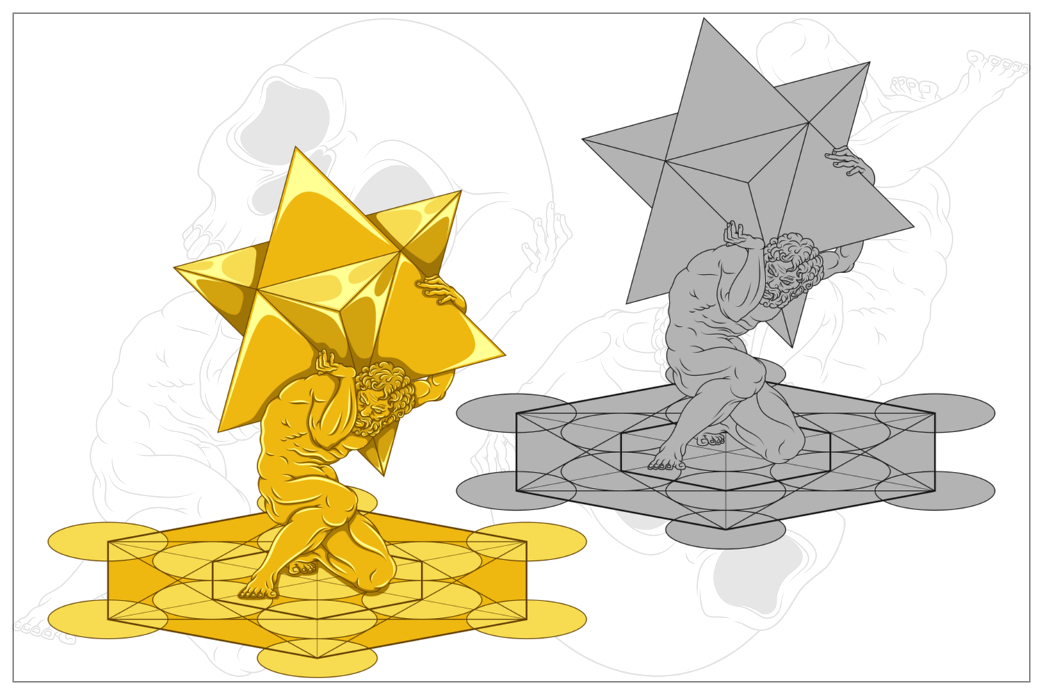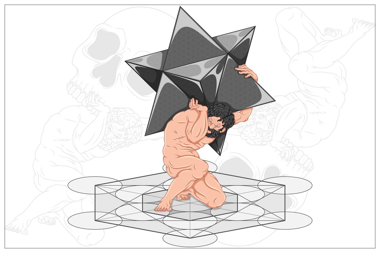 Vector design of the Titan Atlas holding a Halloween skull. The Titan from Greek mythology with a merkaba and the Metatron symbol.