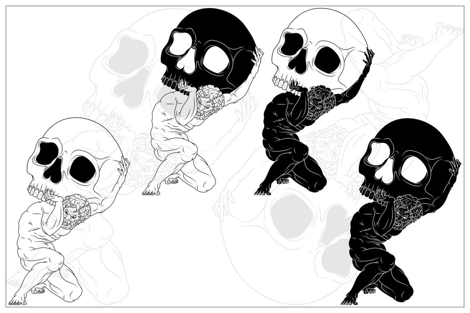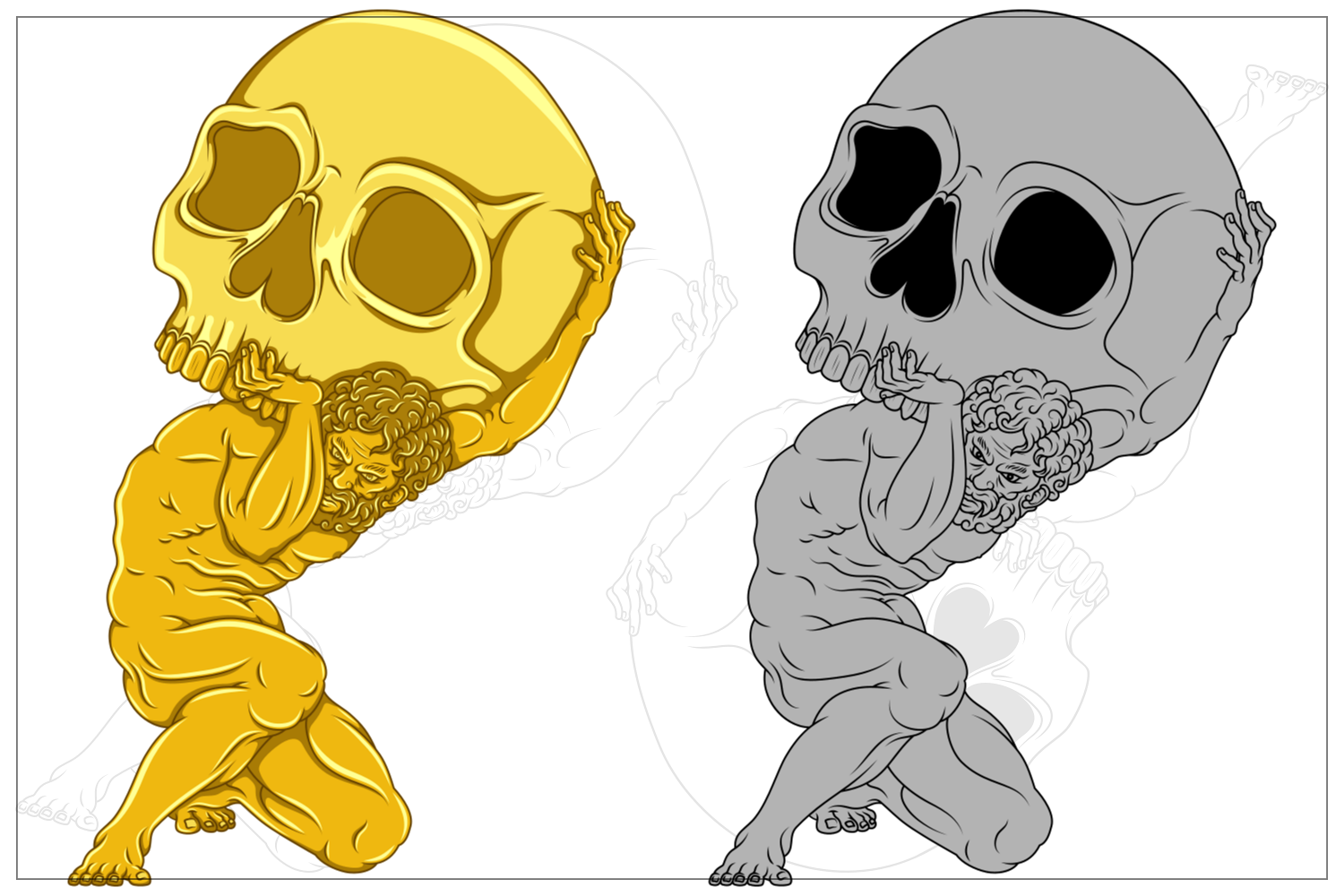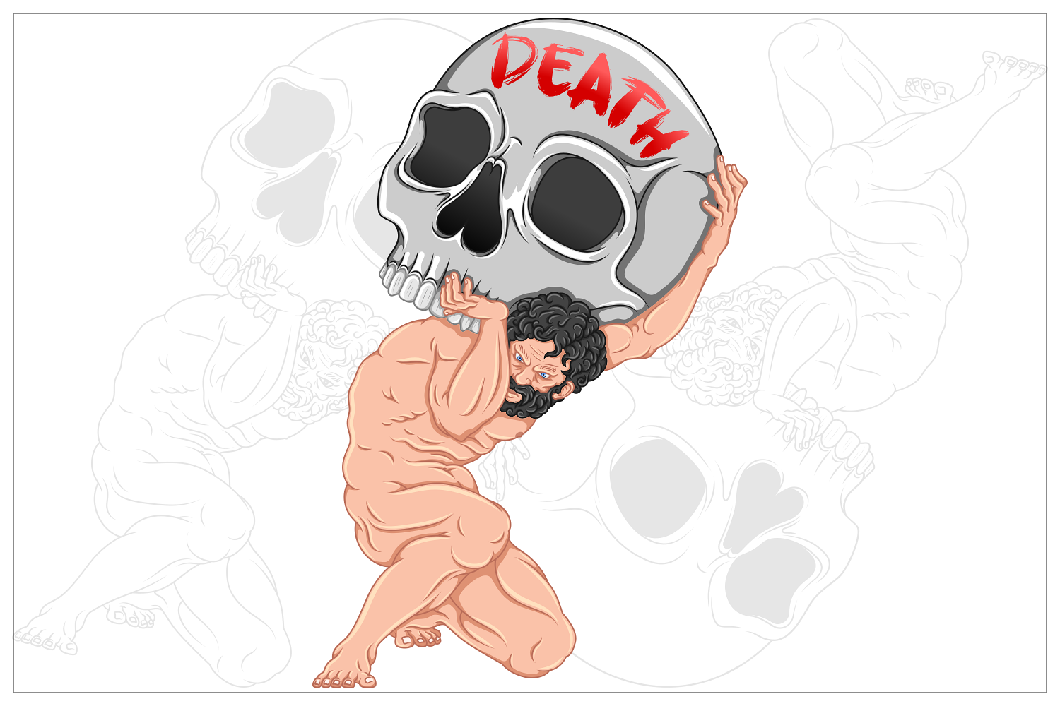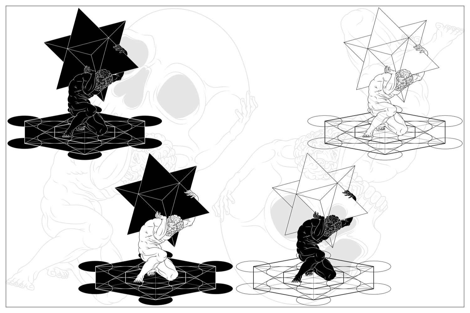 Vector design of the Titan Atlas holding a Halloween skull. The Titan from Greek mythology with a merkaba and the Metatron symbol.