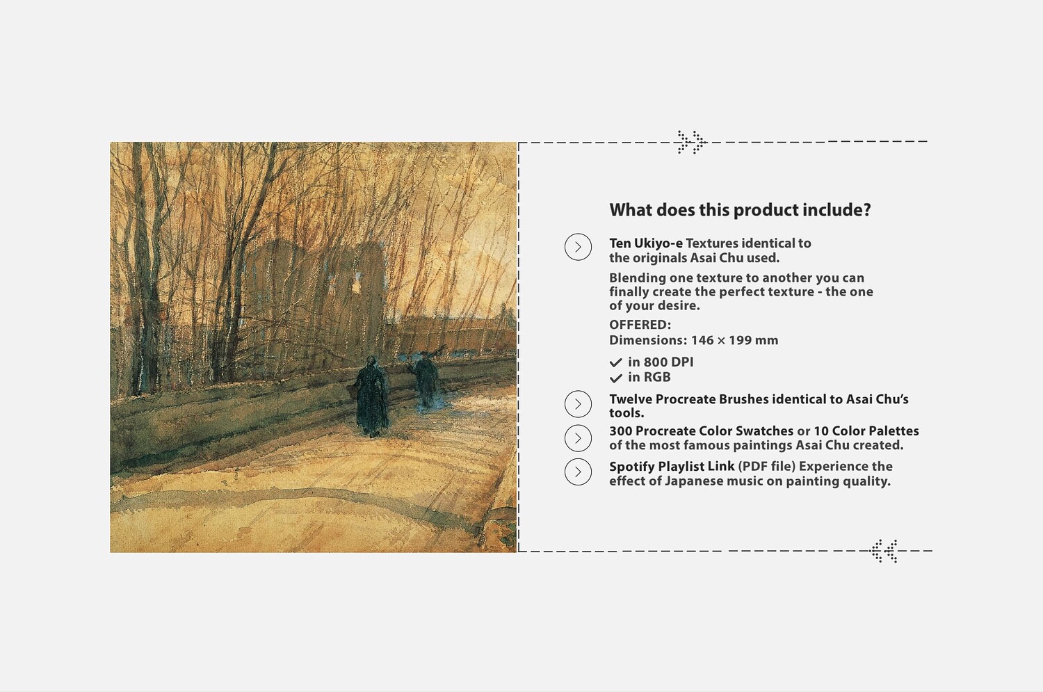 INCLUDED: - 300 Procreate Color Swatches - 12 Procreate Brushes (.brush & .brushset) - 10 Ukiyo-e Textures (.PNG files) inspired by the original textures Asai Chu used. - Dimensions: 146 x 199 mm - in 800 DPI - in RGB - Spotify Playlist Link - Experience the effect of Japanese music on painting quality - Free Support 24/7
