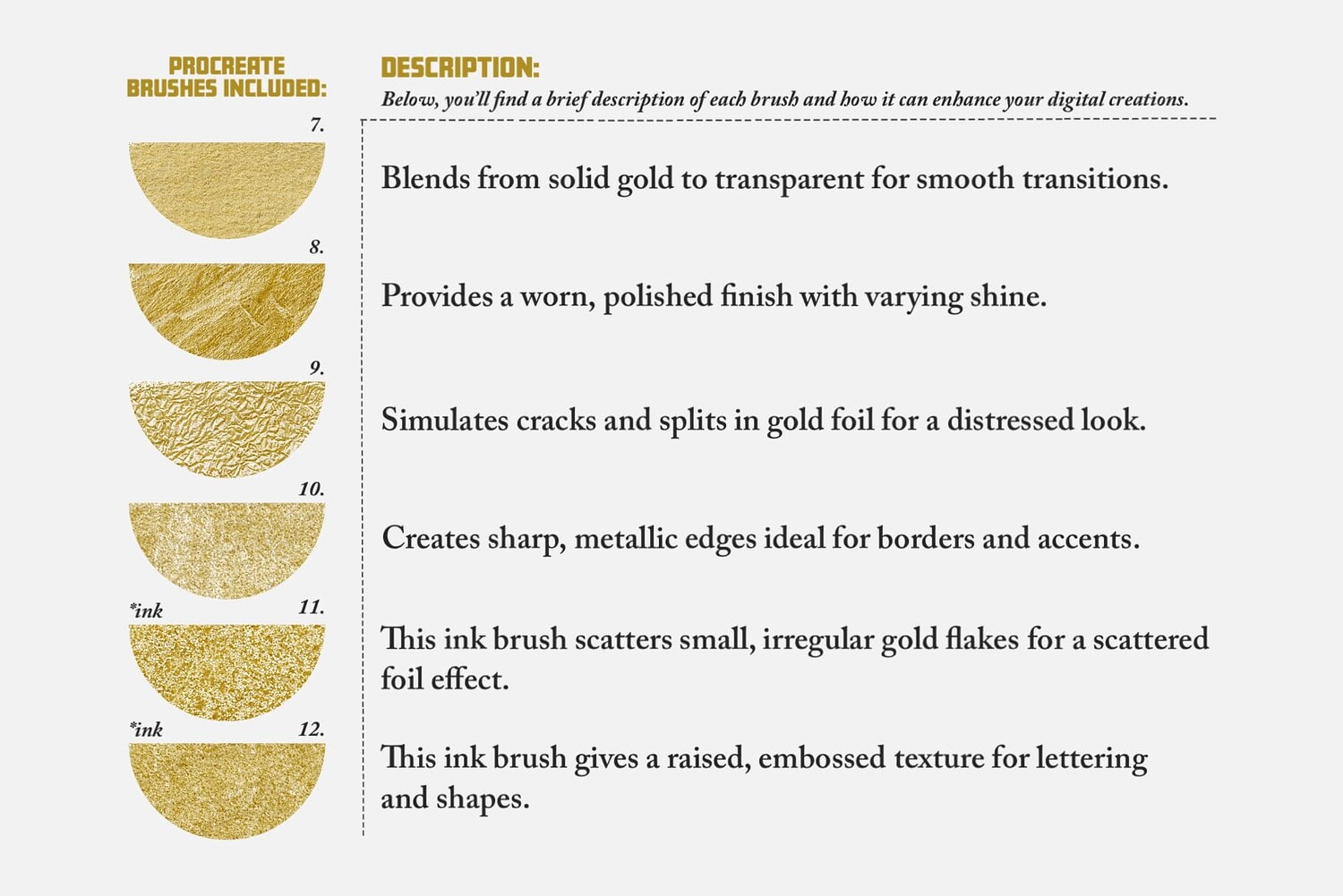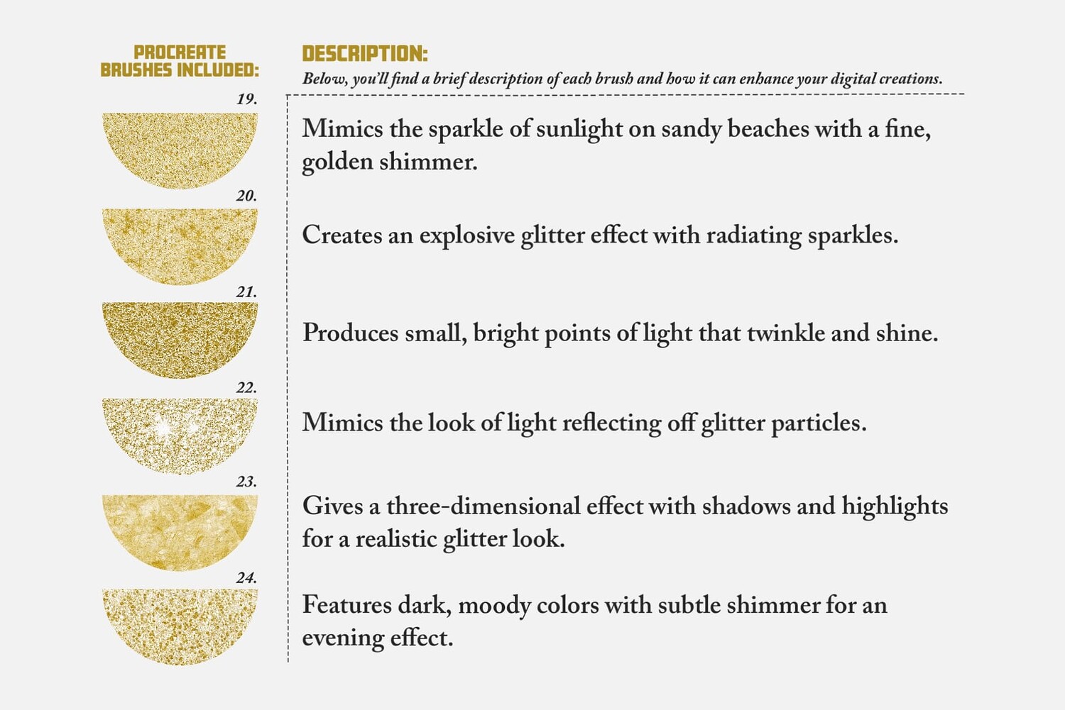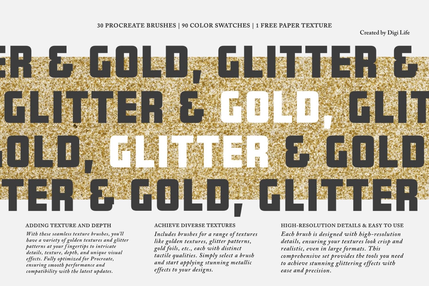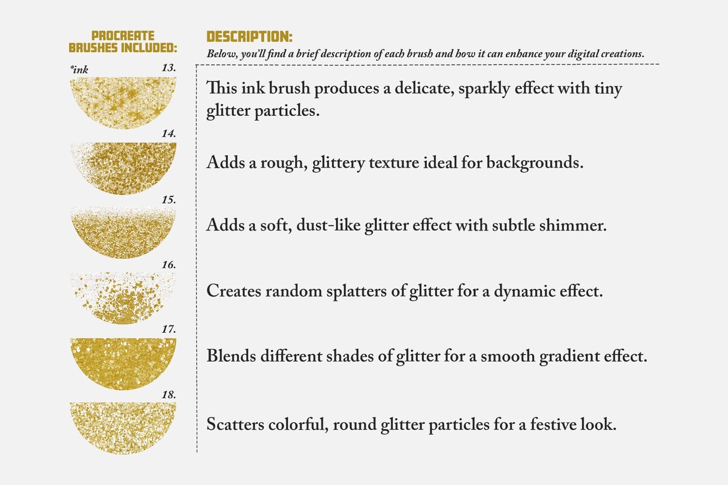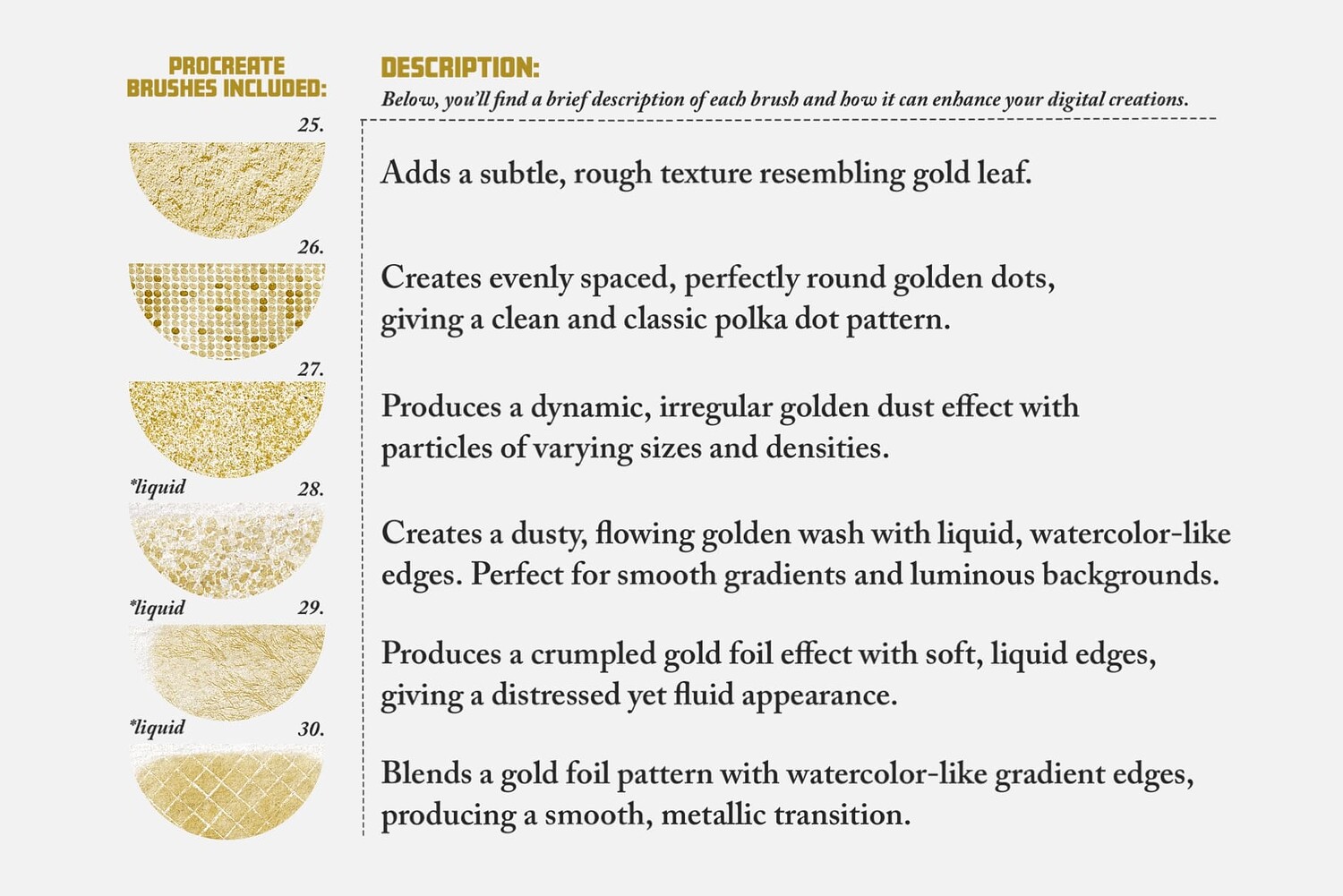 Offering thirty procreate brushes, ninety color swatches and one paper texture, we bring you a versatile toolkit designed to elevate your digital creations with golden and glitter-inspired textures.