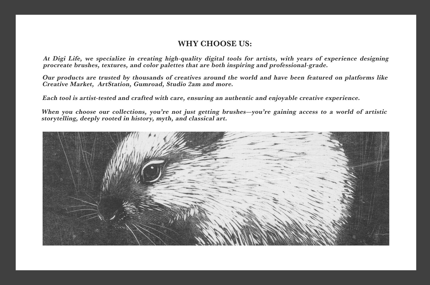 IMPORTANT: These brushes are compatible only with Procreate for iPad. They won't work in Photoshop or other painting programs.