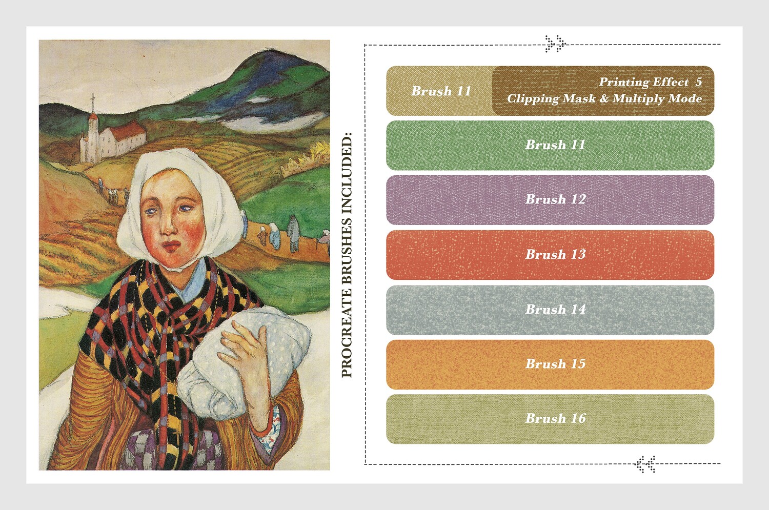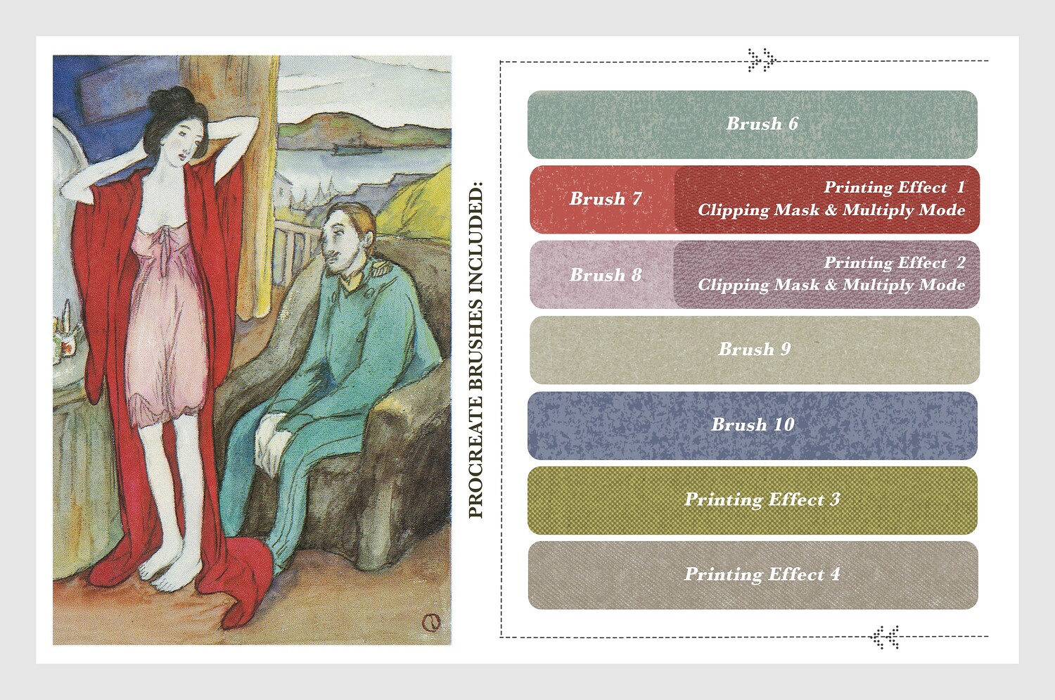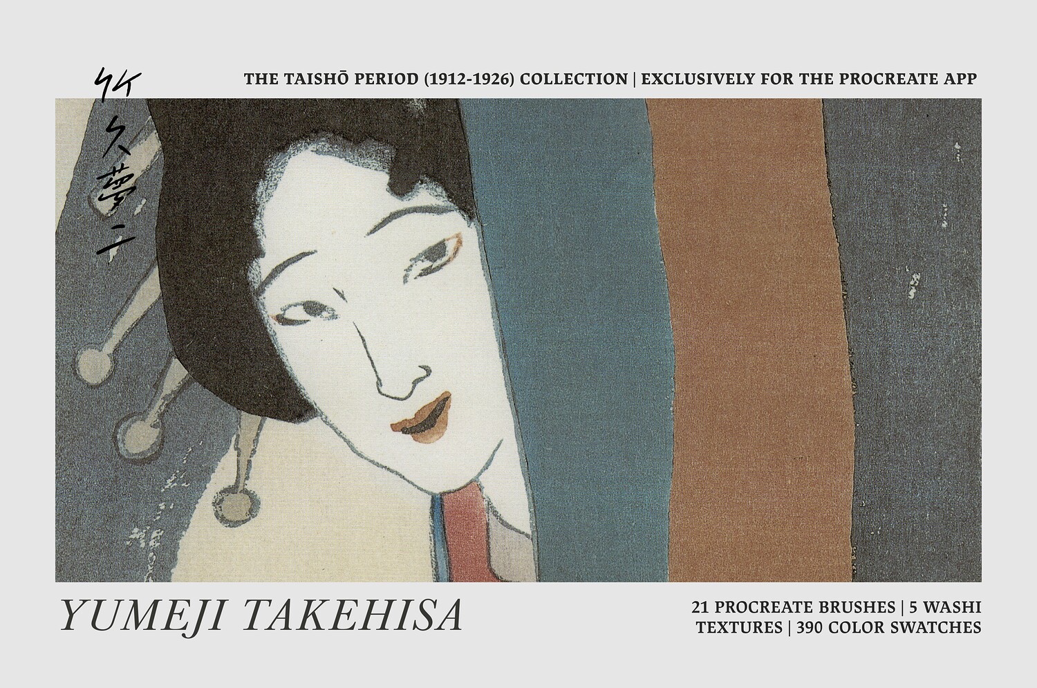 The fifth product in the series is dedicated to Yumeji Takehisa, a visionary artist whose work captures the romantic melancholy and modern elegance of the Taishō era. His flowing lines, stylized figures, and poetic sense of atmosphere inspired these digital tools, allowing you to explore his delicate, expressive, and emotionally rich style directly on your iPad.