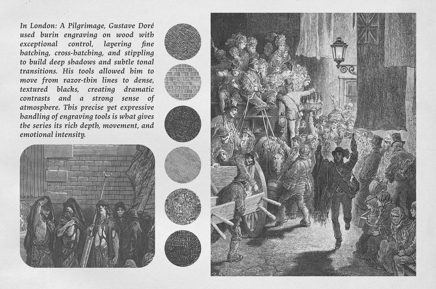 The sixth product in the series is dedicated to Gustave Doré and his iconic illustrated work London: A Pilgrimage. Renowned for his dramatic compositions, dense cross-hatching, and powerful use of light and shadow, Doré captured the atmosphere and social contrasts of 19th-century London with remarkable intensity.
