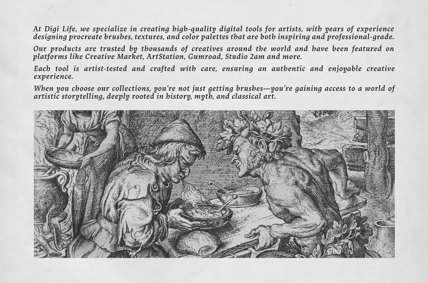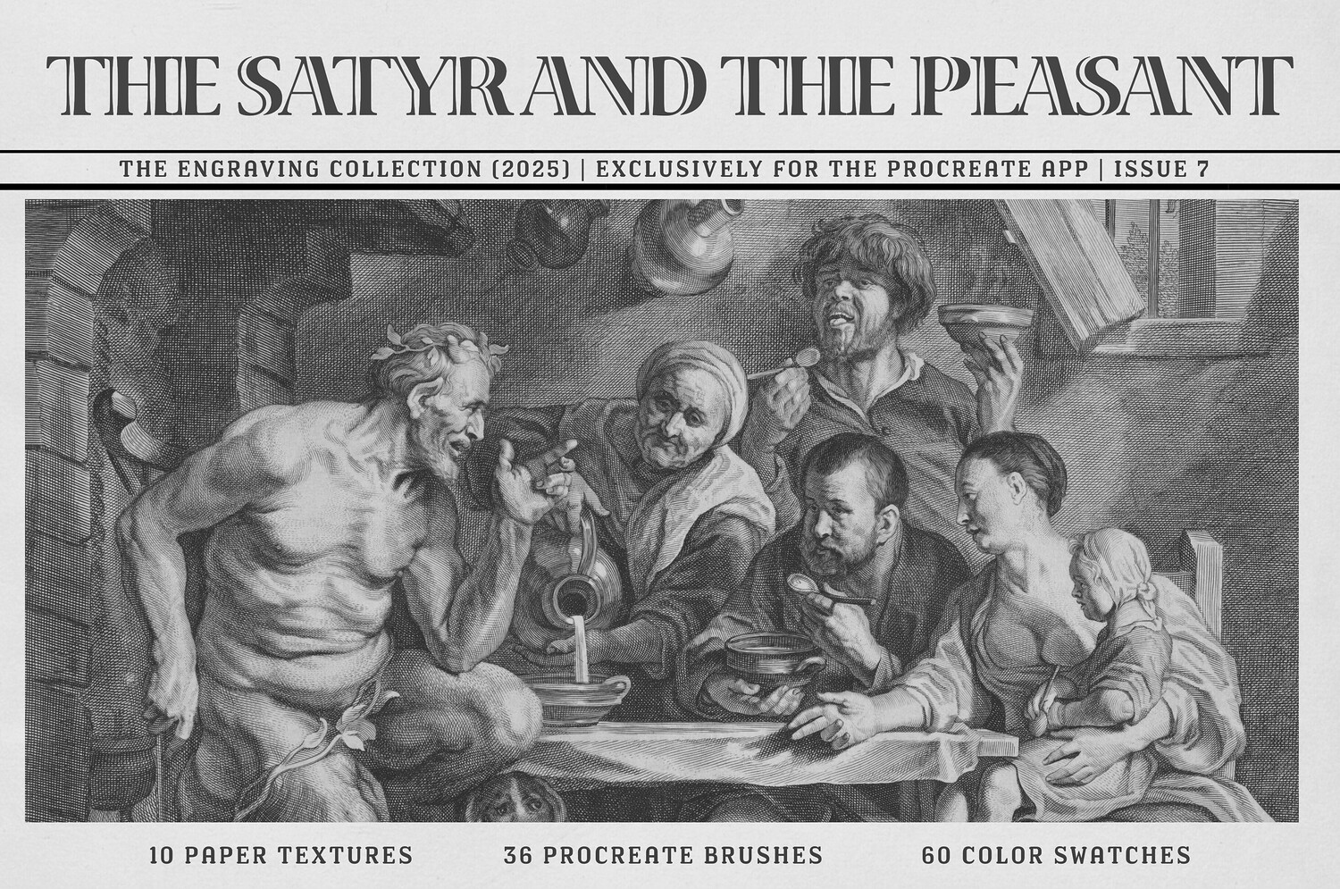 The seventh product in the series is inspired by The Satyr and the Peasant, a timeless allegorical scene depicted by artists such as Jacob Jordaens. This story explores themes of duality, honesty, and human nature, often shown through expressive figures and dynamic compositions. The rich textures, bold linework, and narrative depth found in these engravings have guided the creation of these digital tools, bringing the character and atmosphere of classical storytelling into your Procreate canvas.