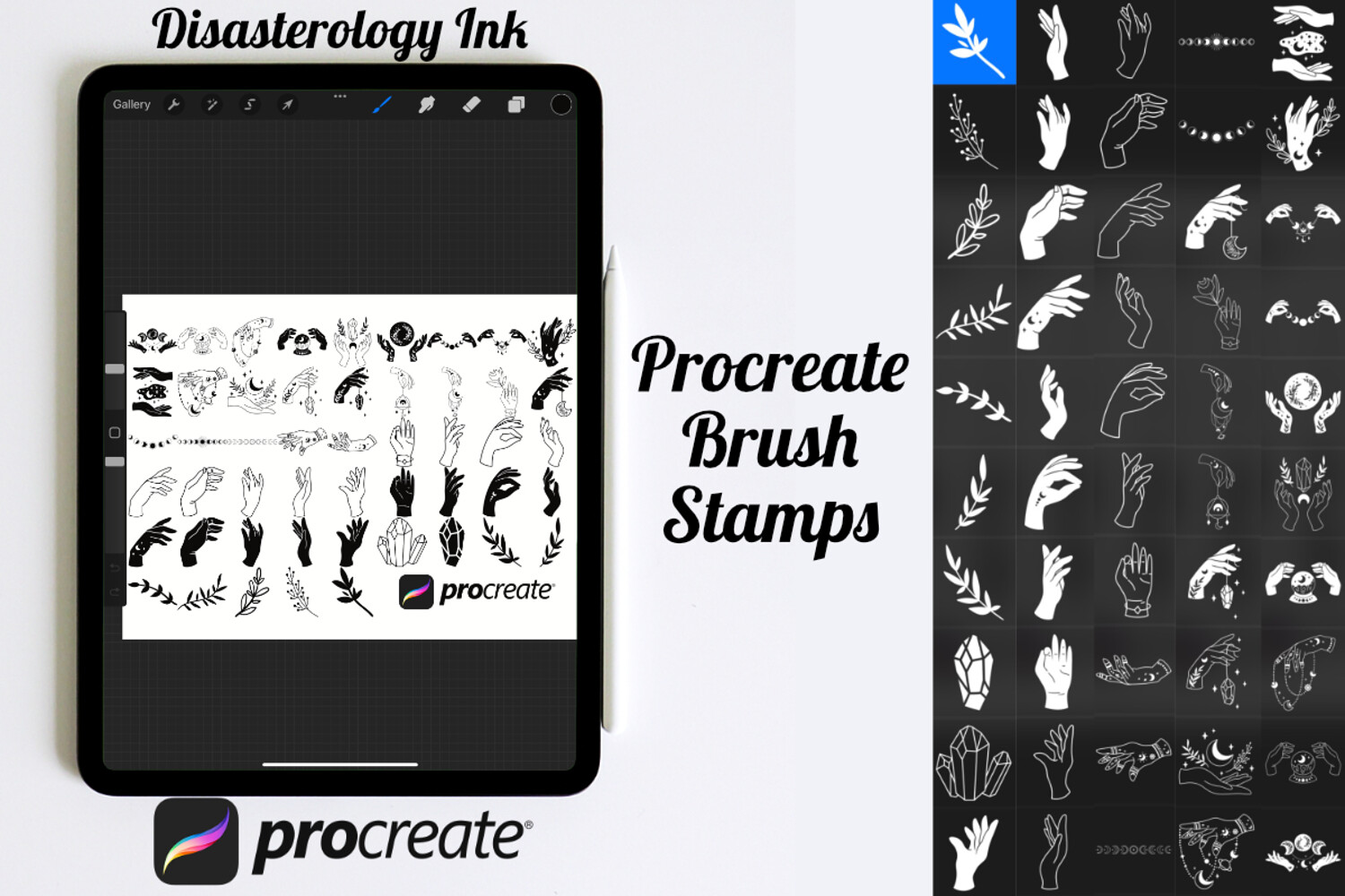 Pack of 50 Witchy Hand Procreate Stamp Brushes! These witch hand stamps are perfect for making illustration projects or any procreate purpose. You can use these in any colour or opacity and they can be resized to best fit your art. You need Procreate 5.0.8 or 5X, an iPad, and an Apple Pencil. Also, these stamp brushes are not pressure sensitive and can be used with third party stylus, Apple Pencil or even your finger. You can change the colour, size and opacity of these stamps.
