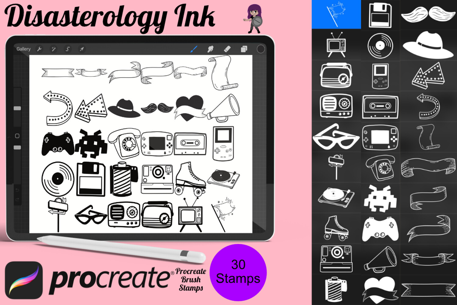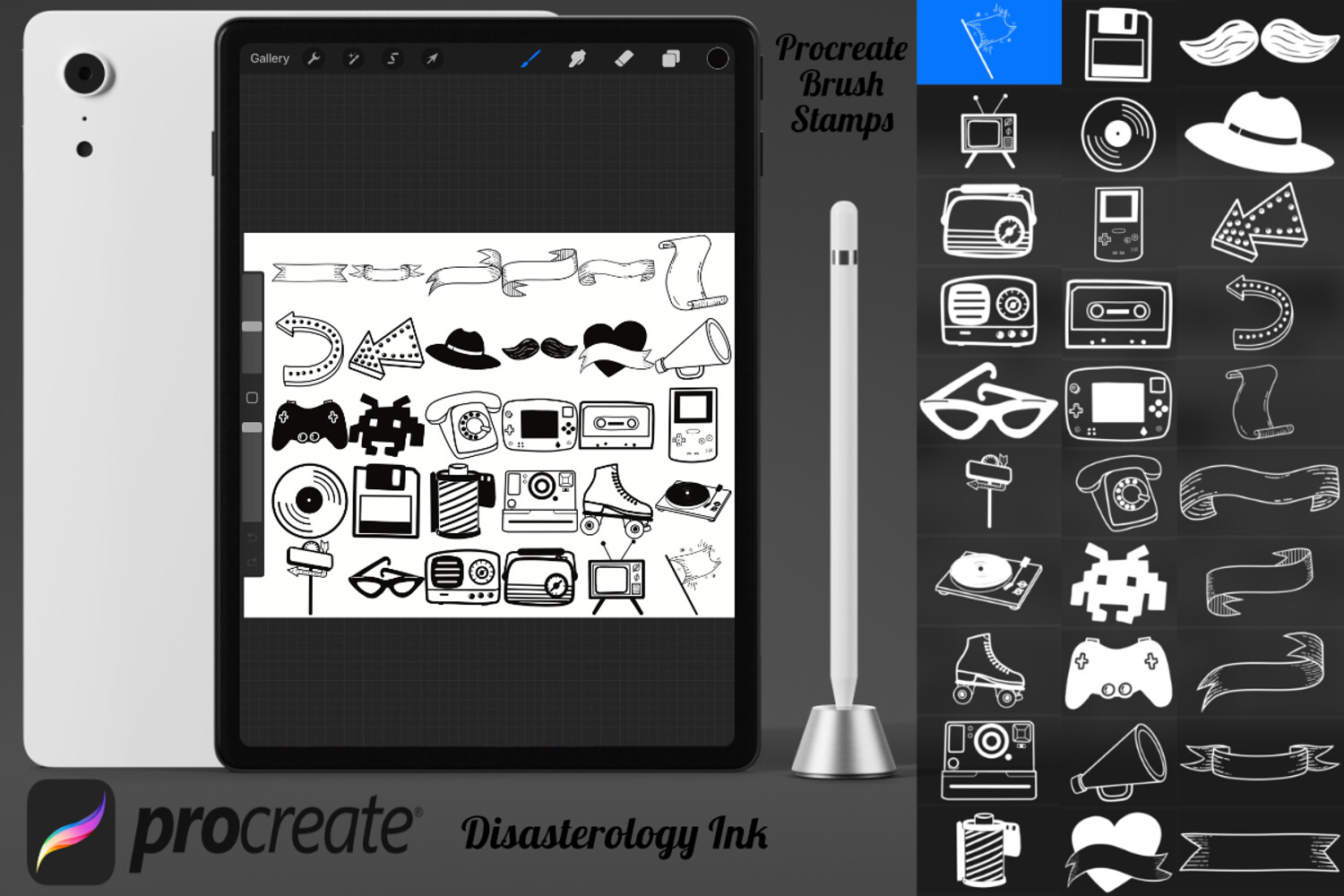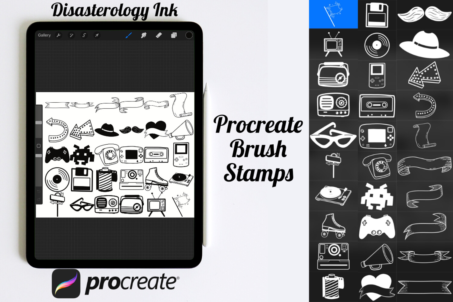 Pack of 30 Retro Elements Procreate Stamp Brushes! These retro icon stamps are perfect for making illustration projects or any procreate purpose. You can use these in any colour or opacity and they can be resized to best fit your art. You need Procreate 5.0.8 or 5X, an iPad, and an Apple Pencil. Also, these stamp brushes are not pressure sensitive and can be used with third party stylus, Apple Pencil or even your finger. You can change the colour, size and opacity of these stamps.