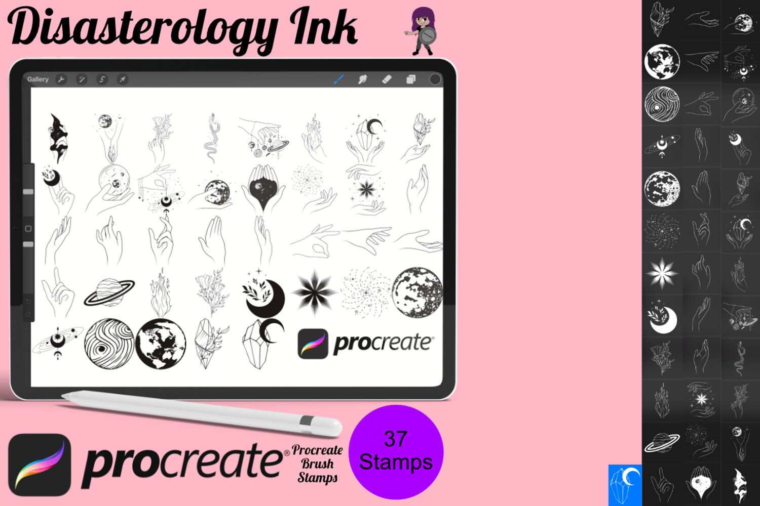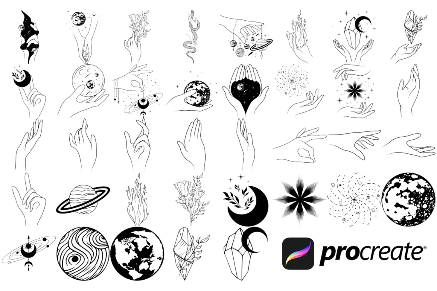 Pack of 37 Celestial Hand Procreate Stamp Brushes! These hand stamps are perfect for making illustration projects or any procreate purpose. You can use these in any colour or opacity and they can be resized to best fit your art. You need Procreate 5.0.8 or 5X, an iPad, and an Apple Pencil. Also, these stamp brushes are not pressure sensitive and can be used with third party stylus, Apple Pencil or even your finger. You can change the colour, size and opacity of these stamps.