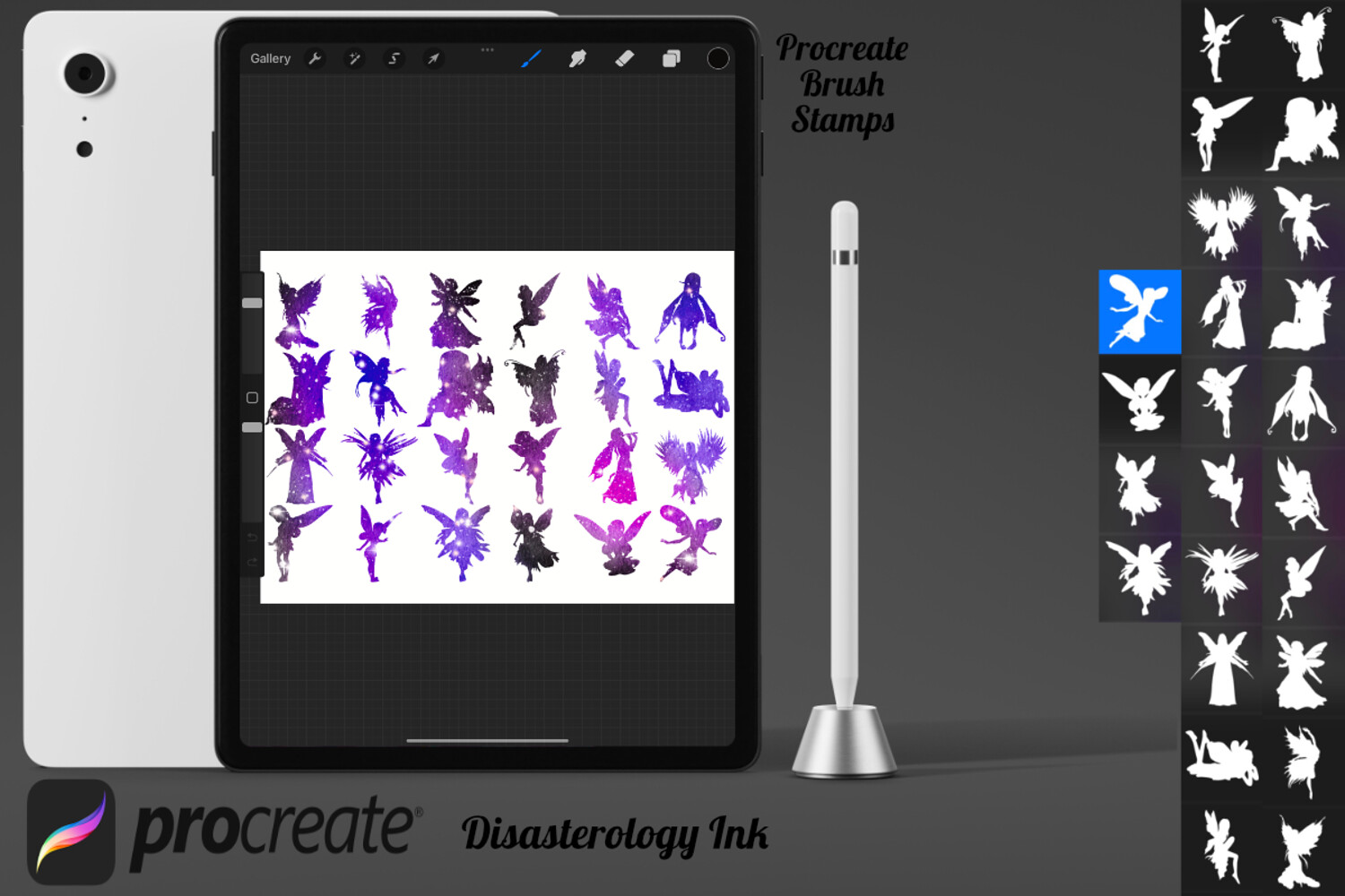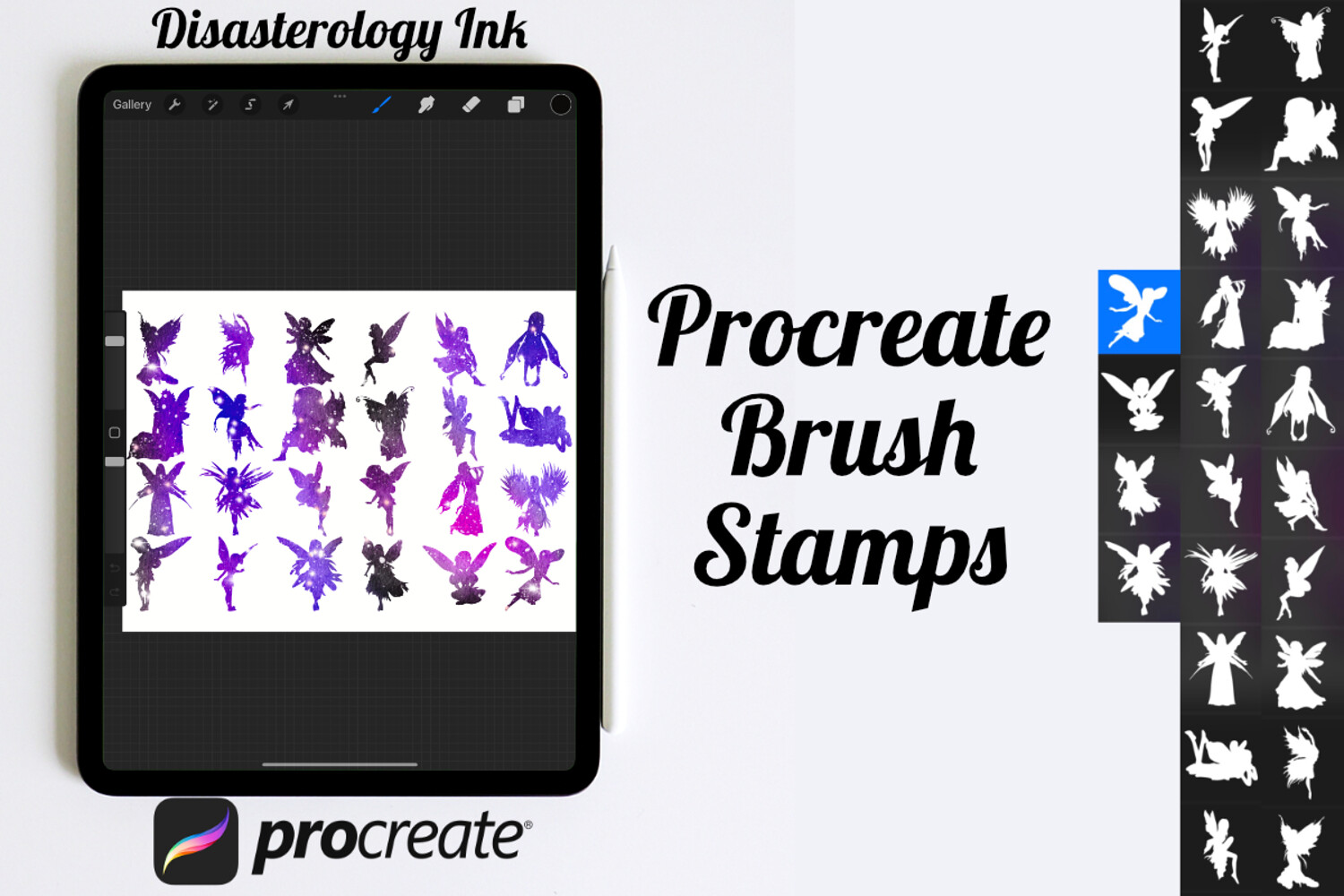 Pack of 24 Fairy Silhouette Procreate Stamp Brushes! These fairies silhouettes stamps are perfect for making illustration projects or any procreate purpose. You can use these in any colour or opacity and they can be resized to best fit your art. You need Procreate 5.0.8 or 5X, an iPad, and an Apple Pencil. Also, these stamp brushes are not pressure sensitive and can be used with third party stylus, Apple Pencil or even your finger. You can change the colour, size and opacity of these stamps.