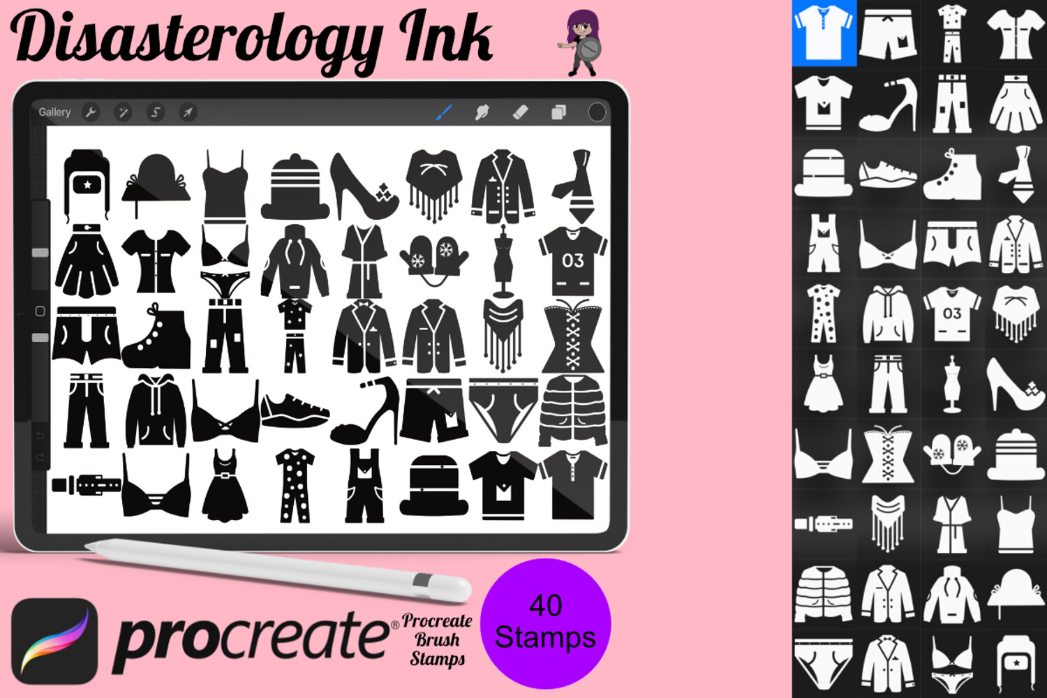 Pack of 40 Clothing Fashion Icon Procreate Stamp Brushes! These fashion stamps are perfect for making illustration projects or any procreate purpose. You can use these in any colour or opacity and they can be resized to best fit your art. You need Procreate 5.0.8 or 5X, an iPad, and an Apple Pencil. Also, these stamp brushes are not pressure sensitive and can be used with third party stylus, Apple Pencil or even your finger. You can change the colour, size and opacity of these stamps.