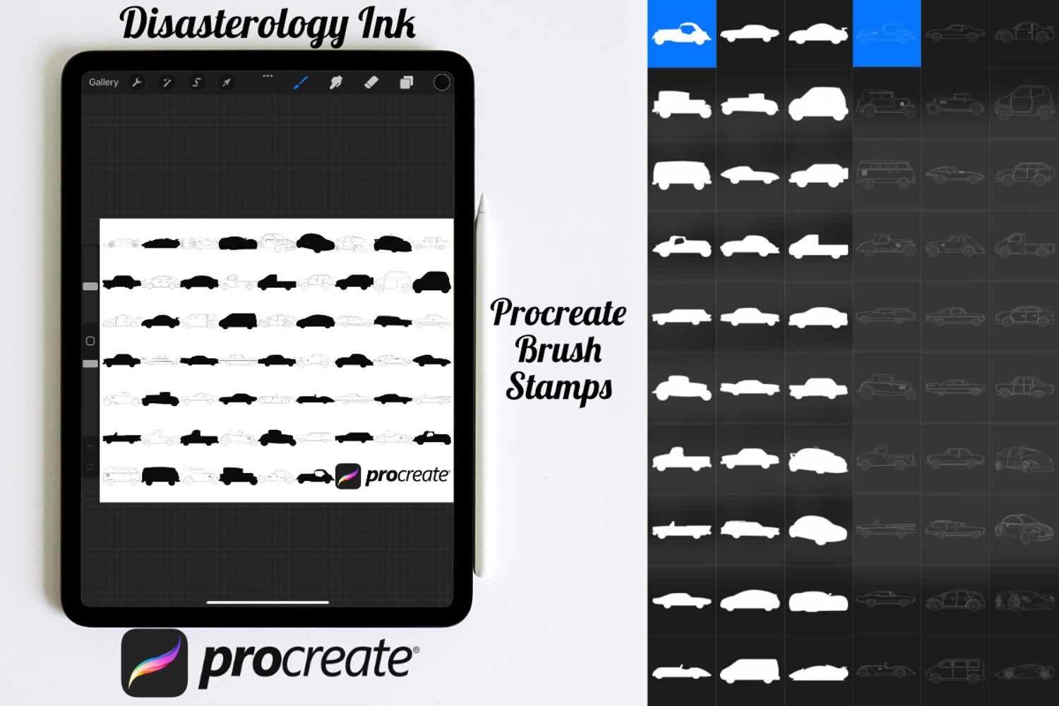 Pack of Car Outlines & Silhouettes Procreate Stamp Brushes! These 60 Cars stamps are perfect for making illustration projects or any procreate purpose. You can use these in any colour or opacity and they can be resized to best fit your art. You need Procreate 5.0.8 or 5X, an iPad, and an Apple Pencil. Also, these stamp brushes are not pressure sensitive and can be used with third party stylus, Apple Pencil or even your finger. You can change the colour, size and opacity of these stamps.