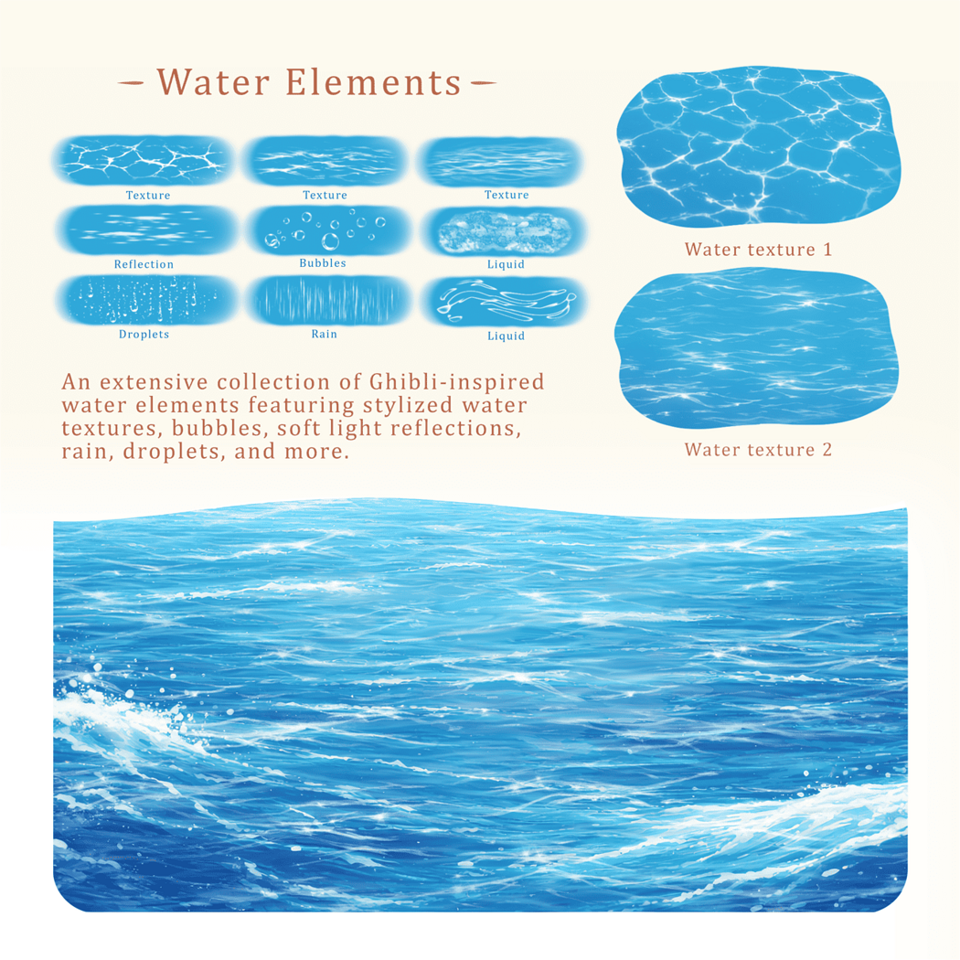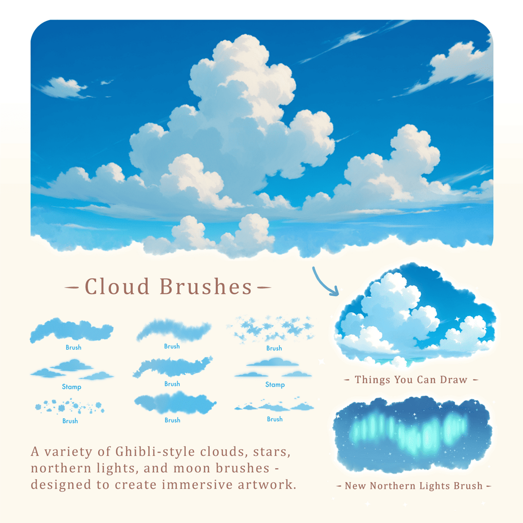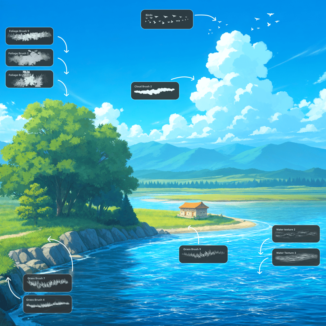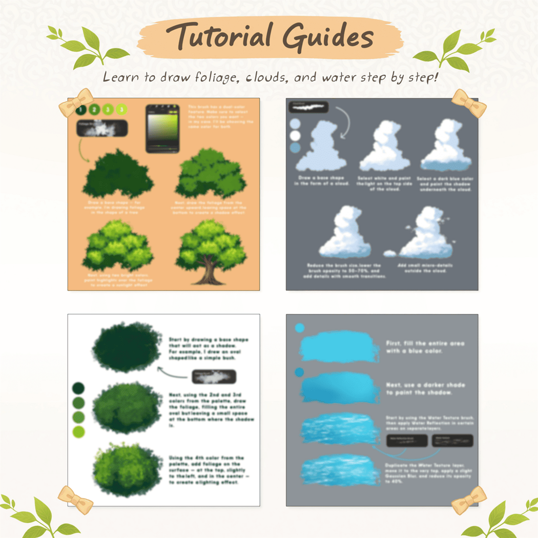 For beginners, I’ve included 4 tutorial images to guide you step by step through drawing clouds, foliage, and water using the brushes. Start creating your Ghibli-inspired artwork today!