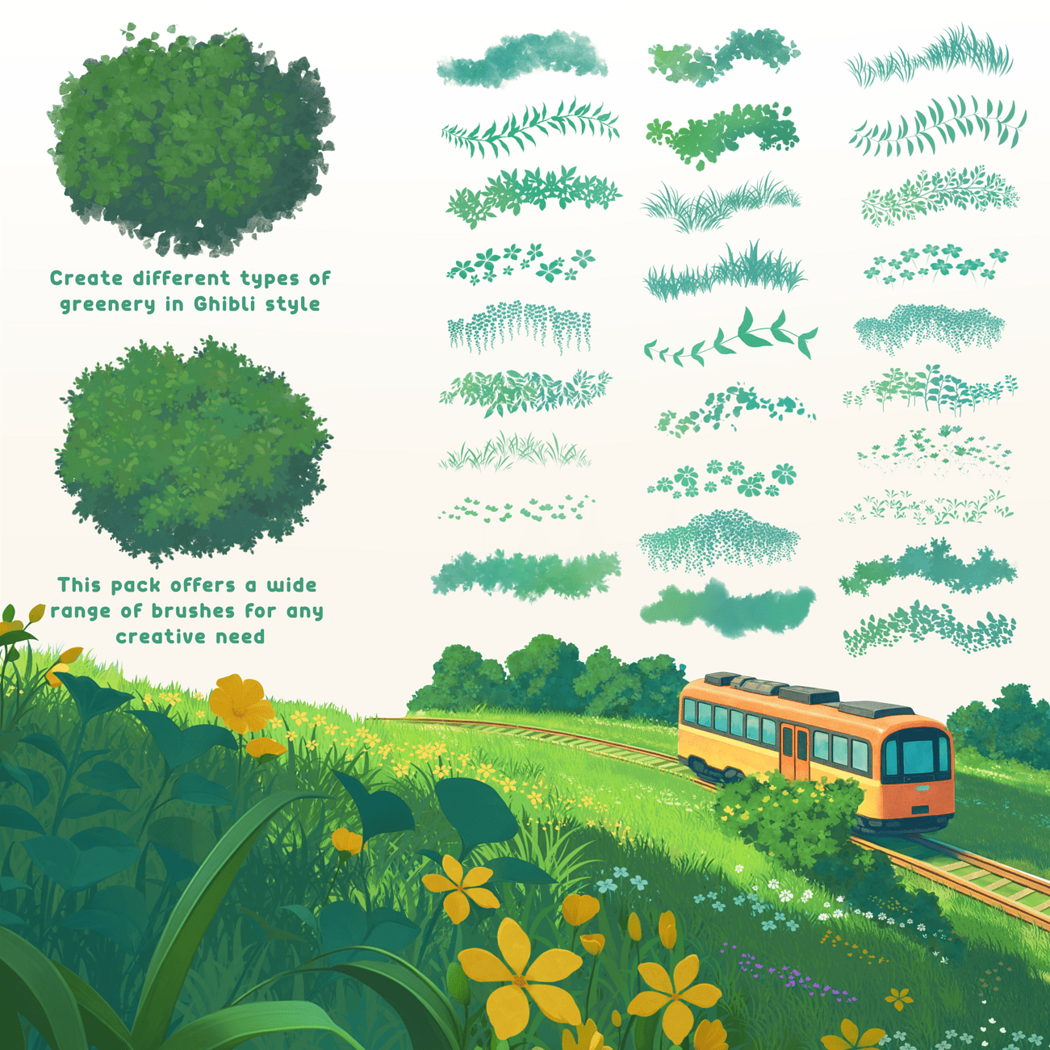 Warm Ghibli Style Procreate Brushes: Nature, Foliage, Clouds, Water Effects, Flowers