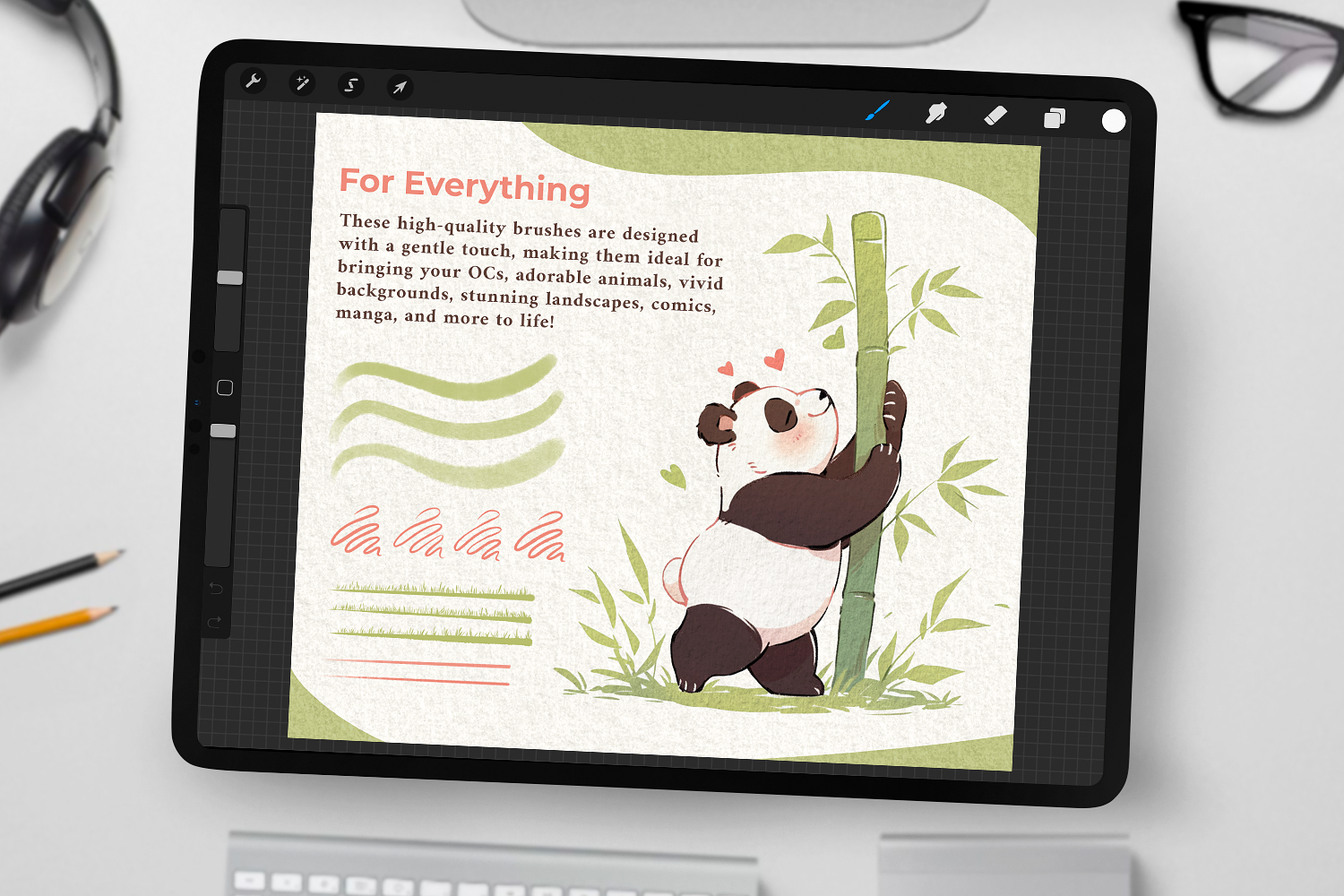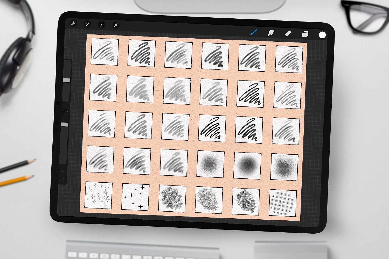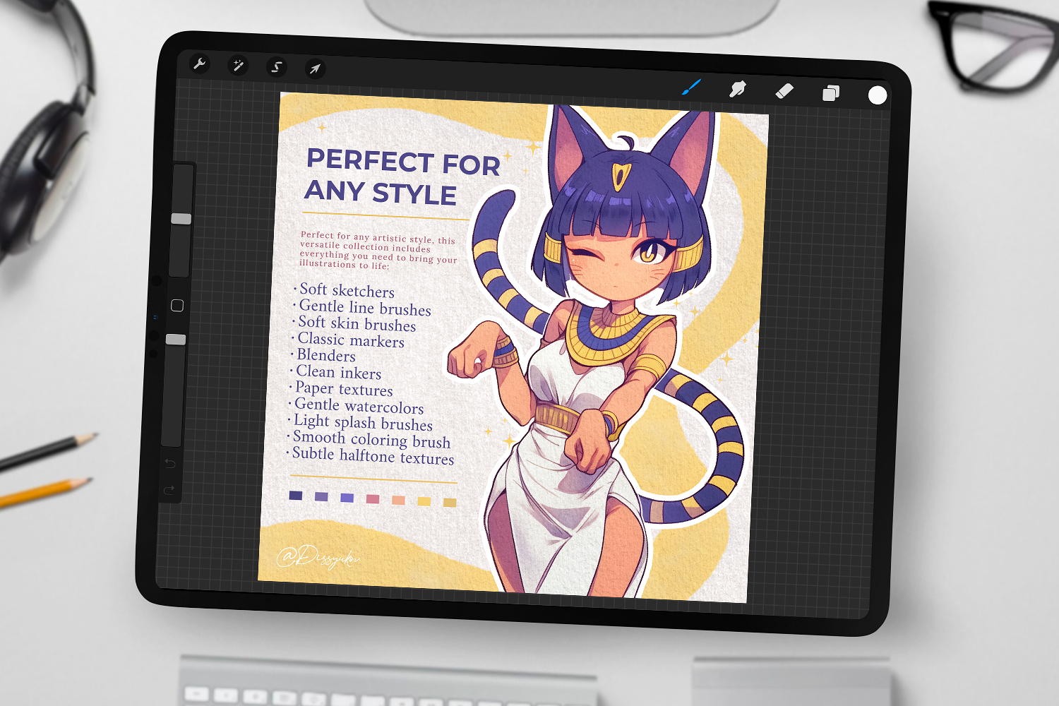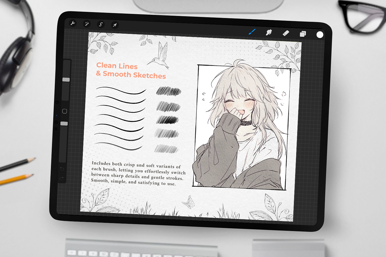 Made for any artistic style, this diverse set of 70 brushes offers everything you need: Soft Sketch and Smooth Line Brushes, Rich Marker Brushes, Gentle Skin and Coloring Brushes, Elegant Ink and Watercolor Brushes, Blenders, and unique Halftone & Tartan Textures. Perfect for both beginners and seasoned artists.