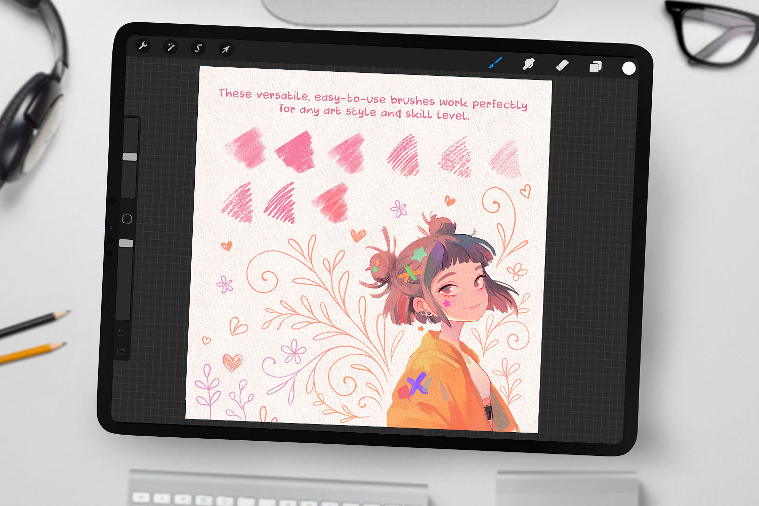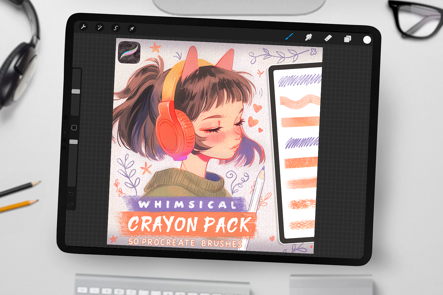 Whimsical Anime Crayon Brushes is a collection of 50 hand-crafted procreate brushes made to add warmth, softness, and texture to your digital artwork. Inside you’ll find gentle chalk brushes for sketching and line art, textured tools for shading and depth, fine brushes for delicate details, and even a paper texture brush to give your work a classic, traditional feel.