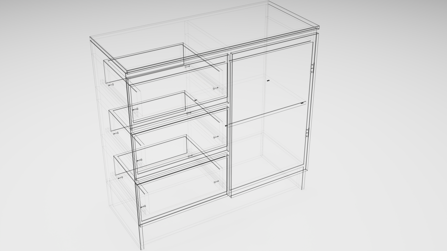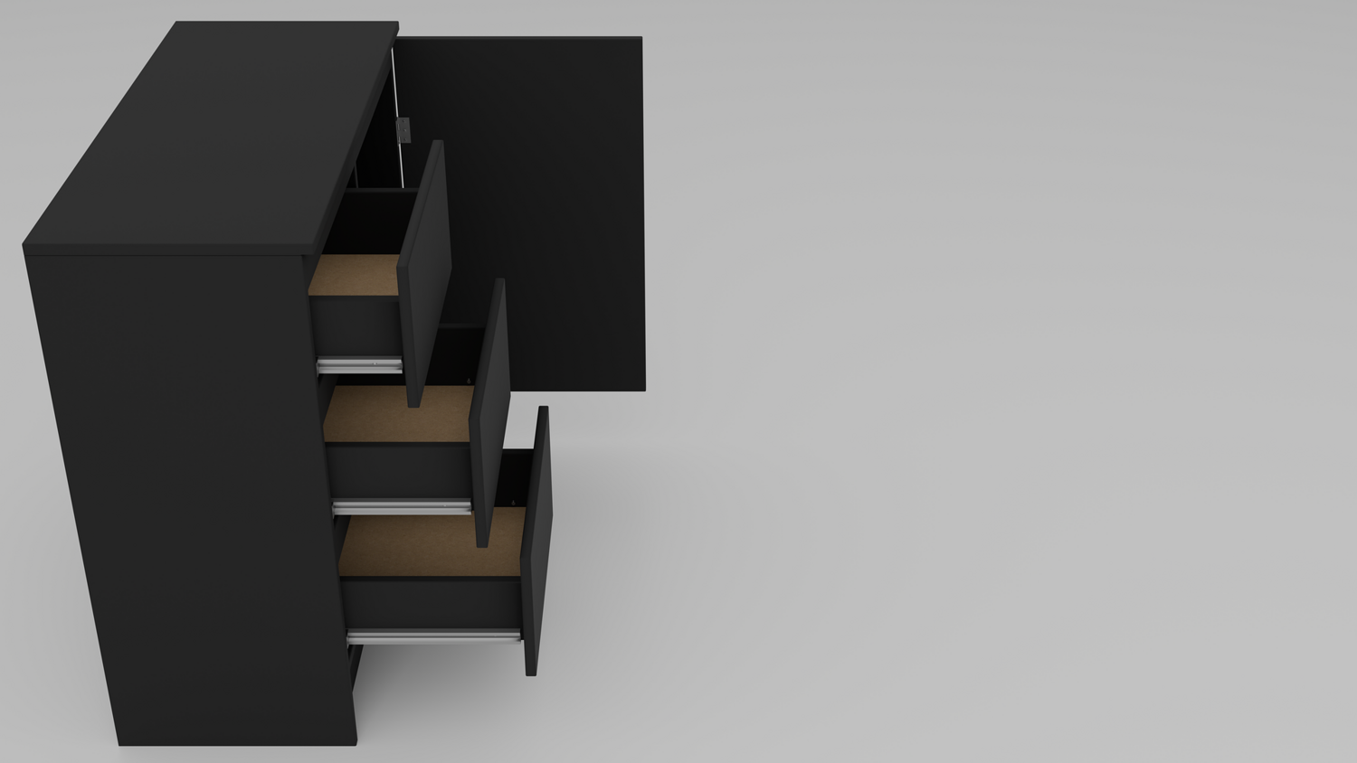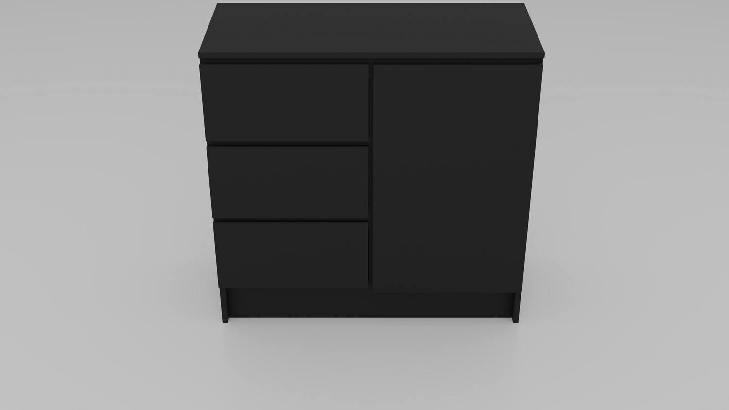 This stylish dresser impresses with its modern, minimalist design in elegant matte black. It features three spacious drawers and a practical door, providing versatile storage for clothing, everyday items, or accessories. The fine matte surface ensures a sophisticated look and blends seamlessly into various interior styles – from industrial to modern classic. For added realism, special attention was paid to authentic construction details: visible hinges on the door as well as finely modeled screws highlight the high-quality craftsmanship and give the model authenticity and depth. Clean edges, subtle joints, and realistic proportions make the dresser an ideal asset for interior visualizations, product presentations, or game environments. The combination of functionality and aesthetic simplicity makes this 3D model a perfect addition to sophisticated design projects.