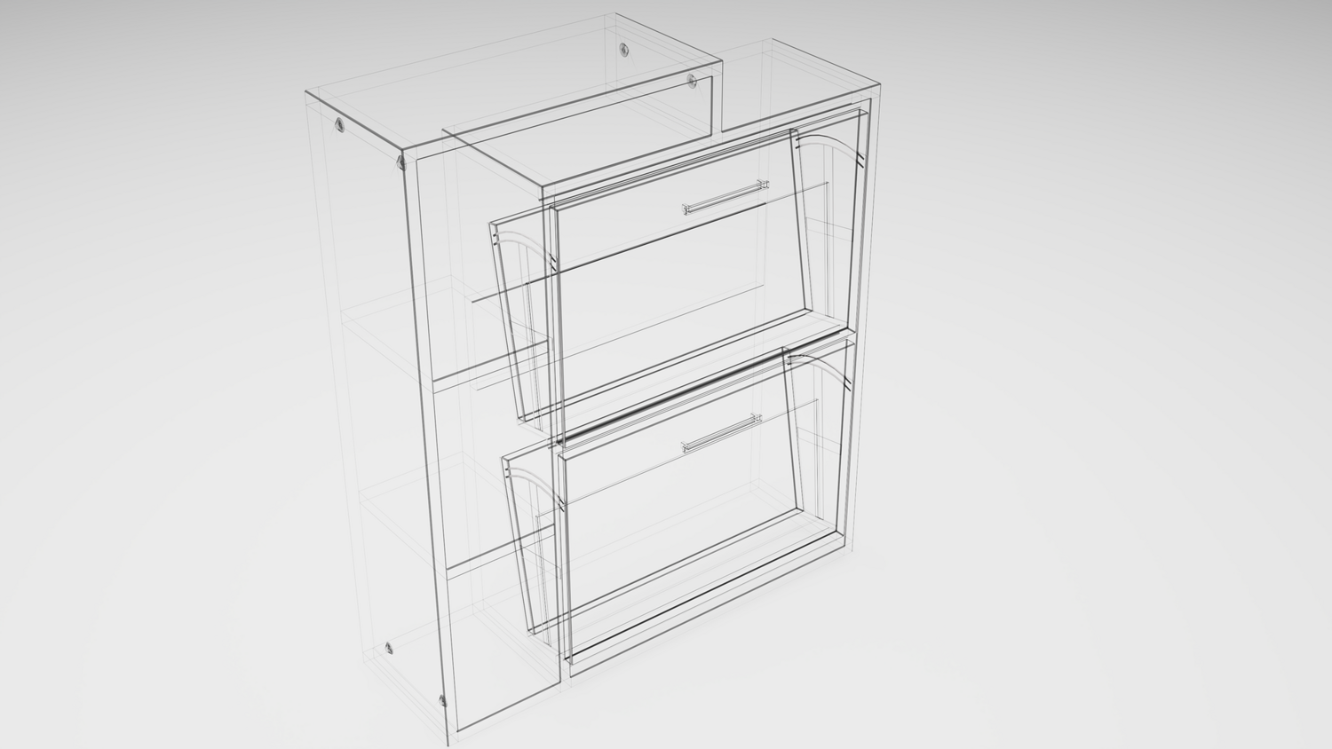 This 3D model showcases a modern wardrobe shoe tilt cabinet in elegant matte black. The model features two small shelves next to the doors, ideal for storing smaller items. In addition, there are two large tilt doors that open forward and provide ample storage space for shoes. Clean lines and the matte finish emphasize the timeless, minimalist design.