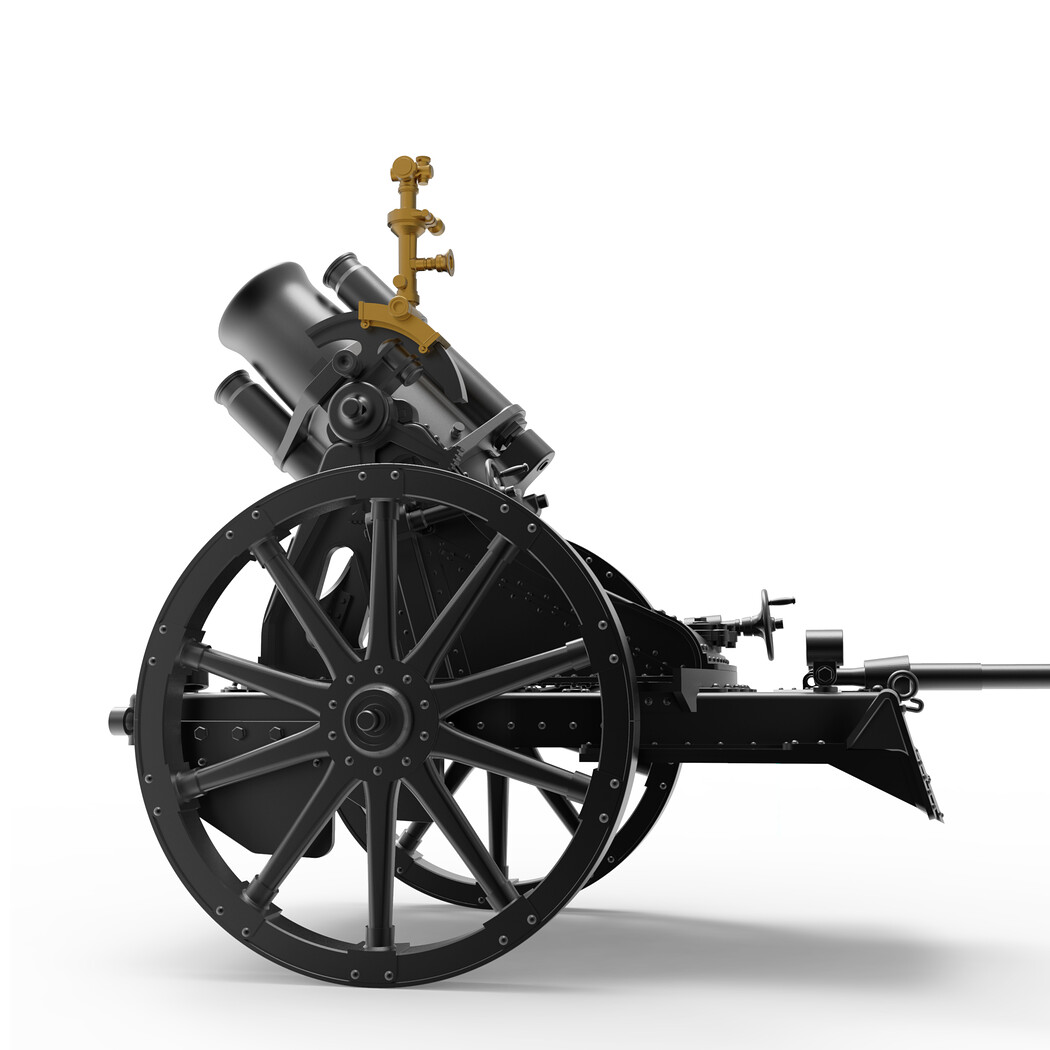 Historical Background: Developed by Germany during World War I, the 250 mm Schwere Minenwerfer (heavy mine thrower) was designed to demolish fortifications, bunkers, and barbed wire defenses. Although its range was limited, its massive explosive shells were devastating in close support roles. Compact, powerful, and reliable, it became a key component of German trench artillery throughout the conflict.