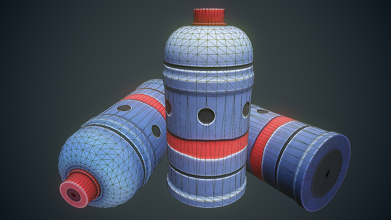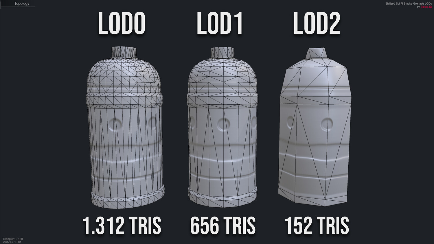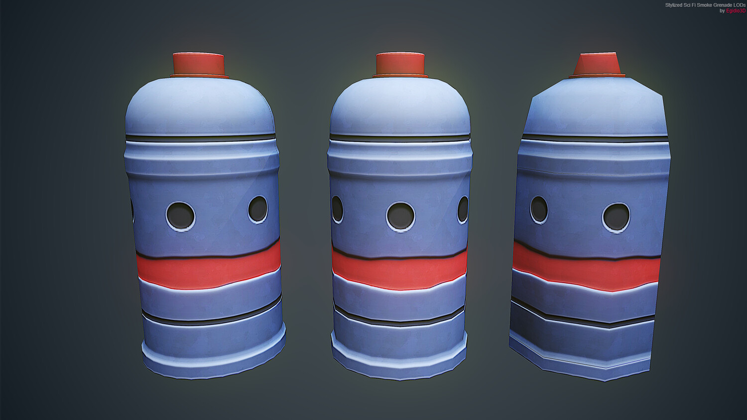 *Stylized Sci Fi Smoke Grenade LOD0 - 1.312 tris; *Stylized Sci Fi Smoke Grenade LOD1 - 656 tris; *Stylized Sci Fi Smoke Grenade LOD2 - 152 tris; *Textures: 2k (2048x2048); *PNG: Base Color, Height, Metallic, Normal, Roughness; *Unity: Albedo, MetallicSmoothness, Normal; TGA (Targa); *Unreal: Base Color, Normal, Occlusion Roughness Metallic; TGA (Targa); *Formats: FBX and OBJ.