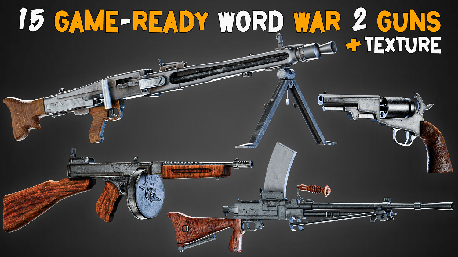 Hey soldiers, game devs, and history buffs! 🎮 Step back into the chaos of World War II with this realistic collection of 15 iconic firearms, carefully modeled and textured to capture the true craftsmanship, wear, and grit of the battlefield.