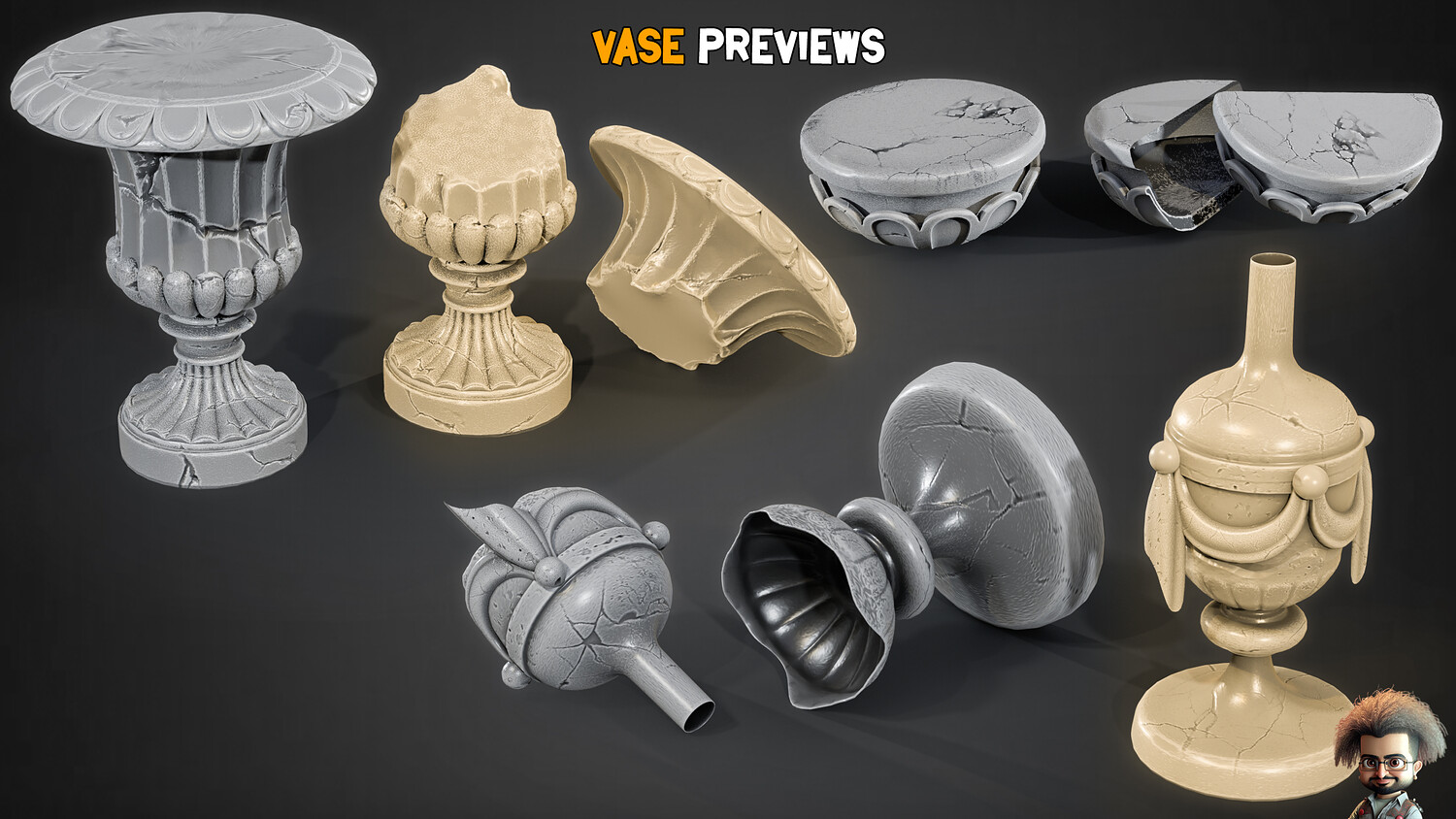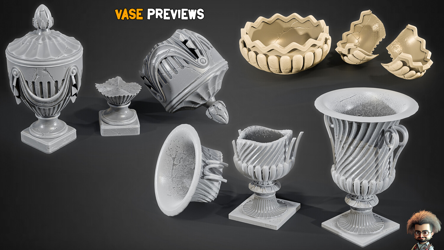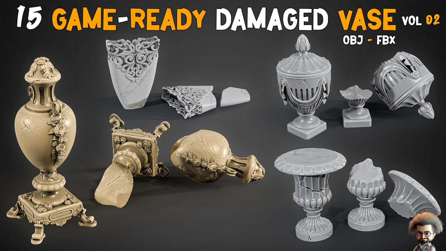 🏺 15 Unique Damaged Vase Models – Each one with a distinct silhouette and destruction style 🧠 LowPoly & Game-Ready – Designed for fast performance with no compromise on detail 🖼 4K PBR Textures – Including Base Color, Normal, Roughness, AO & Metallic maps 📁 Formats Included: FBX, OBJ, BLEND 🔧 UV Unwrapped – Clean, customizable, and efficient