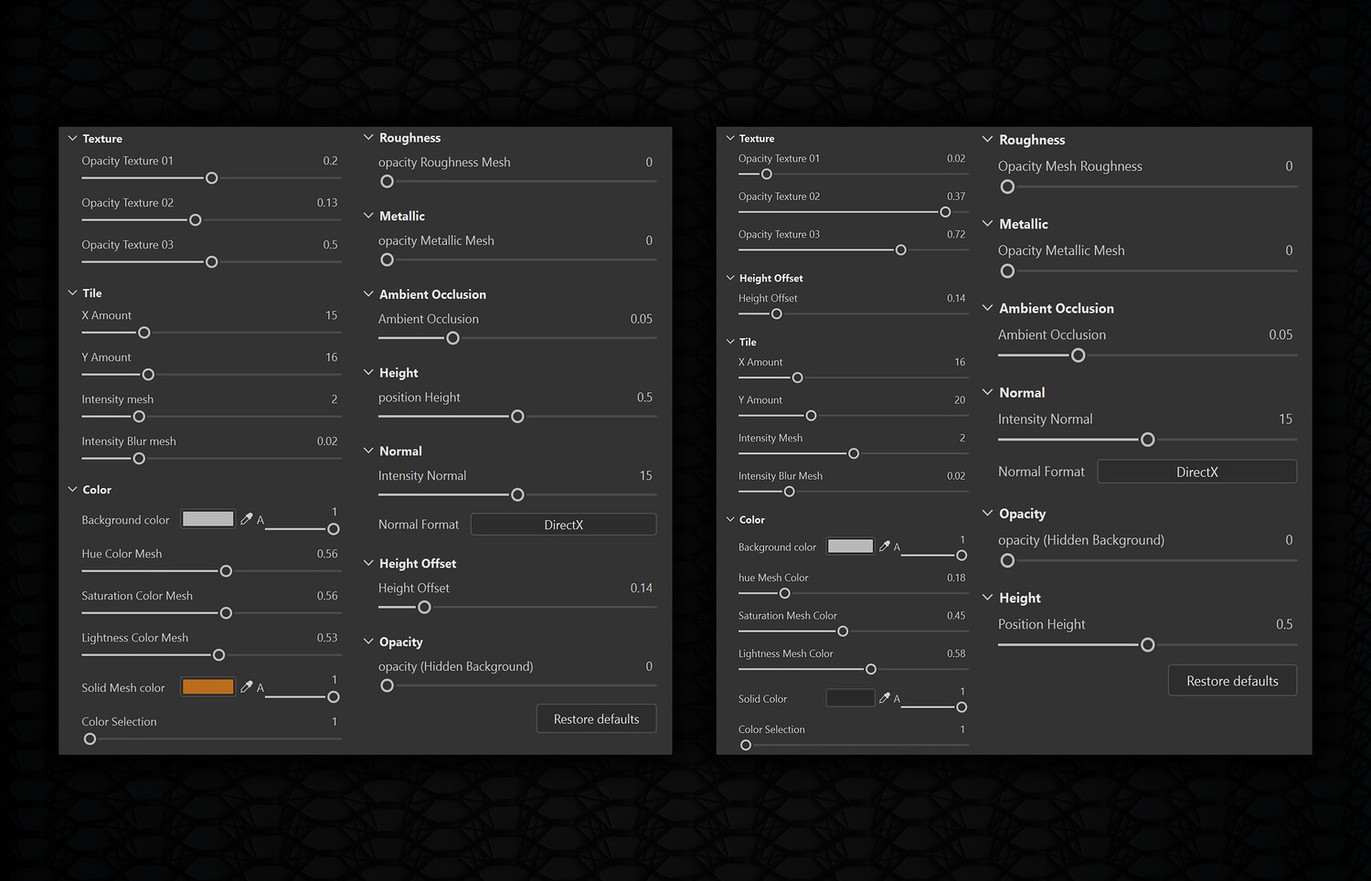 With the ability to change all settings and parameters in the file With excellent ability to change all kinds of settings in the Sbsar file: Because there were many parameters that can be changed, all the parameters are placed in the photo