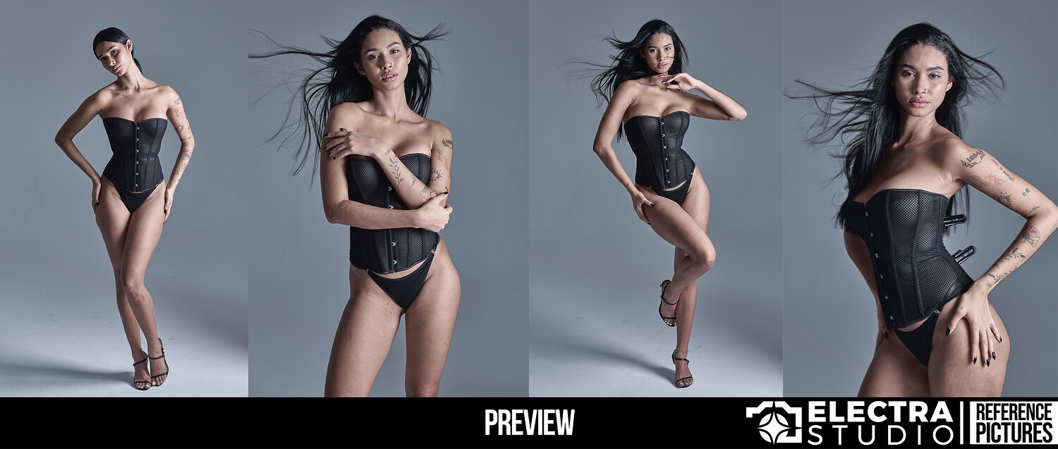 1300+ Chic Energy: Fashion & Portrait Reference Pack Part I brings a collection full of attitude, style, and bold character. The model appears in a black corset, a white outfit set, and a few chic fashion looks — every pose confident and full of energy.