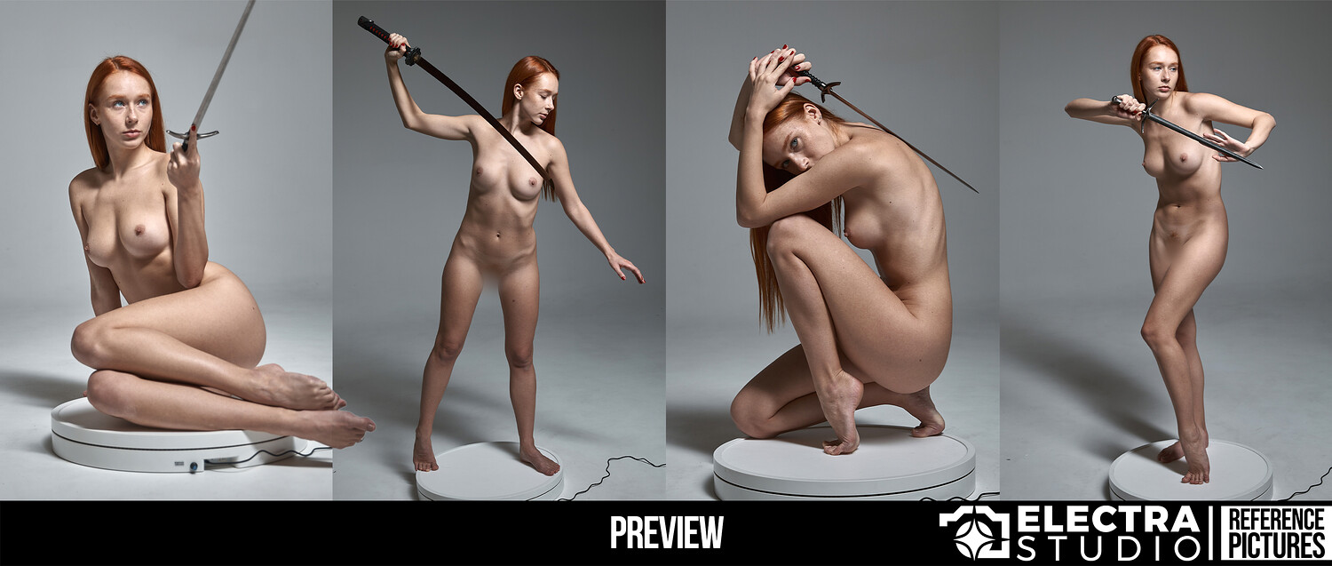Sculpted Tension: Female Anatomy with Blades is a powerful reference pack built around contrast — soft anatomy and sharp steel, calm control and latent danger. Featuring 880 high-quality photos, this collection captures a striking red-haired model in a wide range of standing, sitting, kneeling, and dynamic combat-inspired poses, all explored from multiple angles, including full 360° rotations.