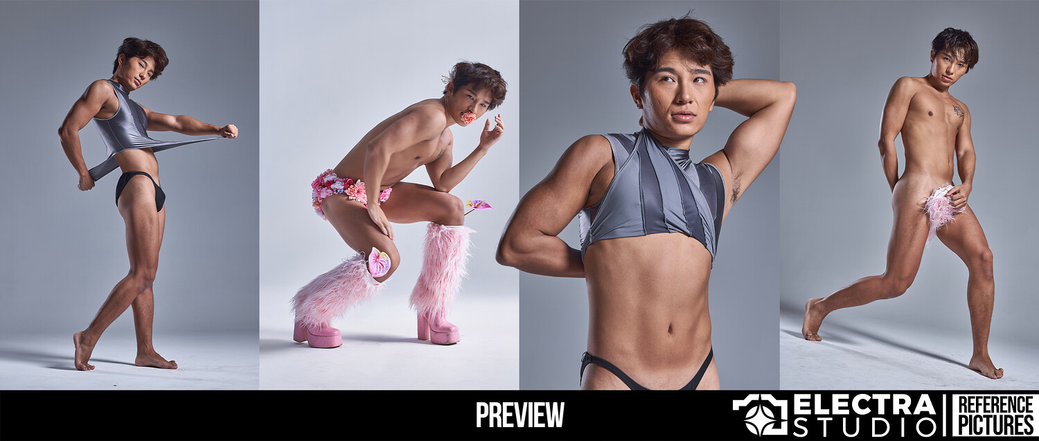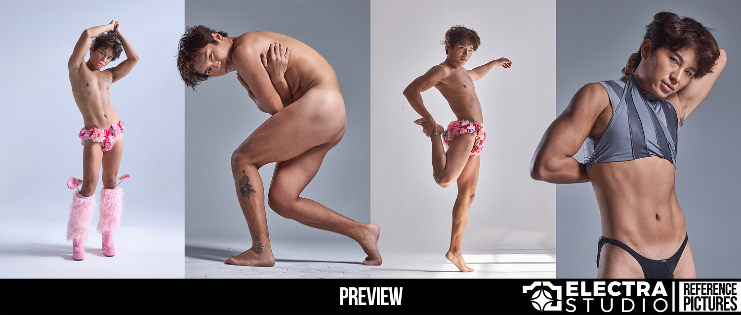 Inside, you’ll find over 1000 high-quality photos featuring a fit, expressive male model moving through a wide range of poses for anatomy studies, character design, and figure drawing. The pack blends stylized looks, including pink fairy-inspired outfits and a sleek gray-blue bodysuit, with clean references, offering clear insight into muscle structure, balance, and proportion.