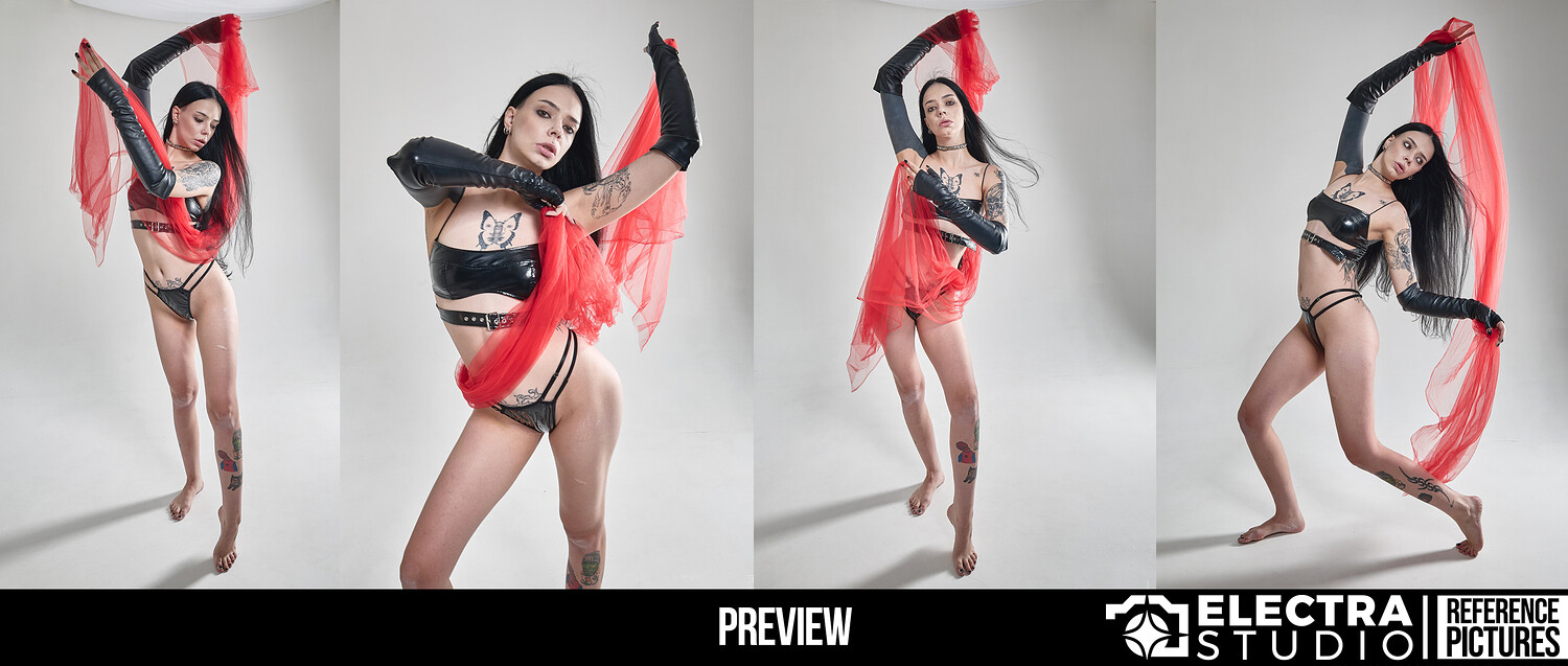A breathtaking visual collection featuring over 930 high-quality reference photos of a striking black-haired model with tattoos and piercings. This pack captures intense and expressive poses — standing, sitting, and lying — with bold red fabric flowing around her, creating dramatic motion and emotion in every frame. Dynamic angles from above and below reveal the strength and sensuality of the female form, while stunning portraits highlight her captivating presence.