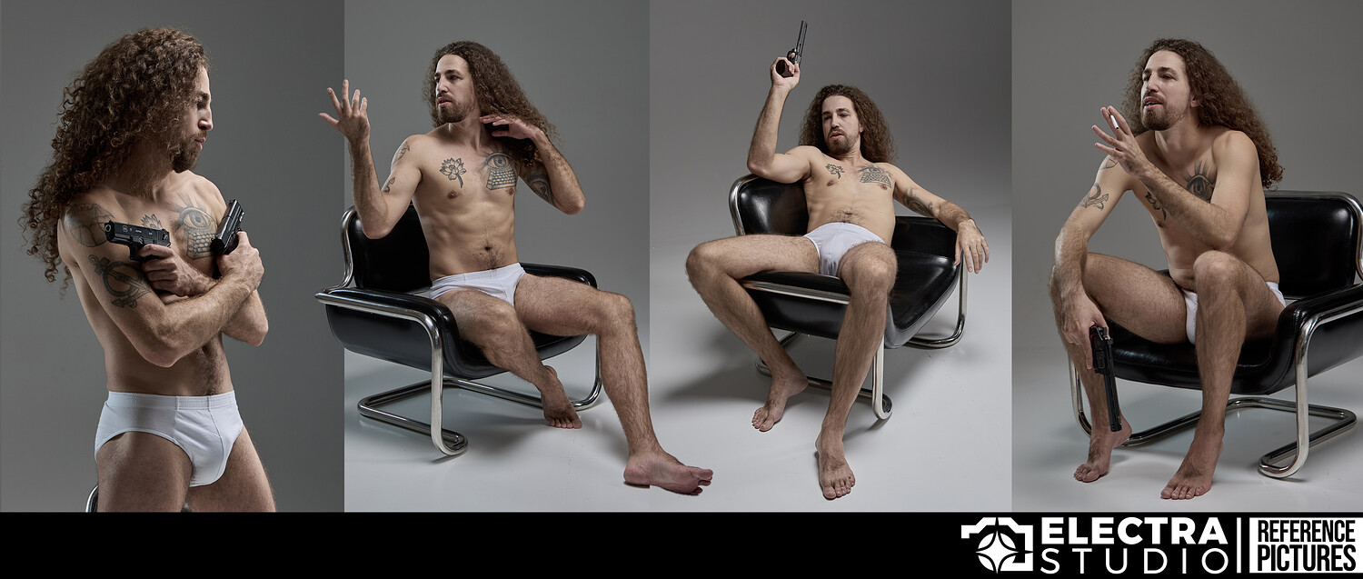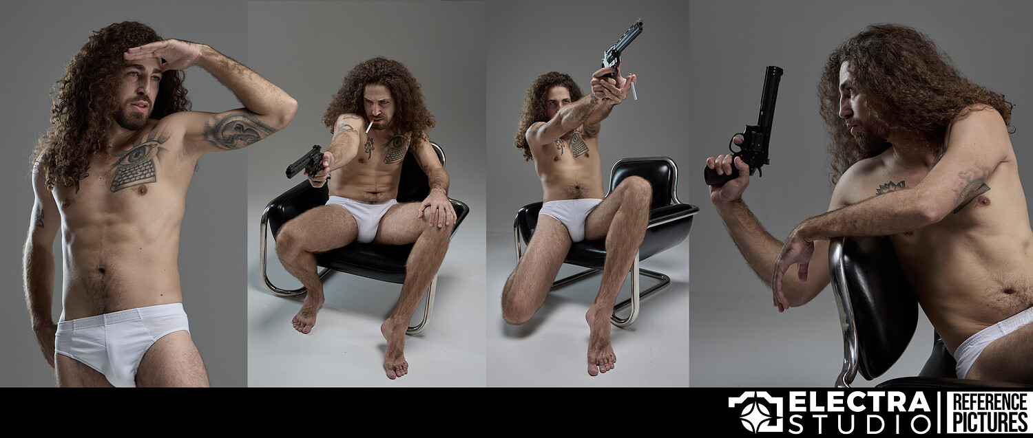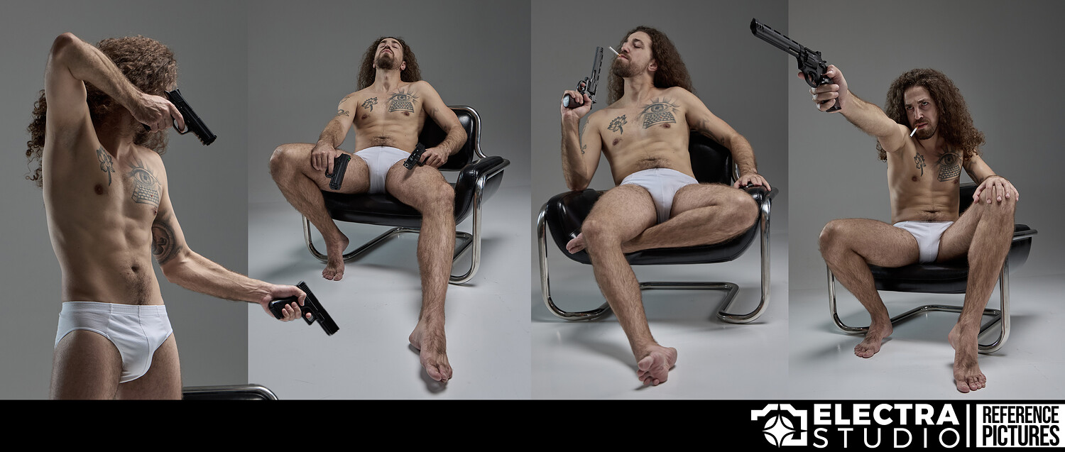 Alongside these classical, clean poses, the pack includes a selection of character-driven setups with a gun and a cigarette. These add mood and narrative, making the collection just as valuable for character design and visual storytelling as it is for pure anatomy practice.