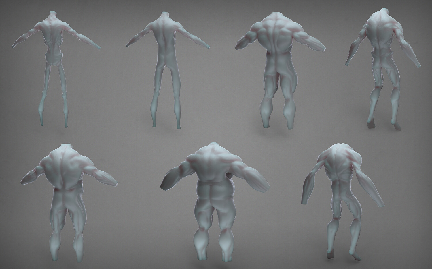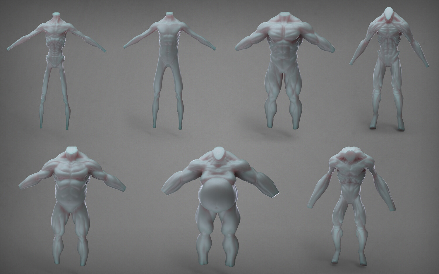 All of the bodies are un-textured high poly sculpts, with high detail such as pores and veins.