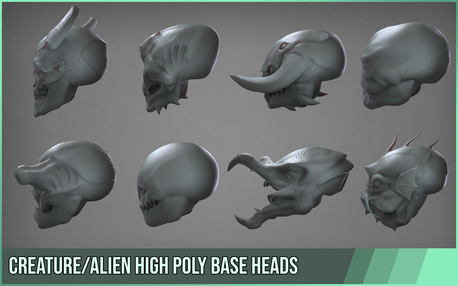 Creature/Alien like heads to use as base high poly mesh for concept or modeling.