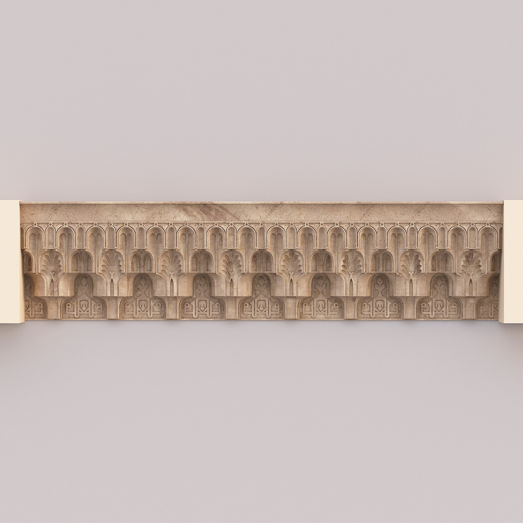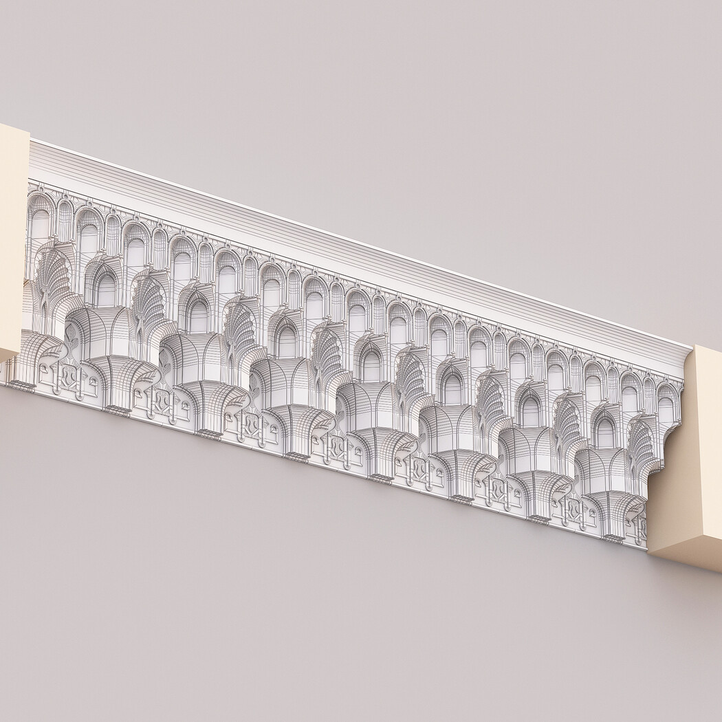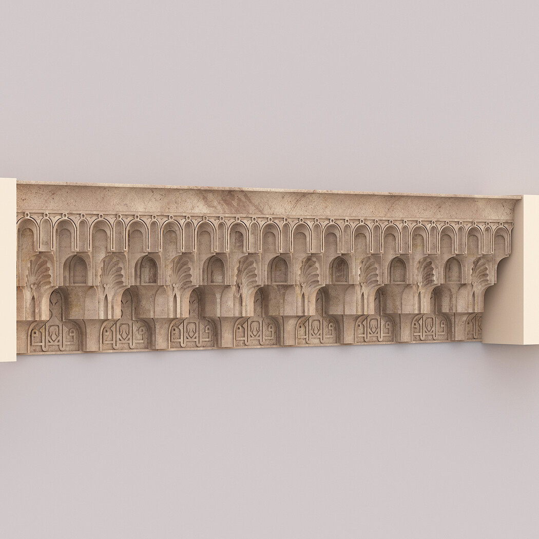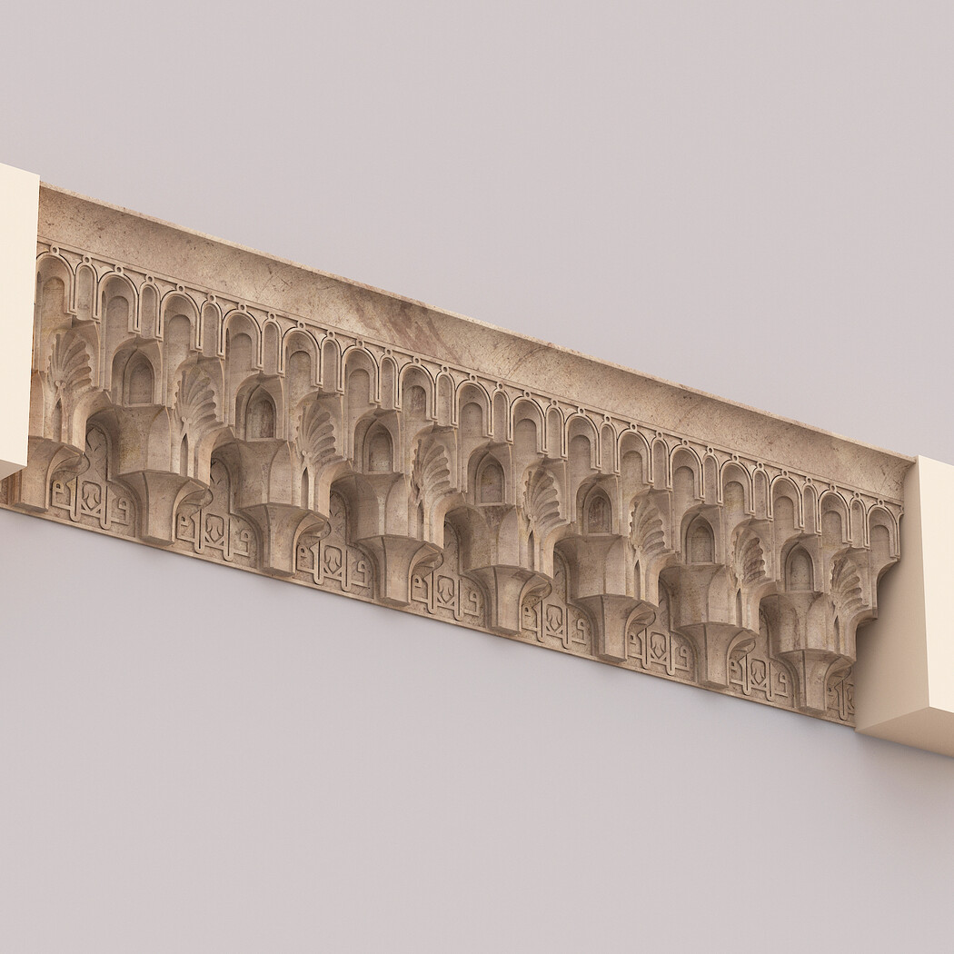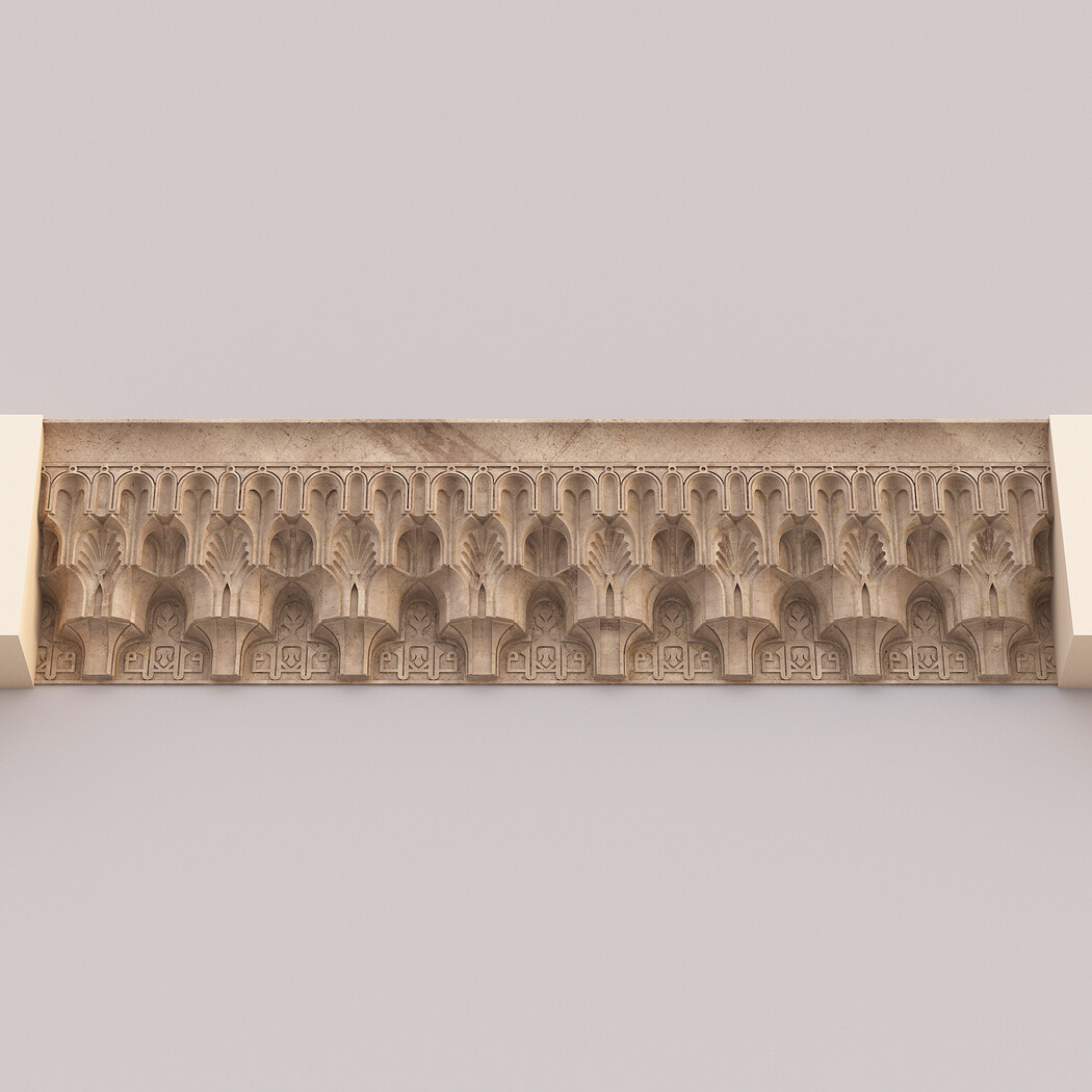 Classic Islamic Muqarnas Cornice 001 3ds max modeling 3ds max 2024 Vray 6 Polygons: 107 731 Vertices: 114 225 Unwrapped: Fully unwrapped , non-overlapping Format : FBX, OBJ, STL Height: 57 cm Length: 23 cm Width: 232 cm Textures: All textures are seamless ConcreteDiffuse - JPG 4096x4096 ConcreteBump - JPG 4096x4096 Dirt_Texture - PNG 2200x2200