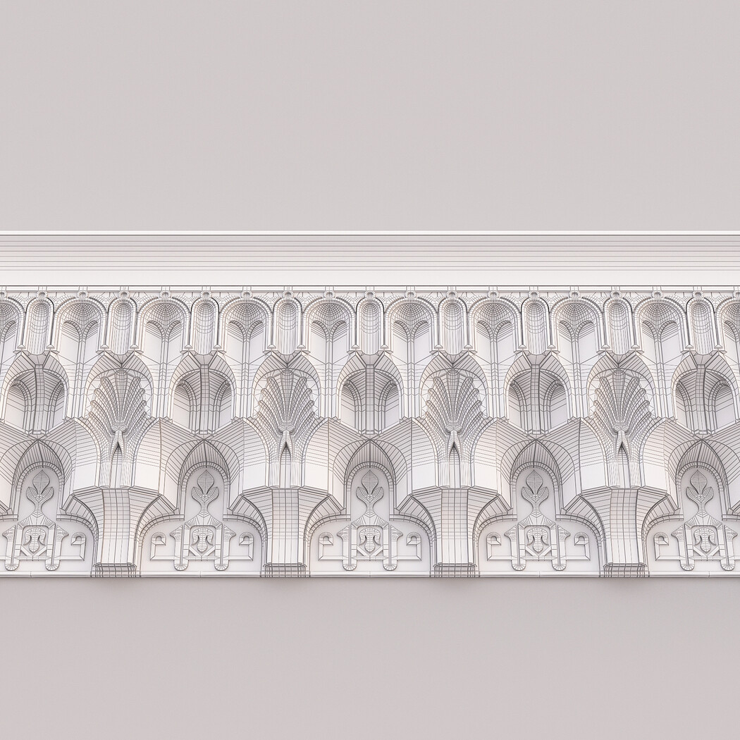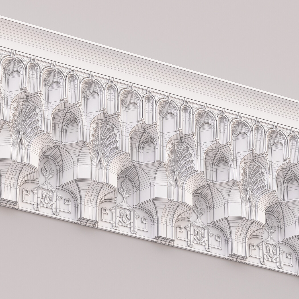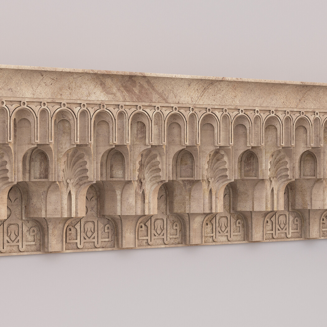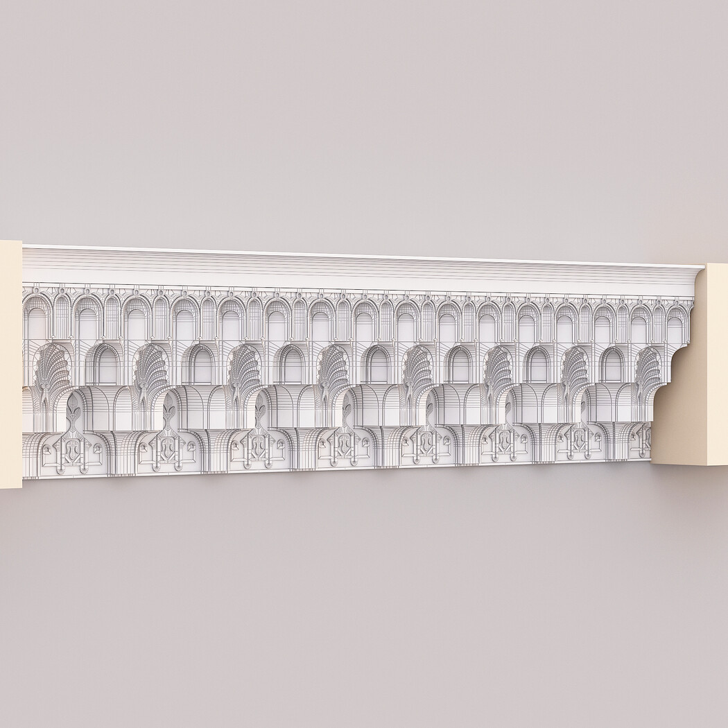 Classic Islamic Muqarnas Cornice 001 3ds max modeling 3ds max 2024 Vray 6 Polygons: 107 731 Vertices: 114 225 Unwrapped: Fully unwrapped , non-overlapping Format : FBX, OBJ, STL Height: 57 cm Length: 23 cm Width: 232 cm Textures: All textures are seamless ConcreteDiffuse - JPG 4096x4096 ConcreteBump - JPG 4096x4096 Dirt_Texture - PNG 2200x2200