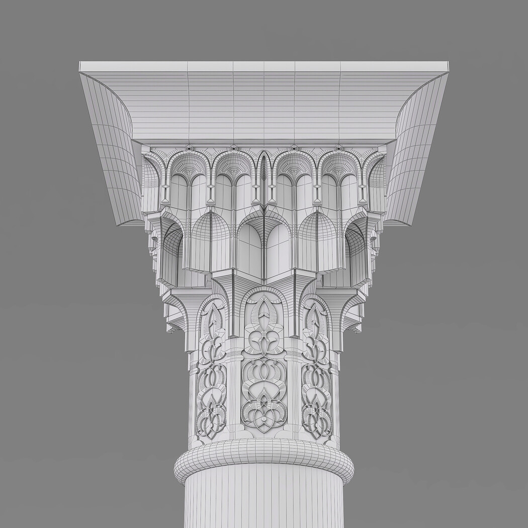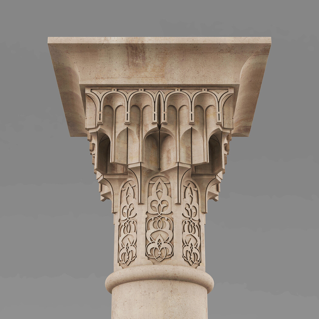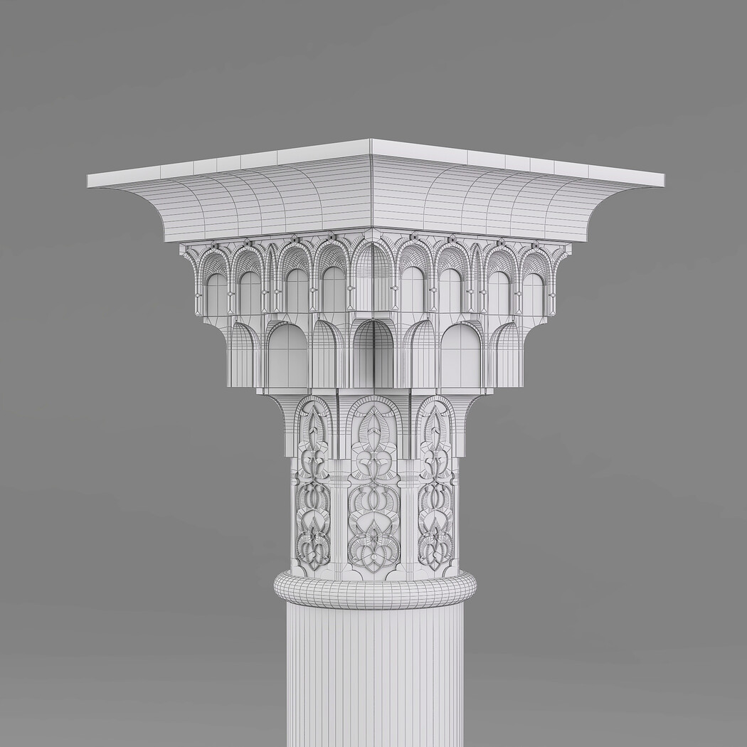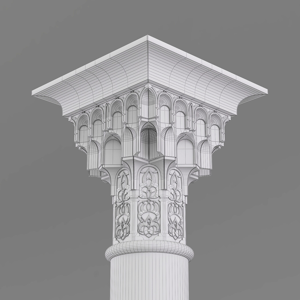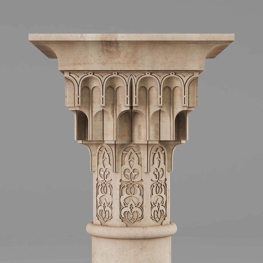 Classic Islamic Muqarnas Column 002 3ds max modeling 3ds max 2024 Vray 6 Polygons: 113 851 Vertices: 127 672 Unwrapped: Fully unwrapped , non-overlapping Format : FBX, OBJ, STL Height: 220 cm Length: 72 cm Width: 72 cm Textures: All textures are seamless ConcreteDiffuse - JPG 4096x4096 ConcreteBump - JPG 4096x4096 Dirt_Texture - PNG 2200x2200