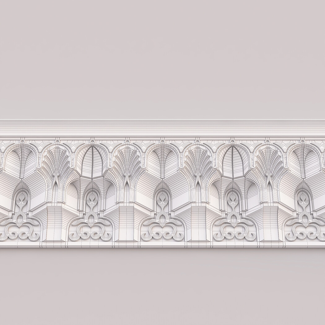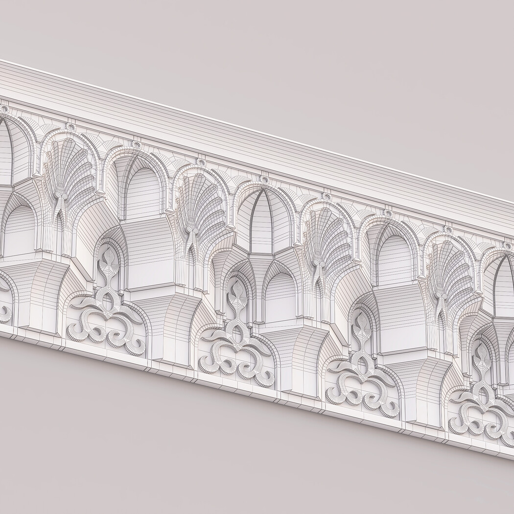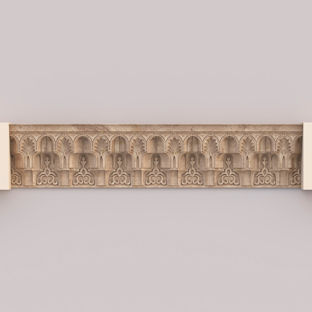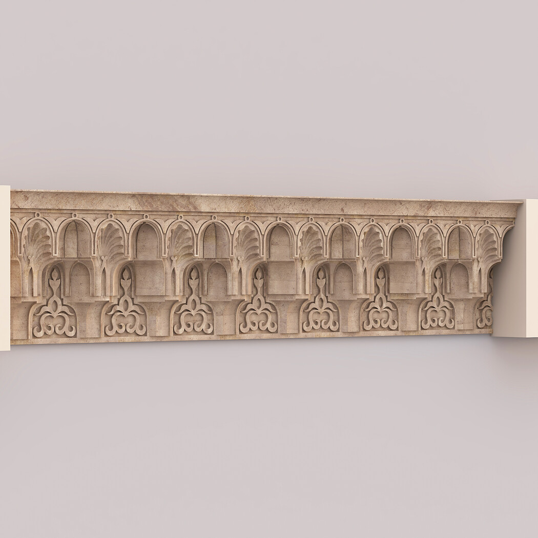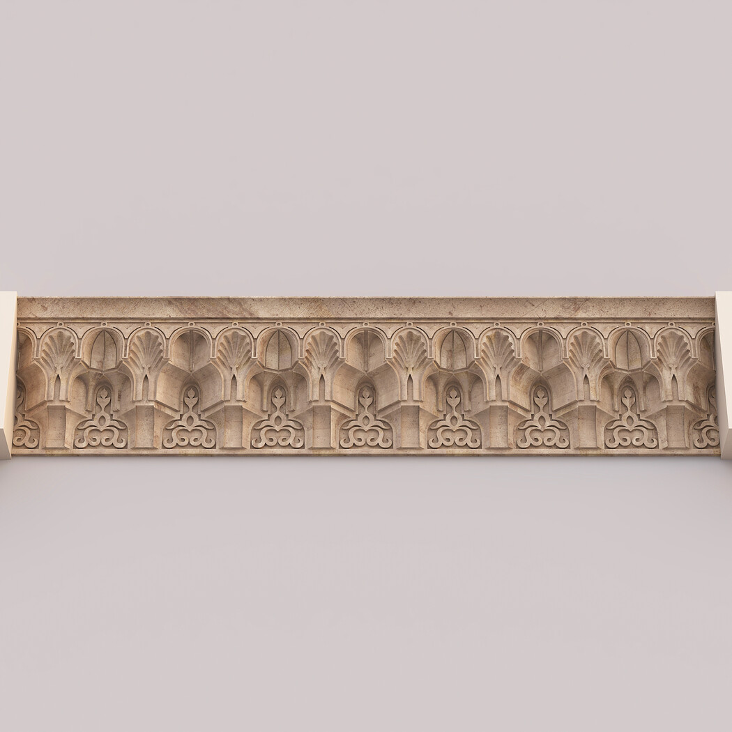Classic Islamic Muqarnas Cornice 002 3ds max modeling 3ds max 2024 Vray 6 Polygons: 83 497 Vertices: 88 929 Unwrapped: Fully unwrapped , non-overlapping Format : FBX, OBJ, STL Height: 45 cm Length: 16 cm Width: 206 cm Textures: All textures are seamless ConcreteDiffuse - JPG 4096x4096 ConcreteBump - JPG 4096x4096 Dirt_Texture - PNG 2200x2200
