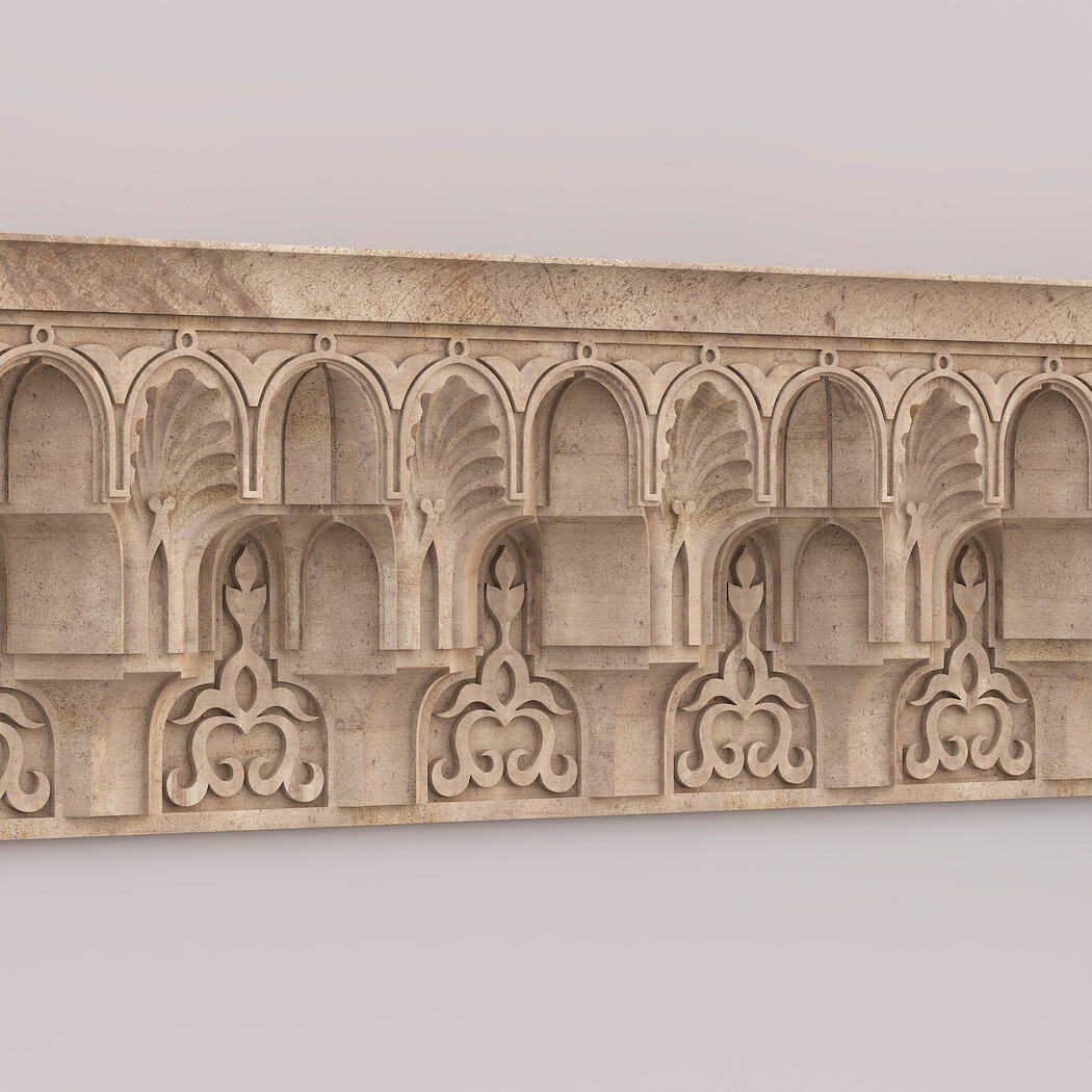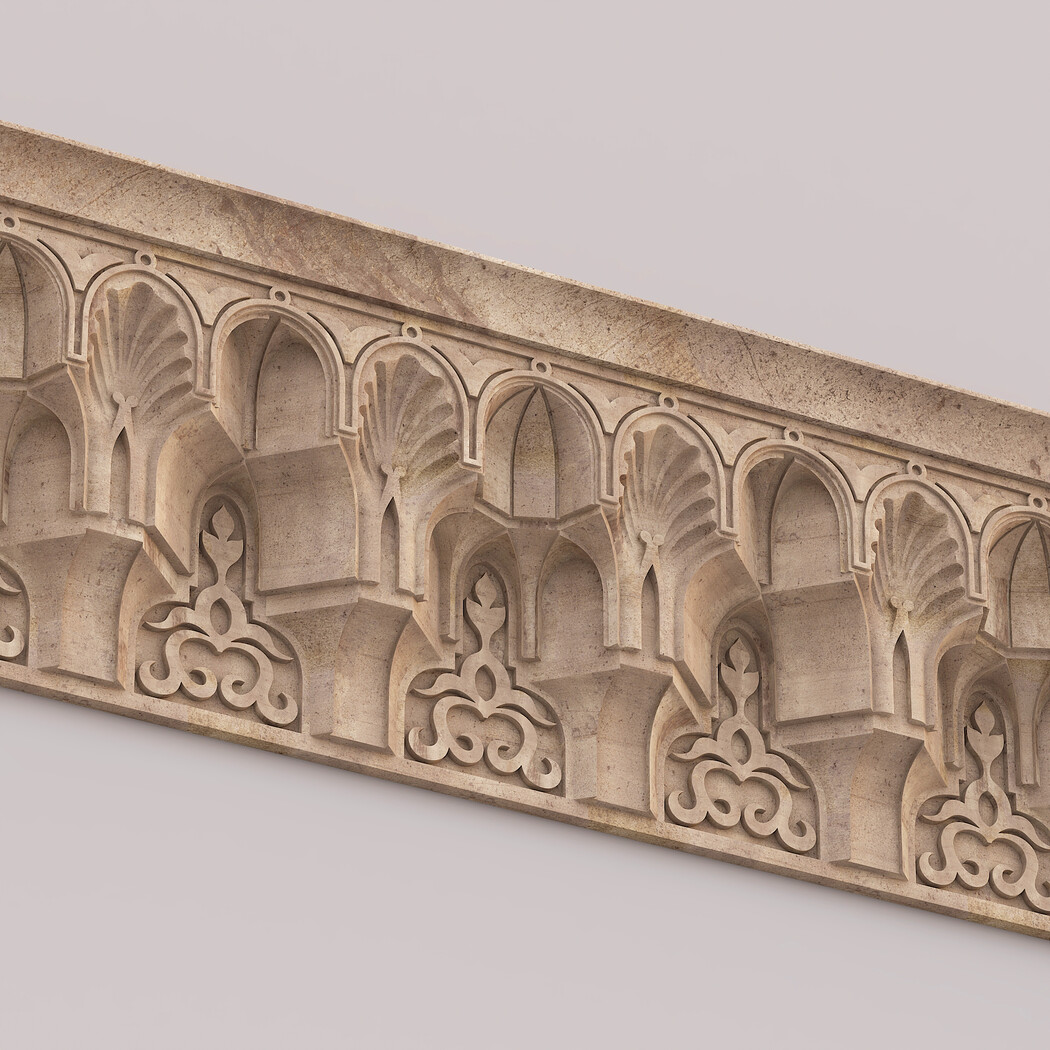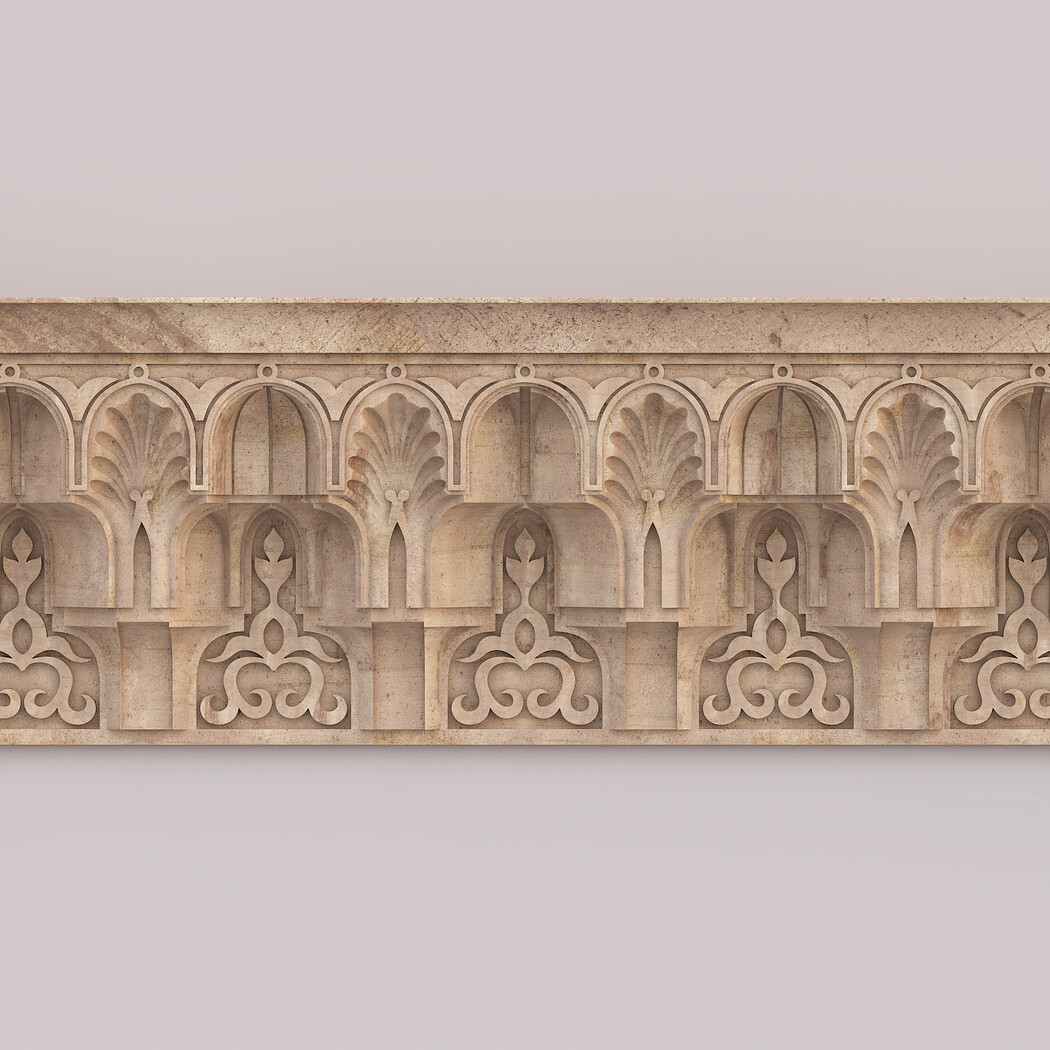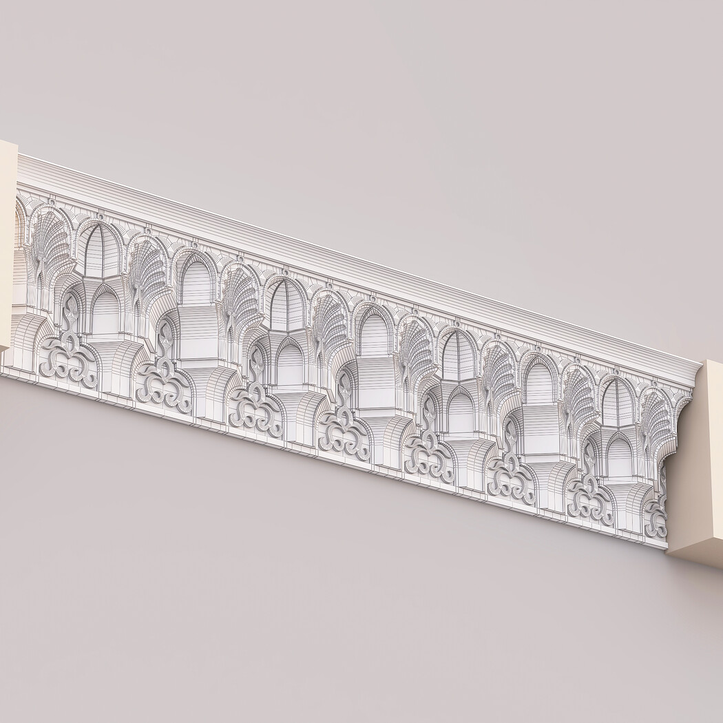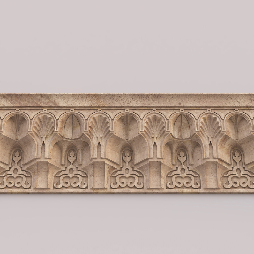 Classic Islamic Muqarnas Cornice 002 3ds max modeling 3ds max 2024 Vray 6 Polygons: 83 497 Vertices: 88 929 Unwrapped: Fully unwrapped , non-overlapping Format : FBX, OBJ, STL Height: 45 cm Length: 16 cm Width: 206 cm Textures: All textures are seamless ConcreteDiffuse - JPG 4096x4096 ConcreteBump - JPG 4096x4096 Dirt_Texture - PNG 2200x2200