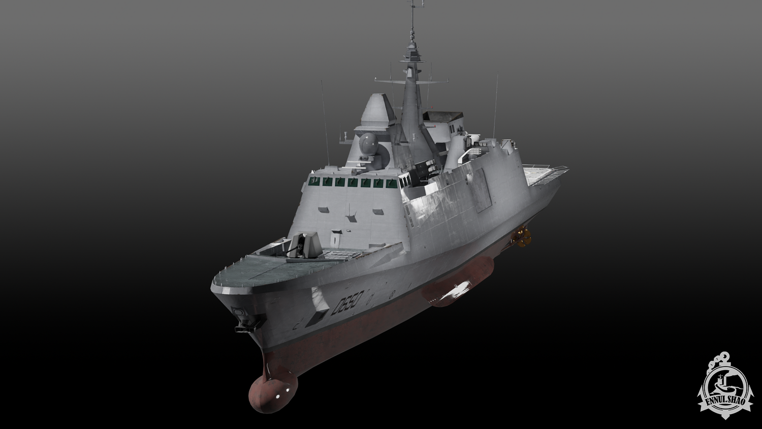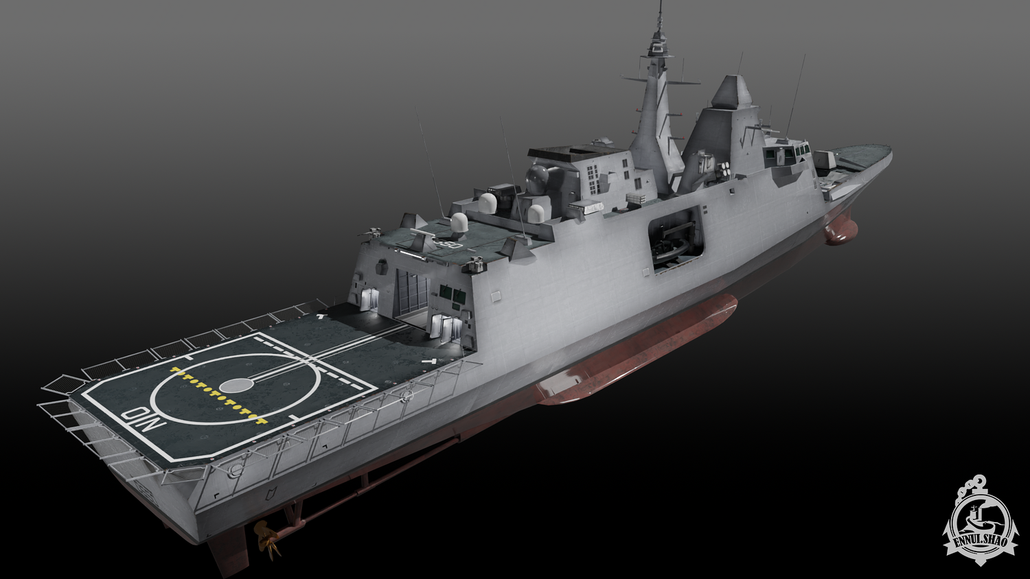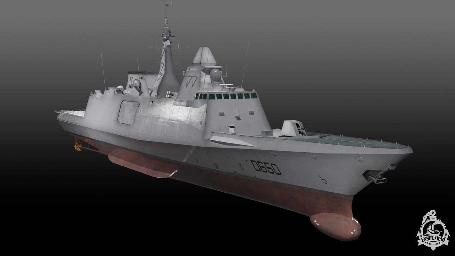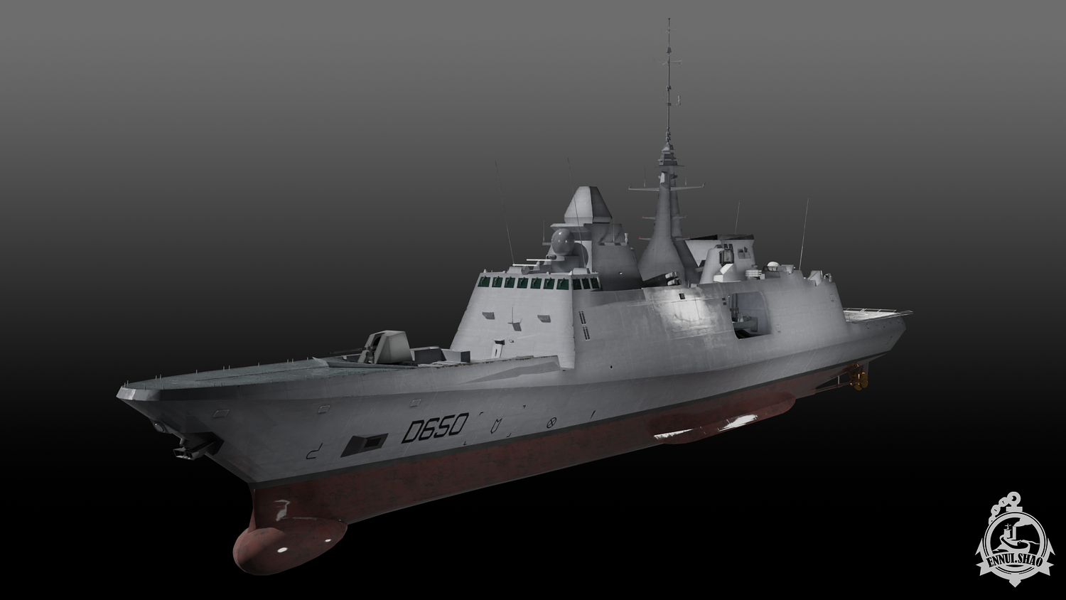 French navy FREMM class frigate FS Aquitaine. 14 textures used including three 8K main textures. PBR material. The model has 7 named objects and is game ready. Overlapped uvs are only for some repeated objects. There is a mask texture used for the rust edge effect. All textures has already contained in blend file. Also the texture pack is separately to be download.