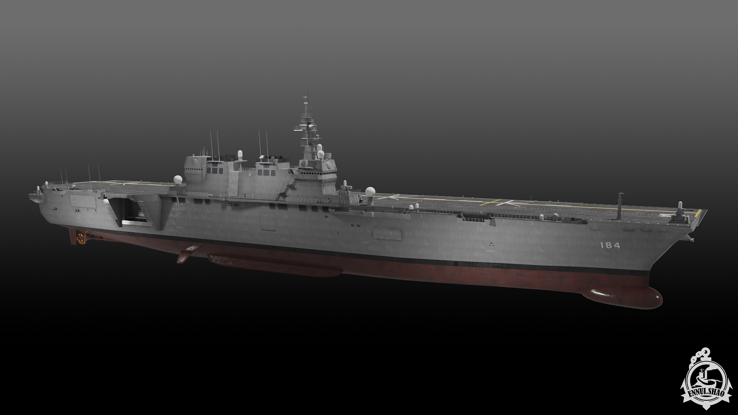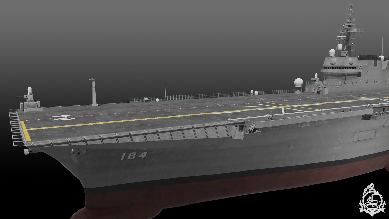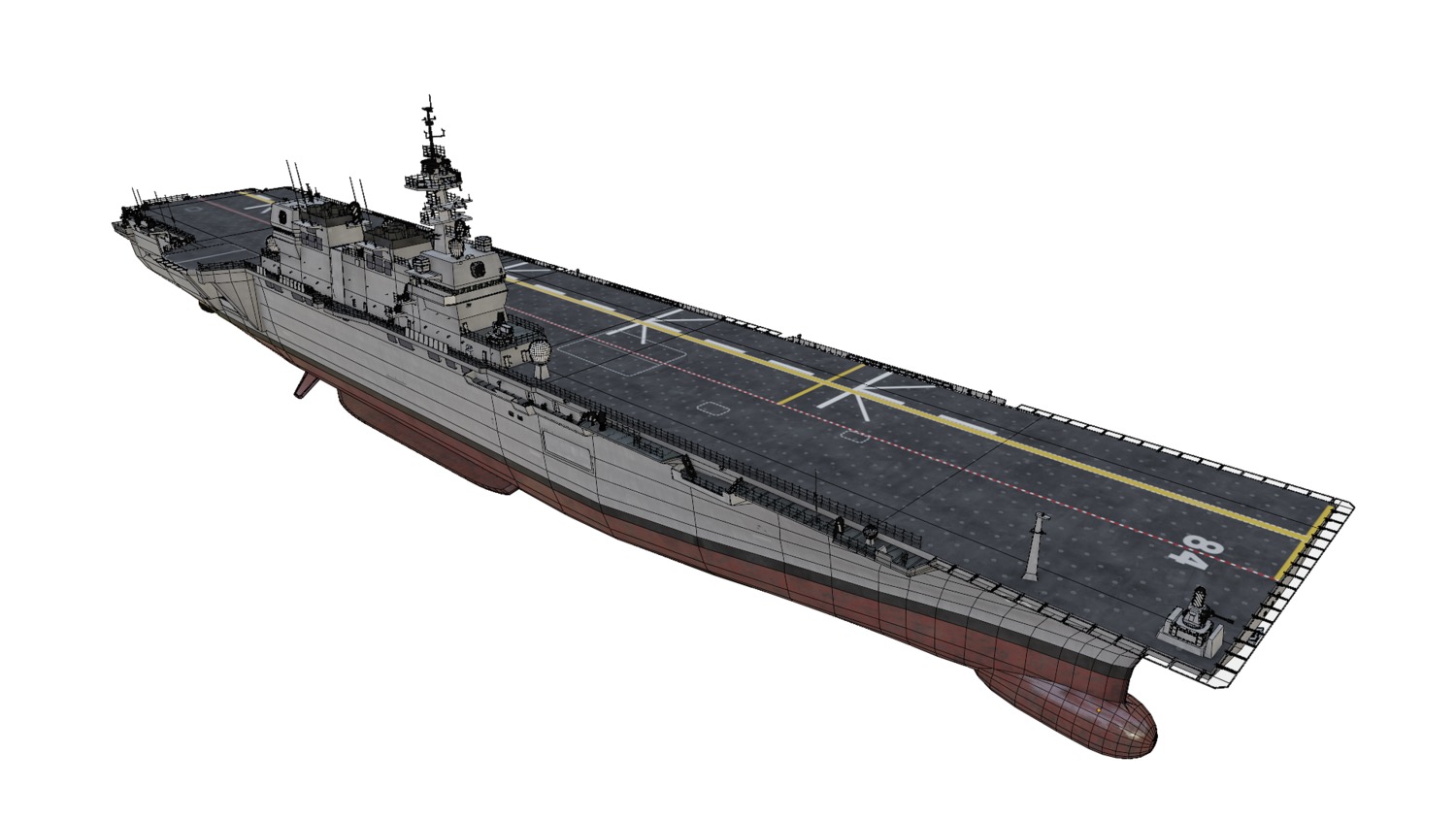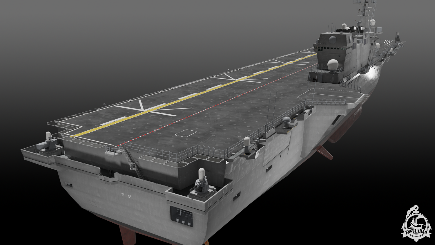 Japan maritime self-defence-force navy modern warship helicopter carrier DDH-184 Kaga (After modified version which have capablilty to operate F-35B). Modeled with Blender 3.3, 28 textures used, PBR materials. UV mapped for main body (material "hull" and "deck"), FBX and OBJ format supported.