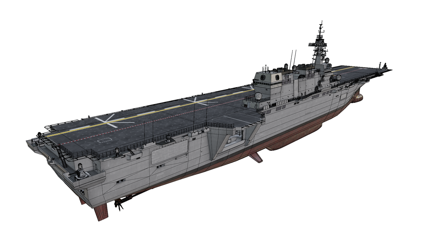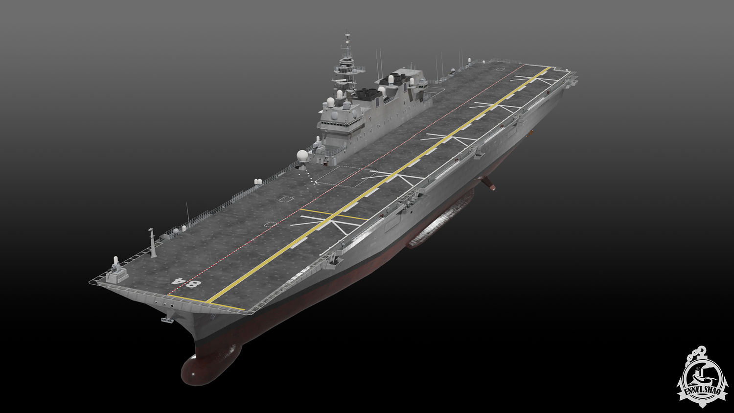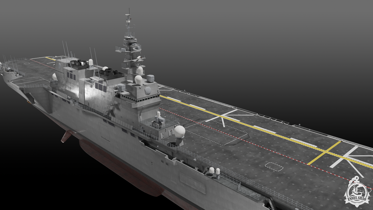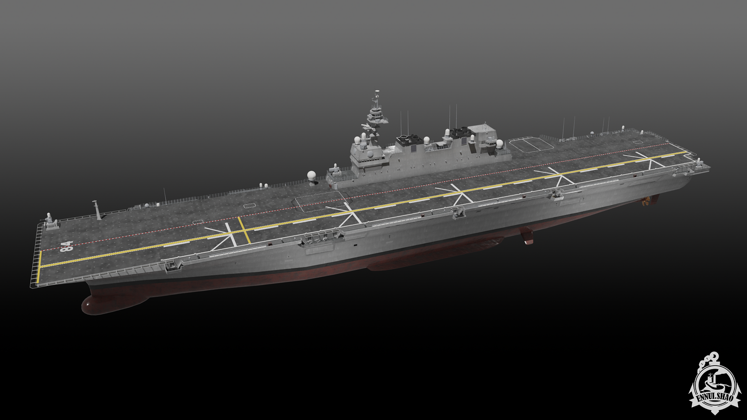 Japan maritime self-defence-force navy modern warship helicopter carrier DDH-184 Kaga (After modified version which have capablilty to operate F-35B). Modeled with Blender 3.3, 28 textures used, PBR materials. UV mapped for main body (material "hull" and "deck"), FBX and OBJ format supported.