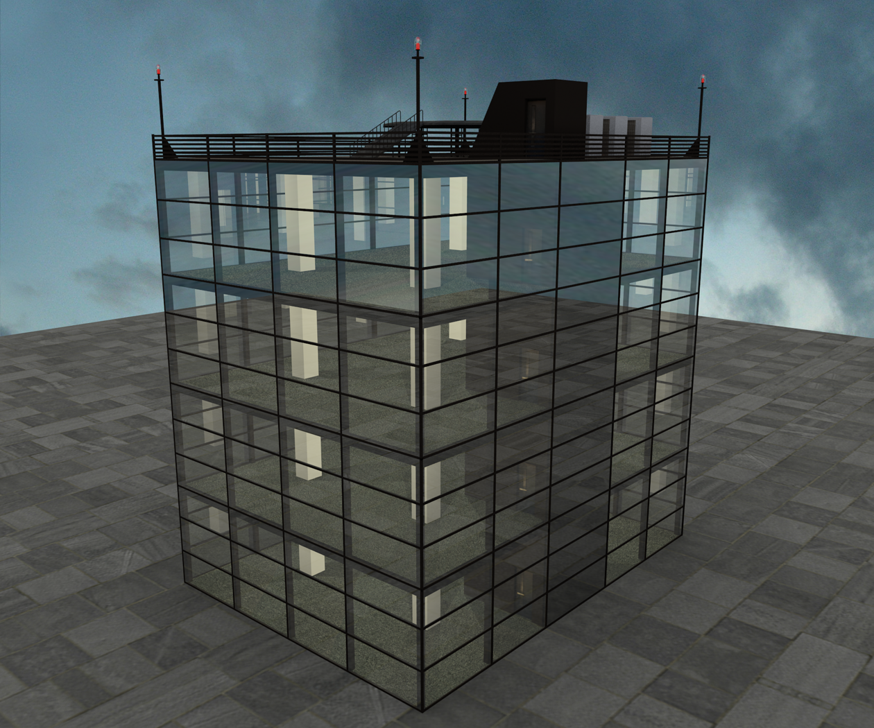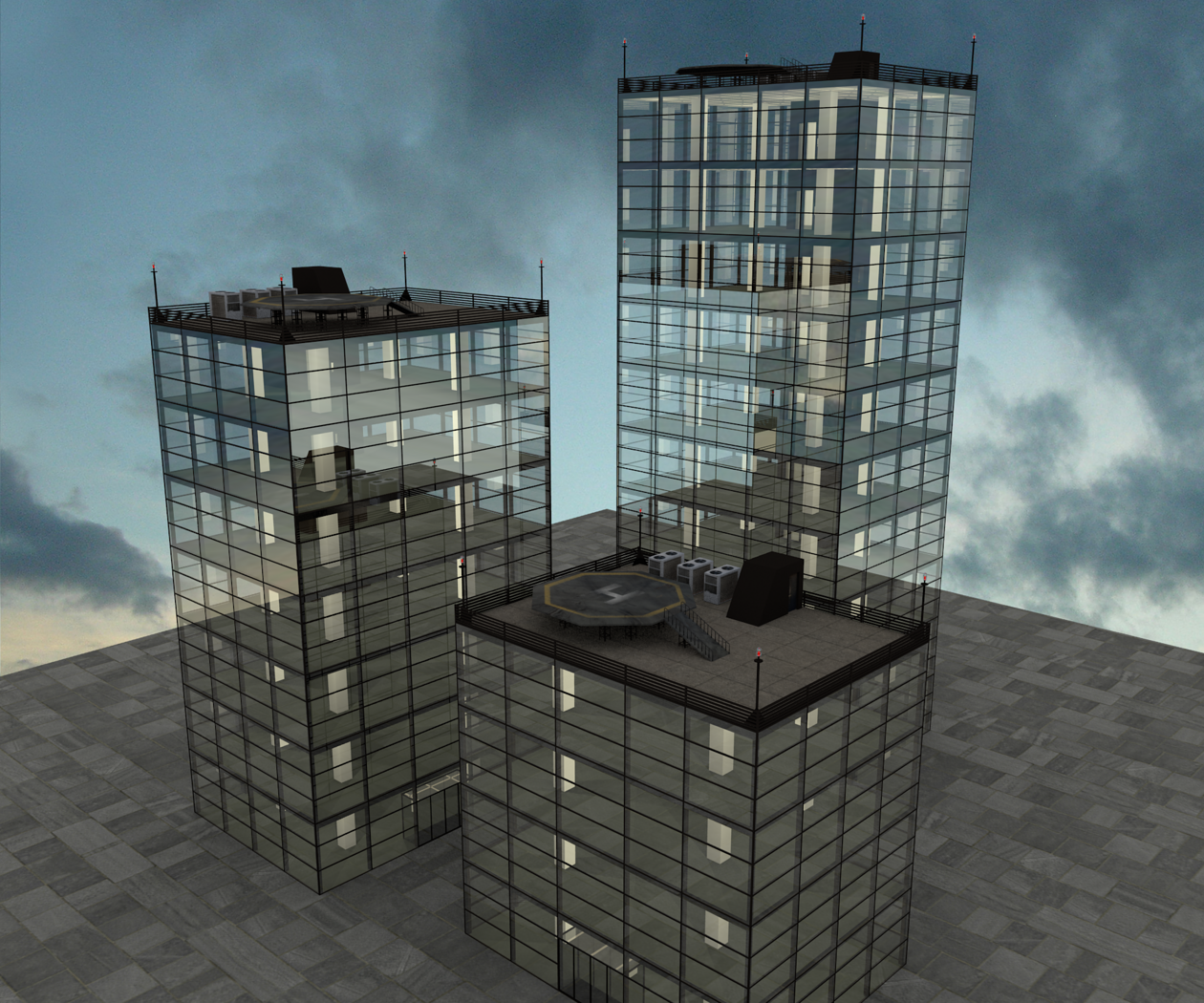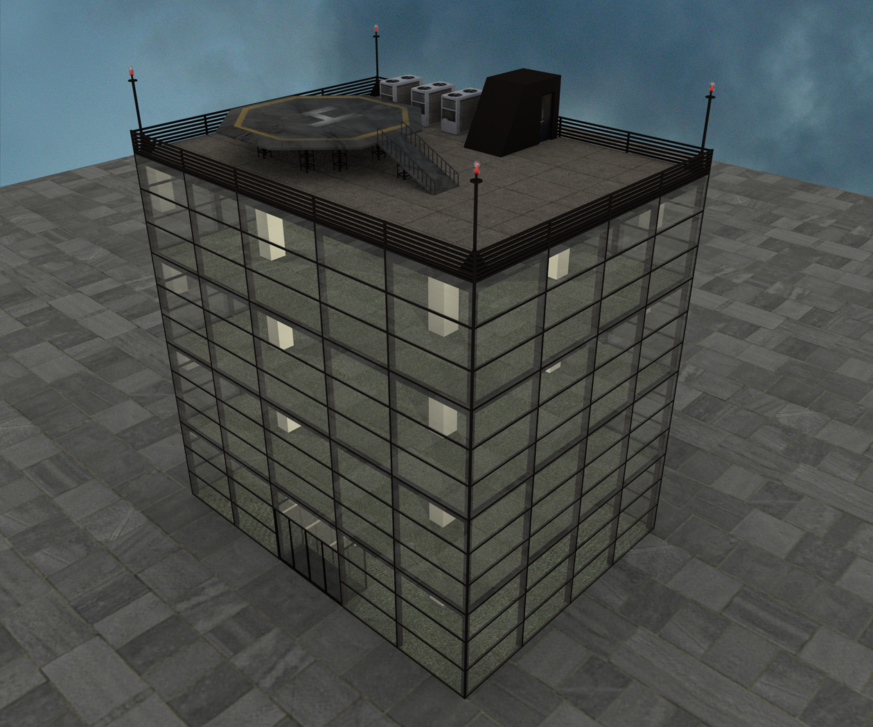 Glass multistorey office building. The number of storey is editable. 14 materials and 5 textures included. All textures are packed into blend file. FBX and OBJ format supported.