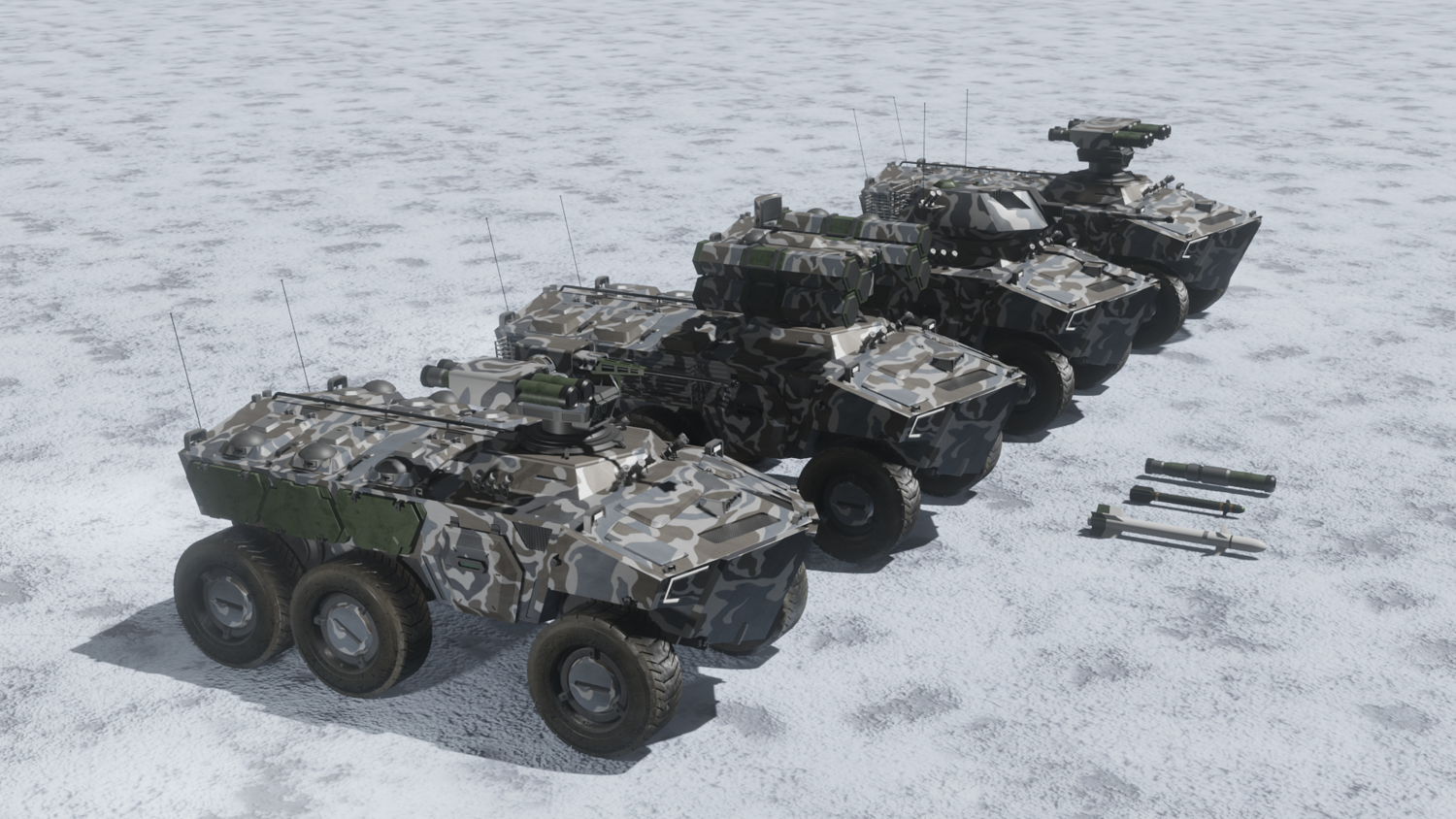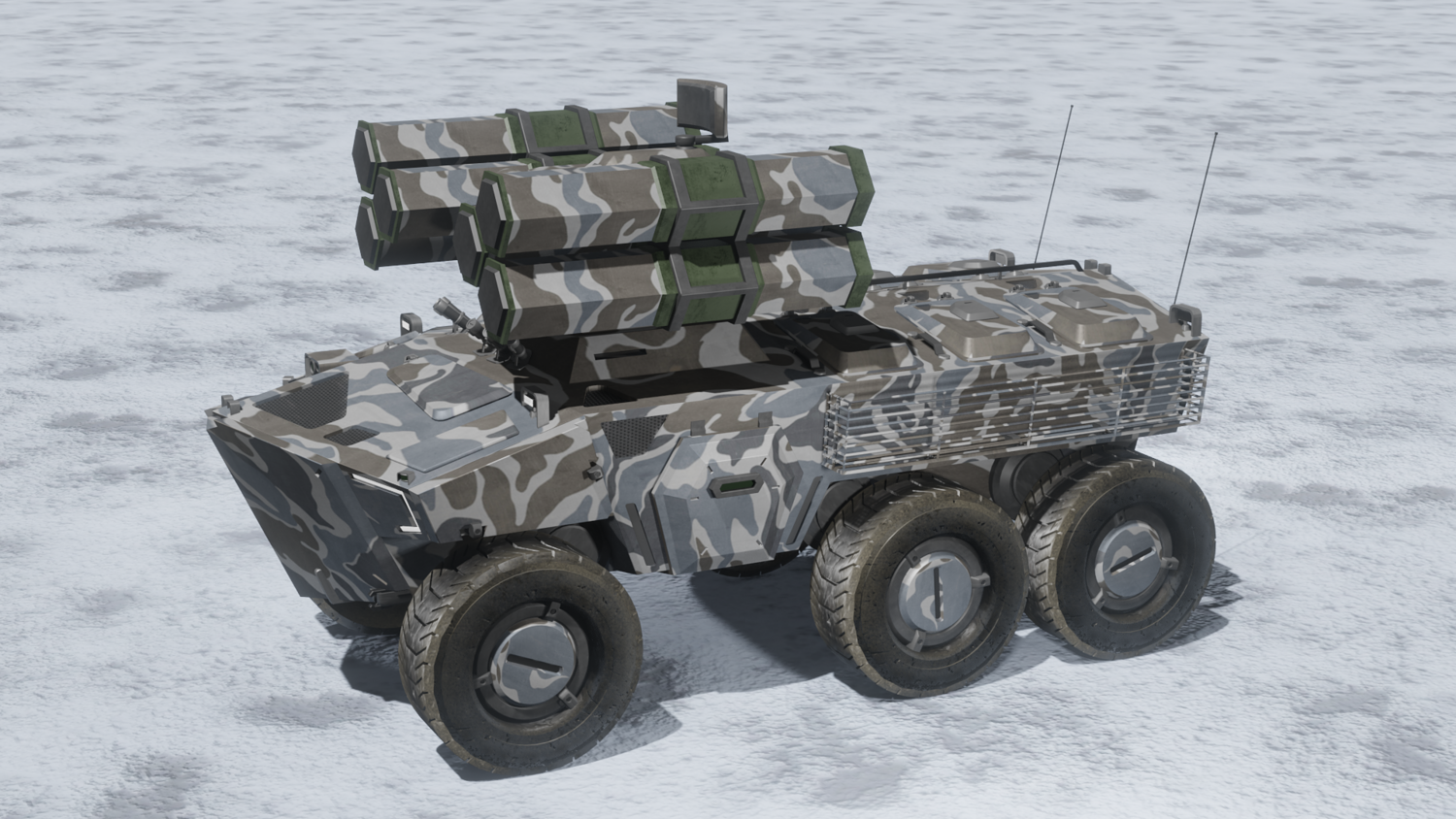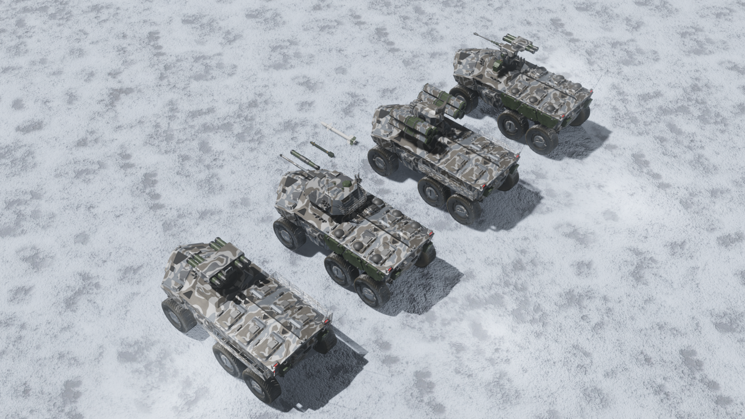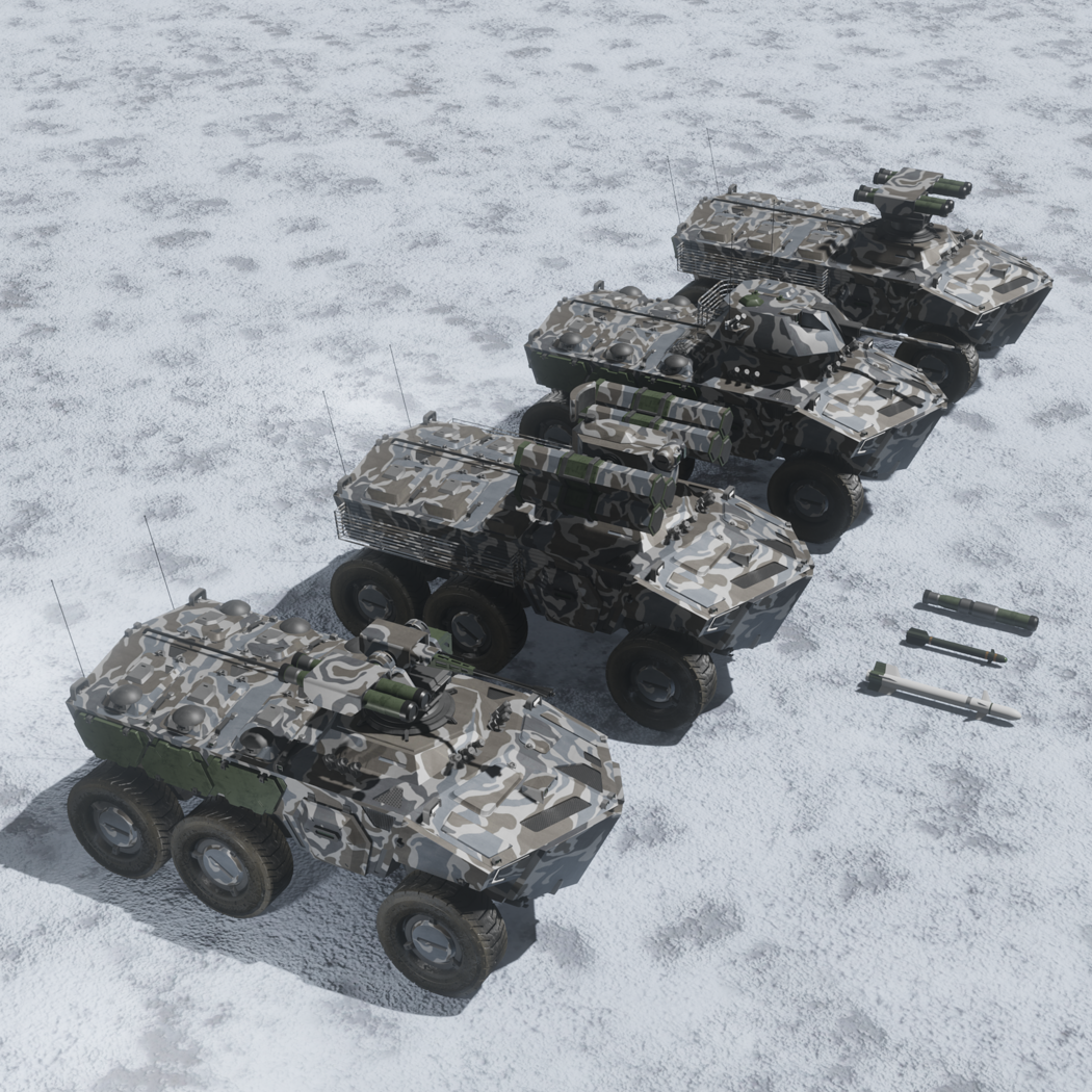 This is a collection of a series variation of fictional apcs with winter camouflage. 4 models included, weapon station turret, sam missile launcher, atgm launcher, manned turret. All textures are packed separatly and also attached into the blend file. Faces and vertices number refers to the max value of a single vehicle.