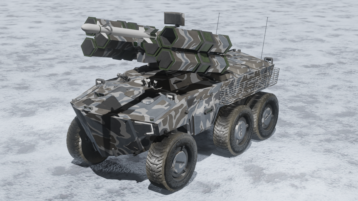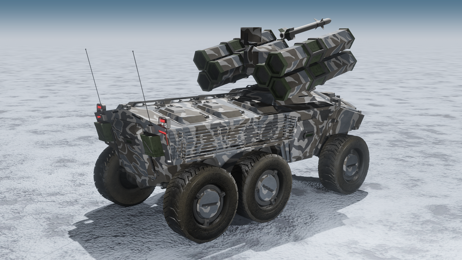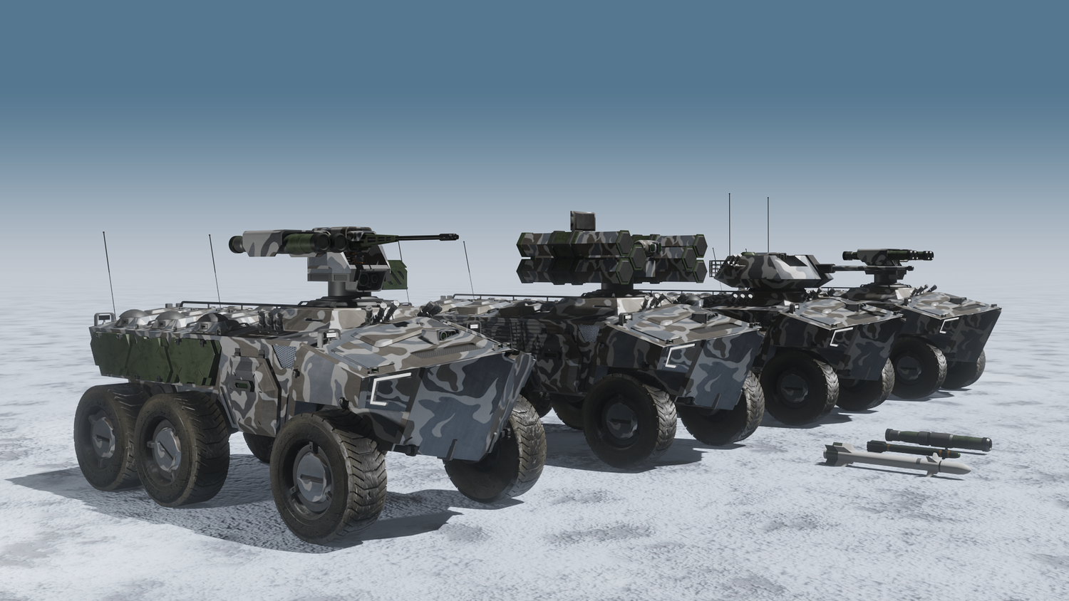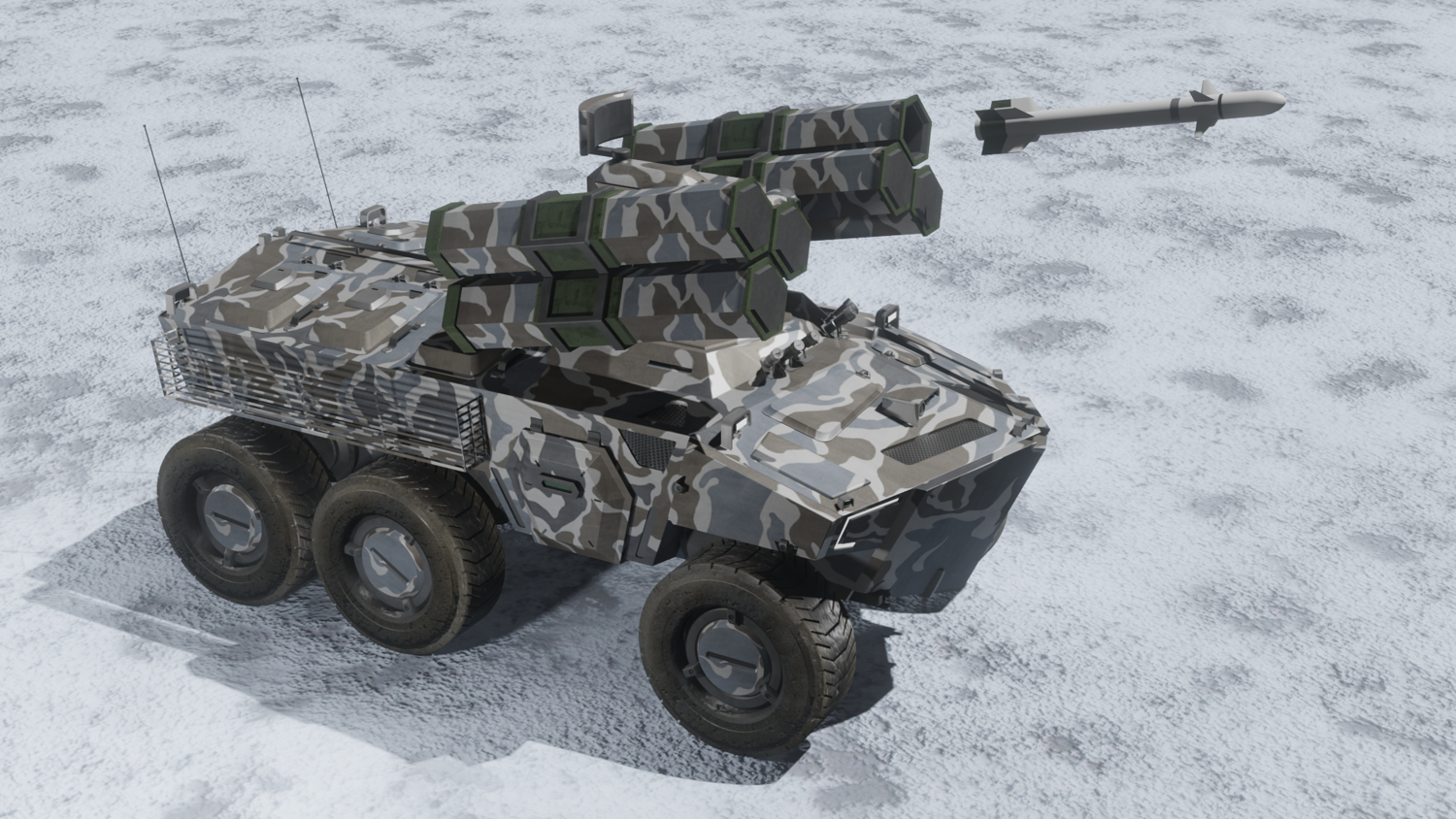 This is a collection of a series variation of fictional apcs with winter camouflage. 4 models included, weapon station turret, sam missile launcher, atgm launcher, manned turret. All textures are packed separatly and also attached into the blend file. Faces and vertices number refers to the max value of a single vehicle.
