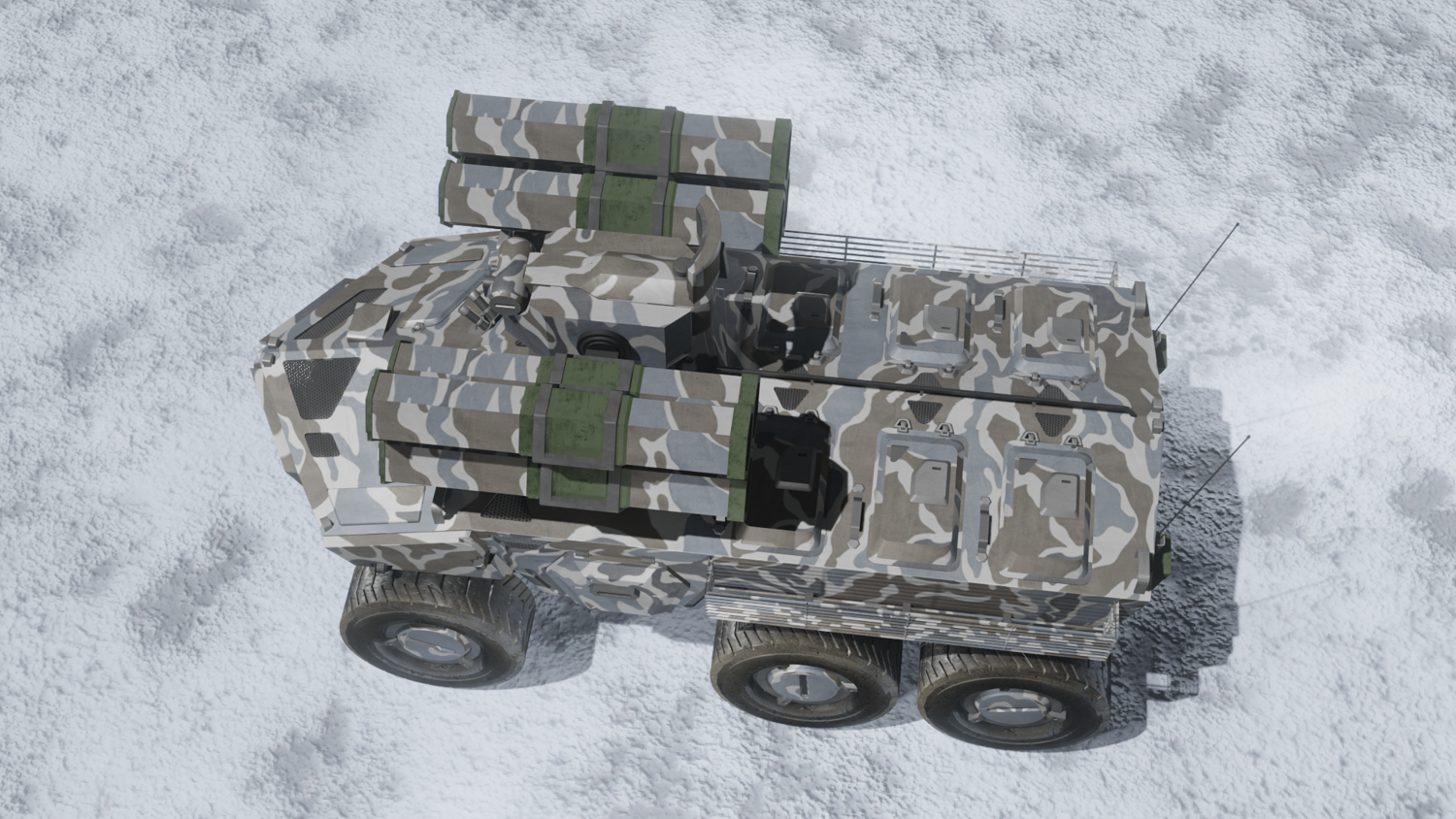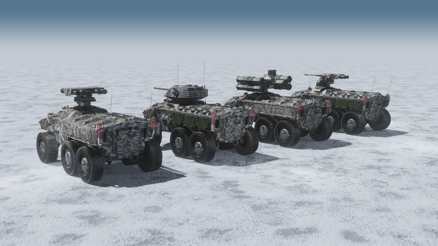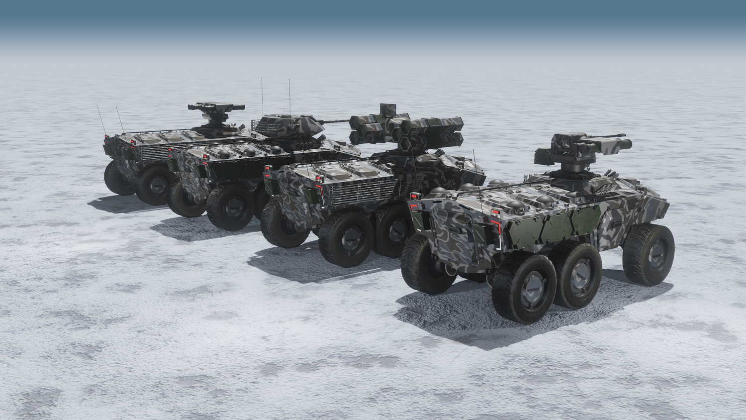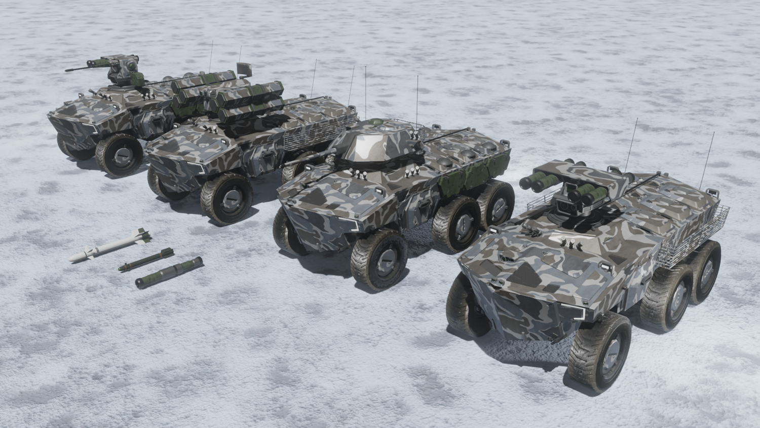 This is a collection of a series variation of fictional apcs with winter camouflage. 4 models included, weapon station turret, sam missile launcher, atgm launcher, manned turret. All textures are packed separatly and also attached into the blend file. Faces and vertices number refers to the max value of a single vehicle.