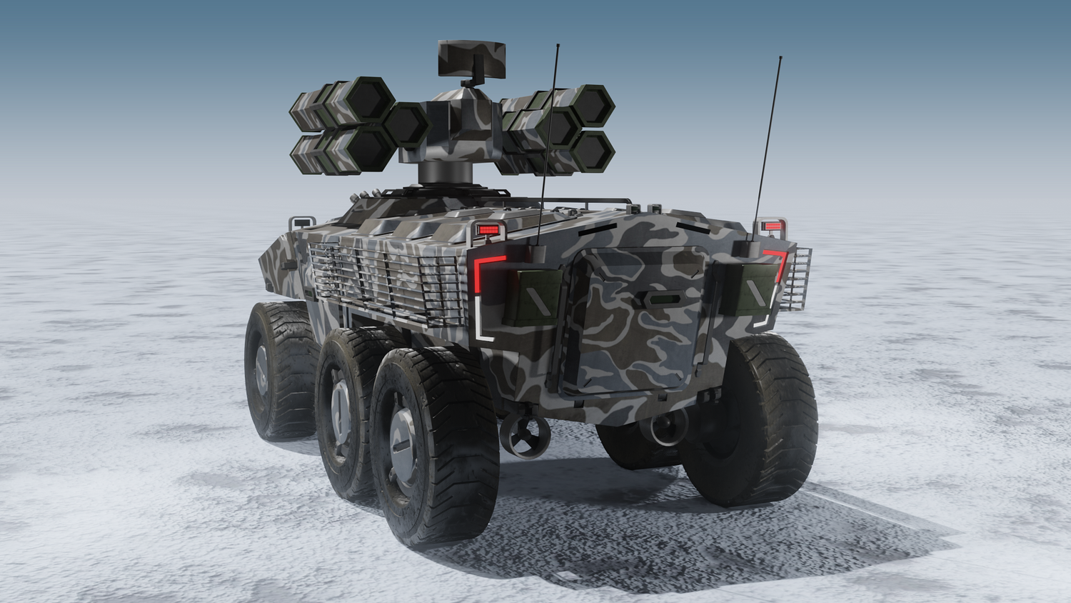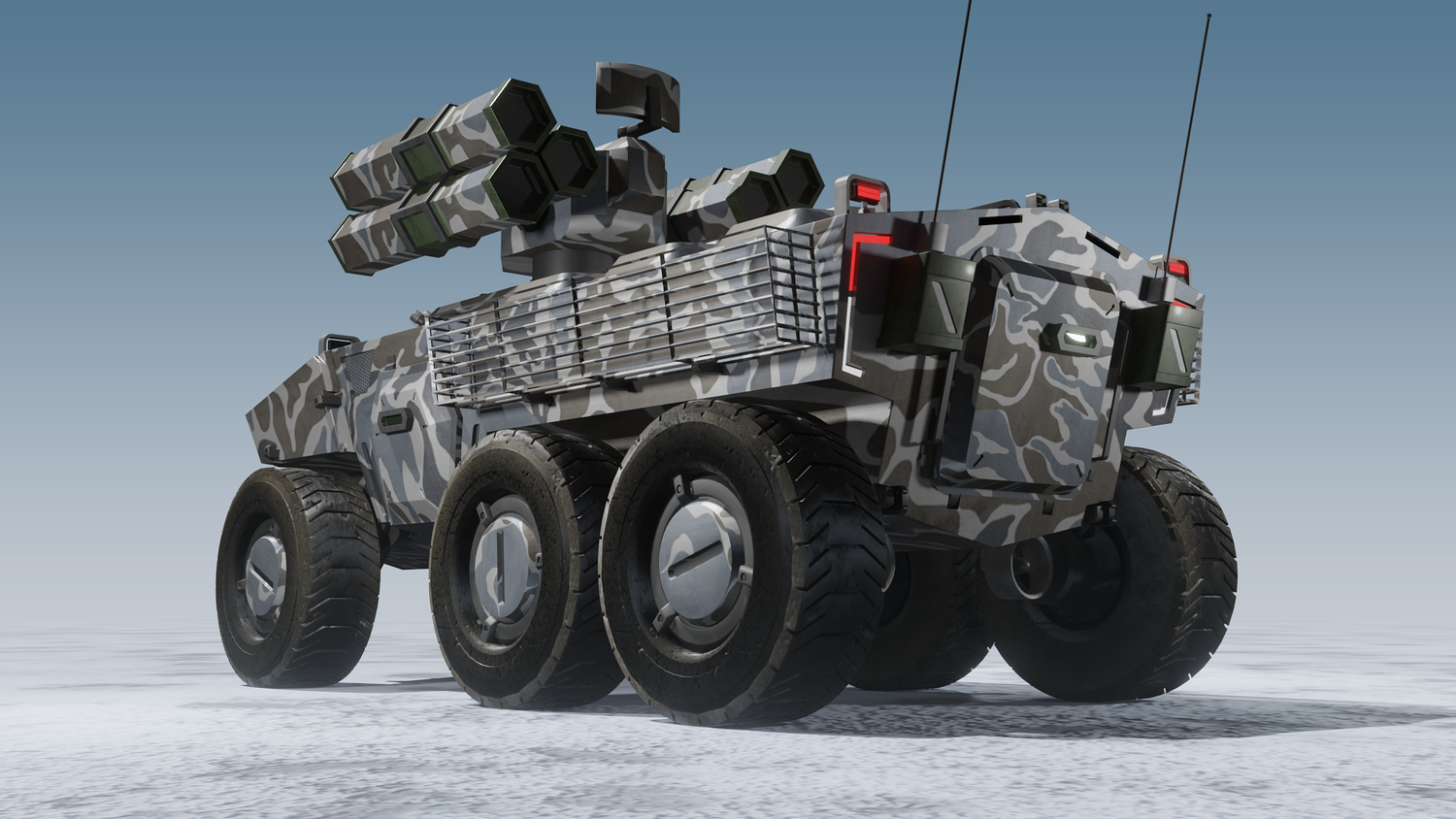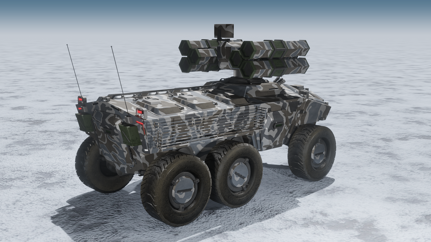 Scifi SAM launcher vehicle winter camouflage
