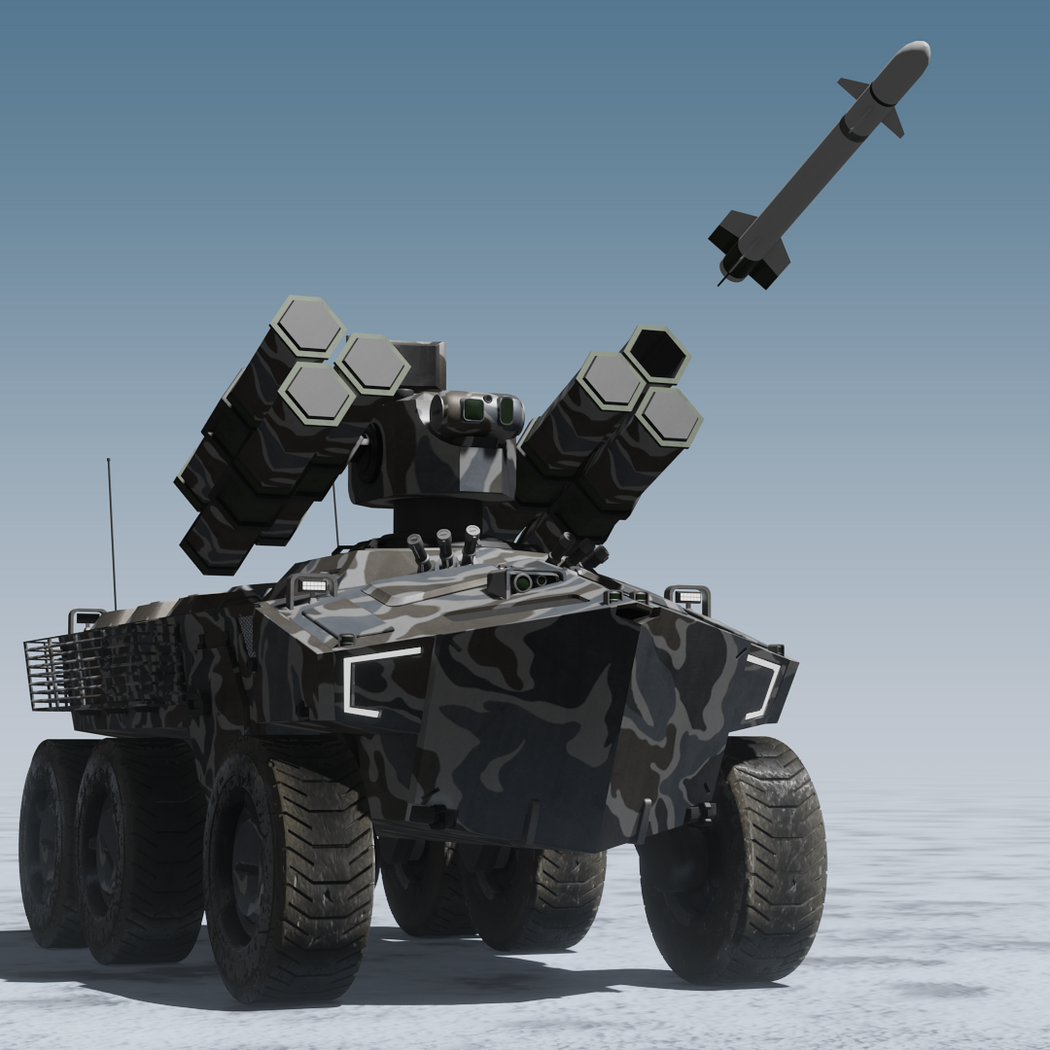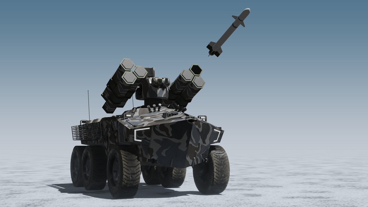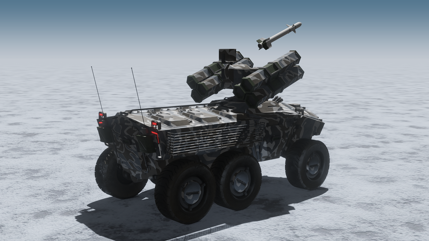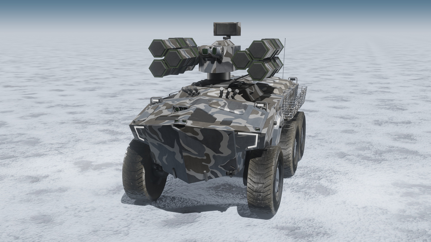 Scifi SAM launcher vehicle winter camouflage